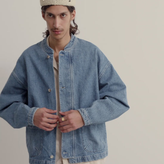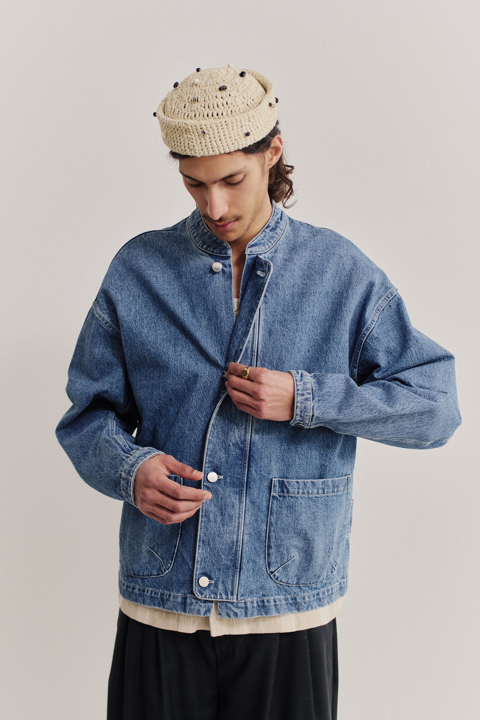 PRODUCT: A returning bestseller, the Jaspal Jacket features a boxy fit, overcut shoulders, a stand-up collar, and spacious front patch pockets. Finishing touches include buttoned cuffs and a back strap detail.