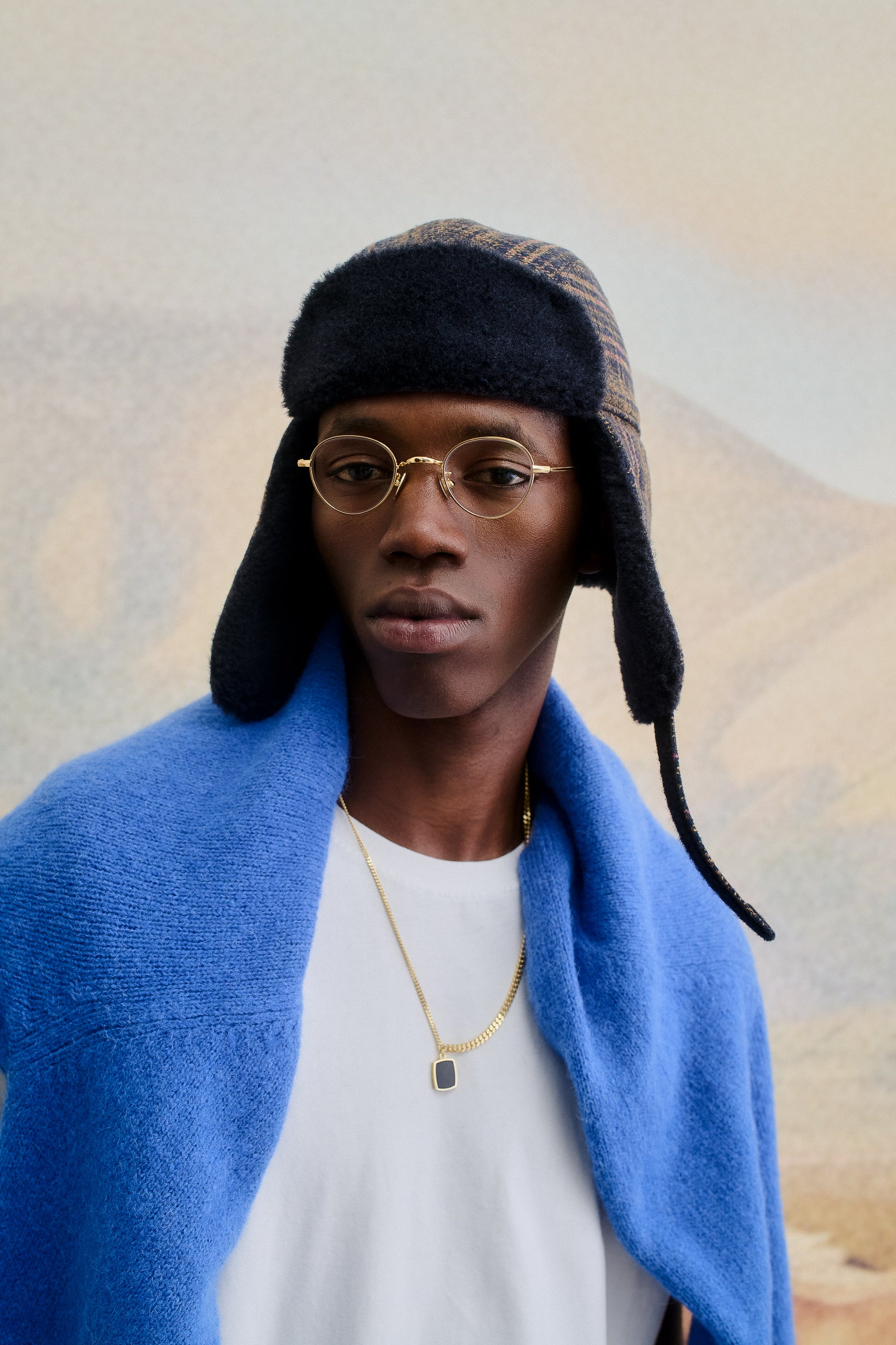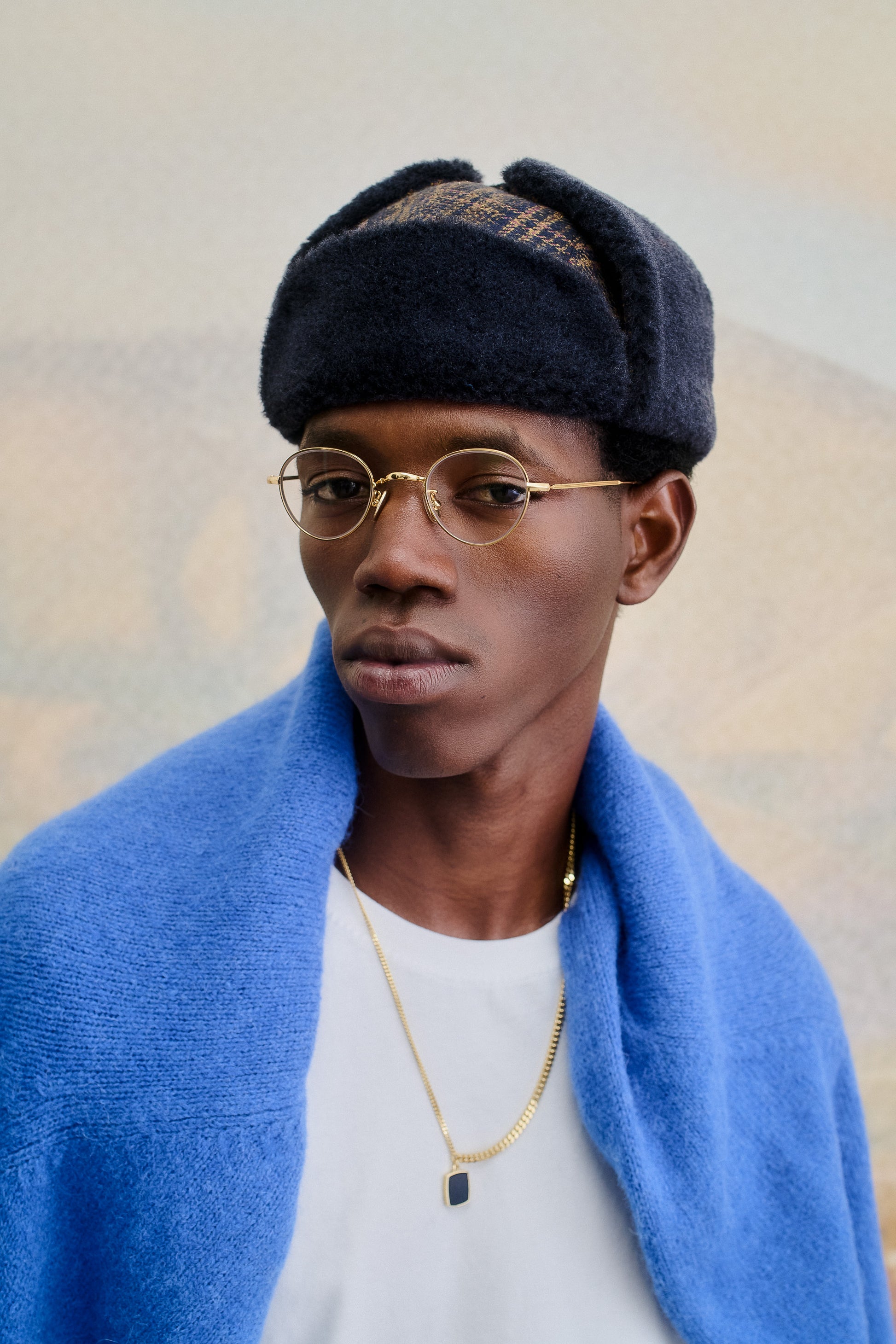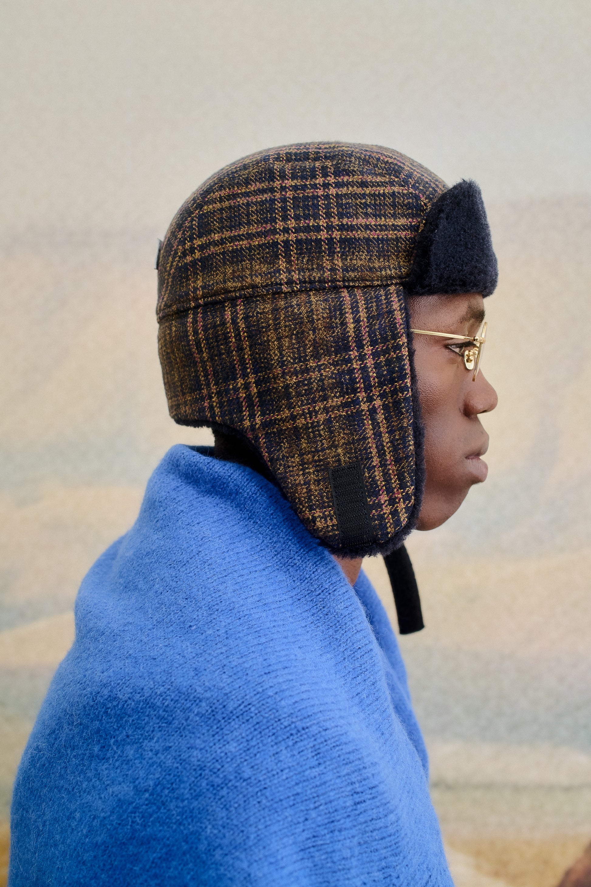 PRODUCT: The Khoni Hat is a shearling-inspired hat, crafted from a blend of Steiff® fabric and woven cotton. It combines softness and structure with foldable side panels secured by velcro.