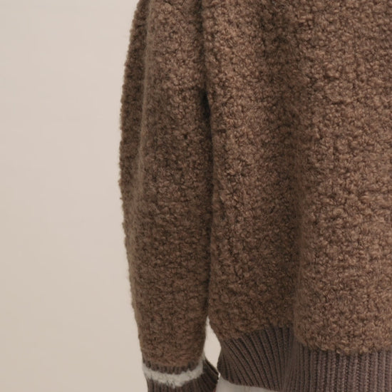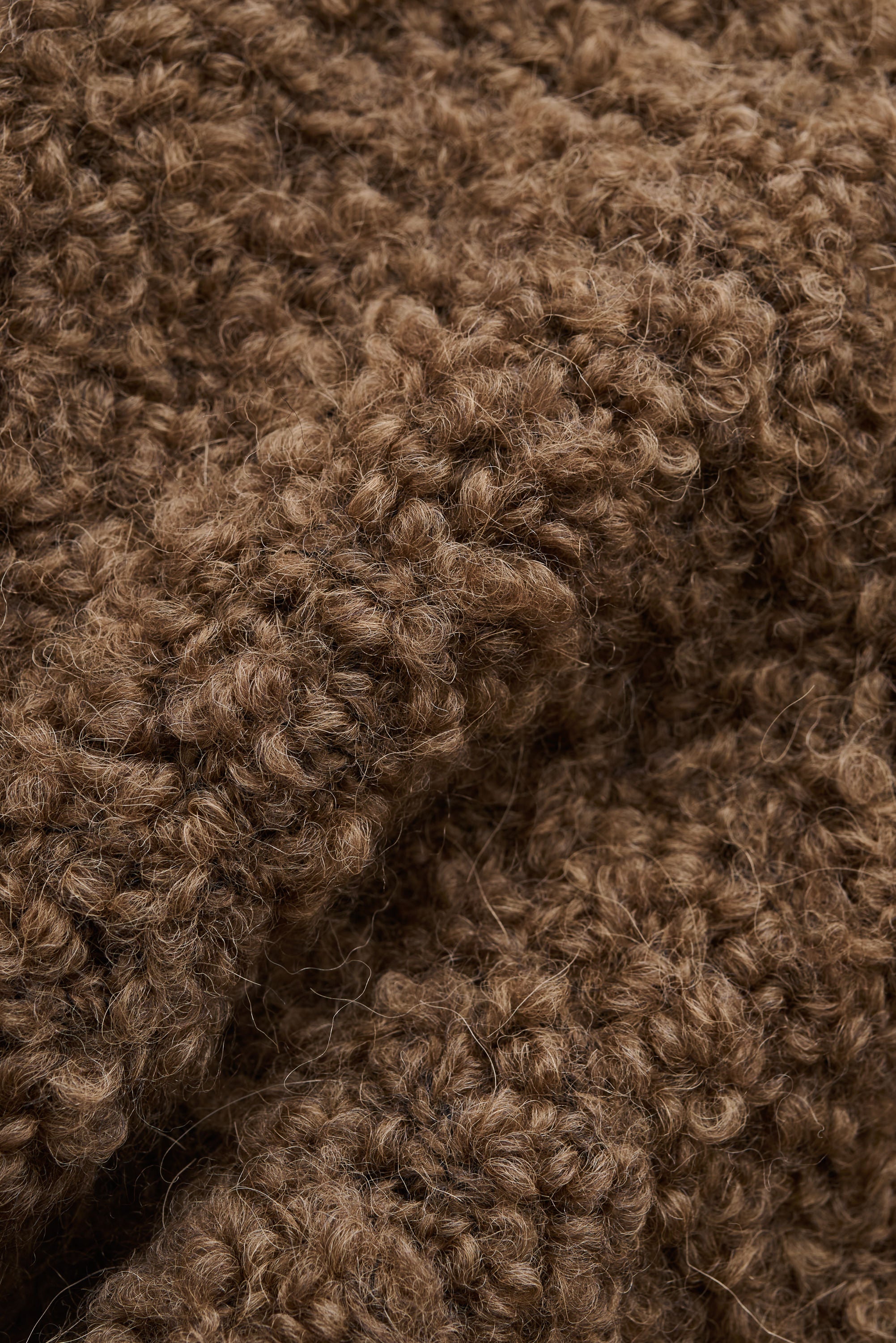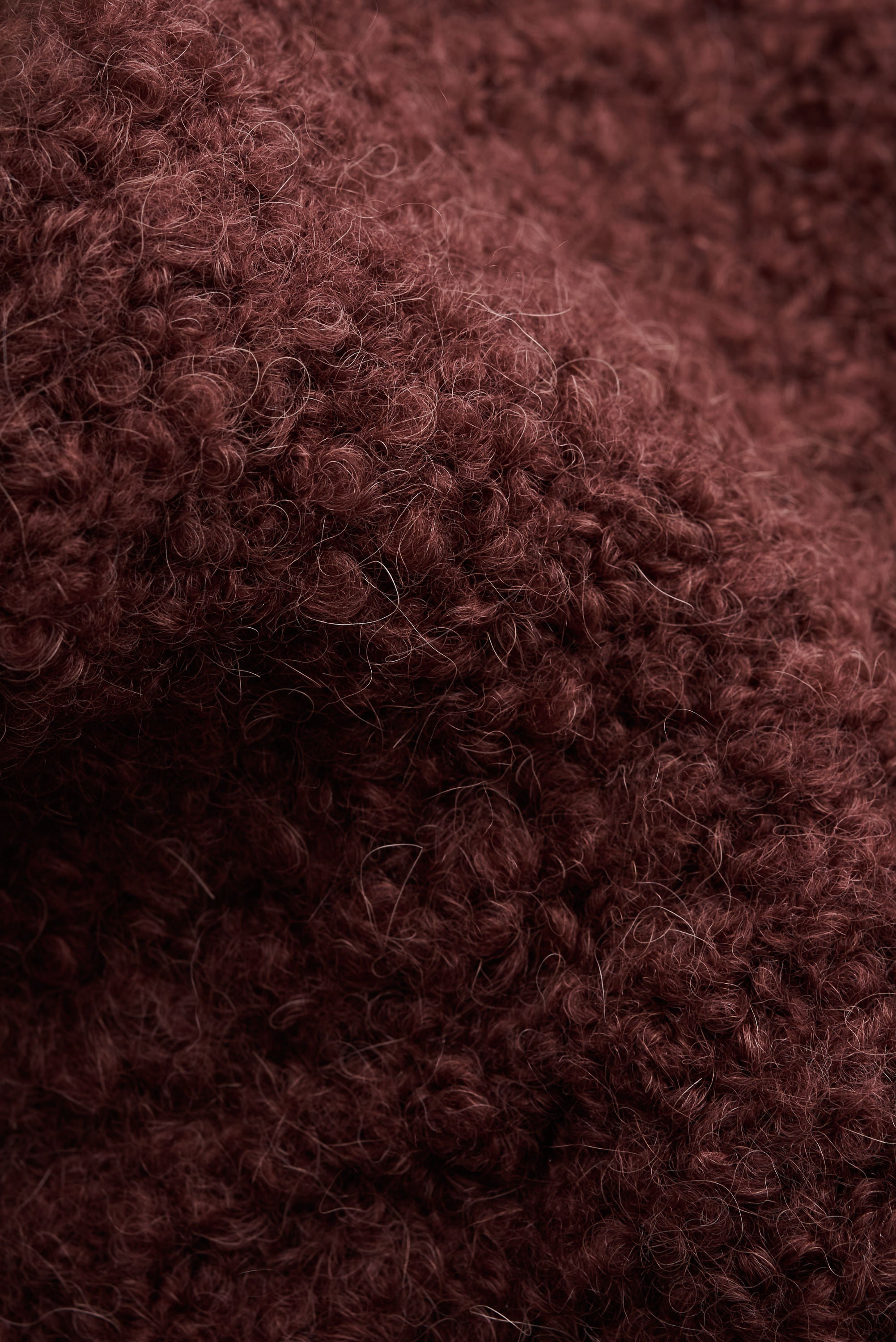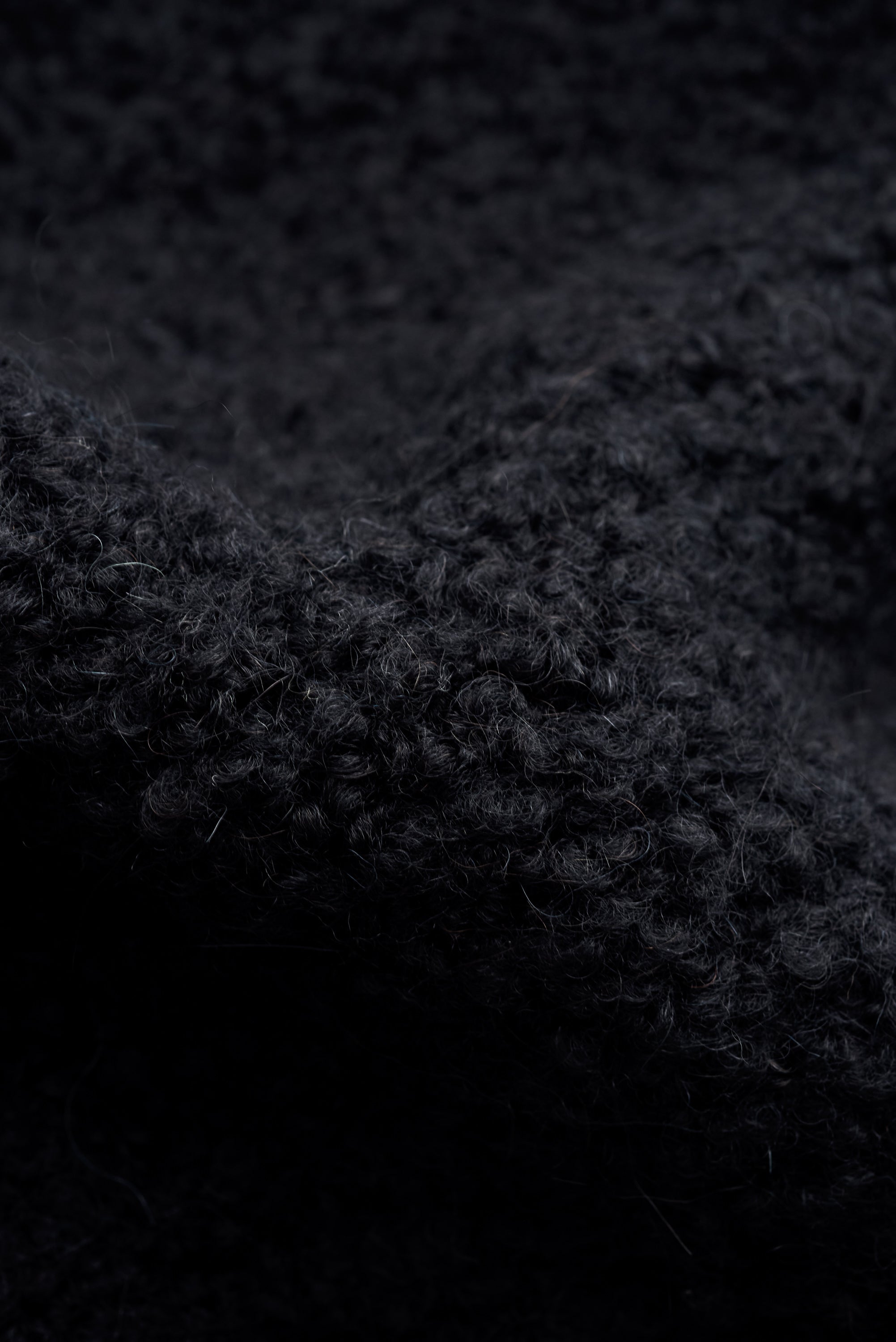 YARN: A bouclé alpaca-blend yarn with a structured surface. Features wool for warmth and shape, and alpaca for a soft, hairy halo.