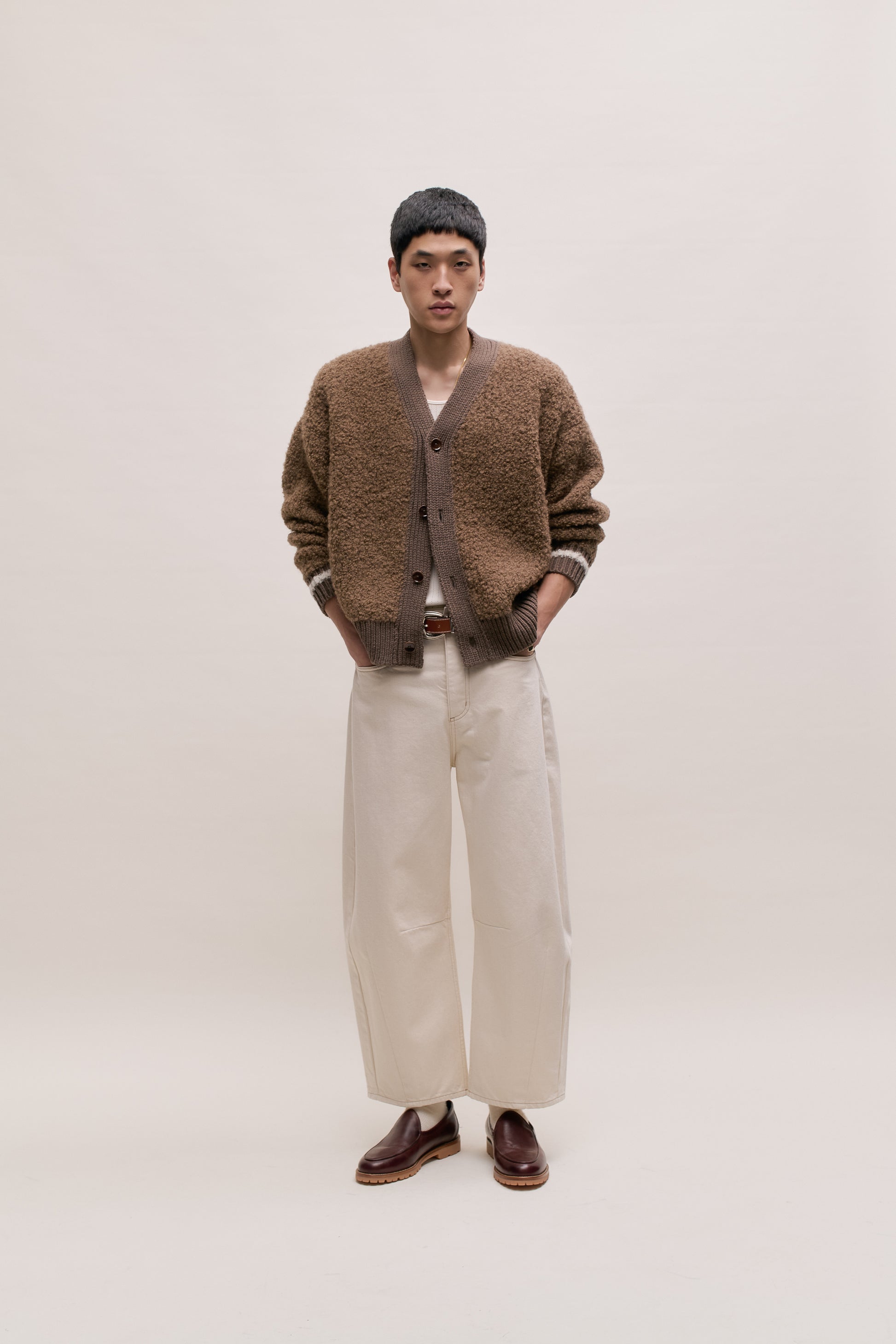 PRODUCT: A boxy, o-shaped cardigan with a mid-height v-neckline, ribbed edges, and ribbed cuffs. Knitted from softly contrasted yarn and buttoned at the front.