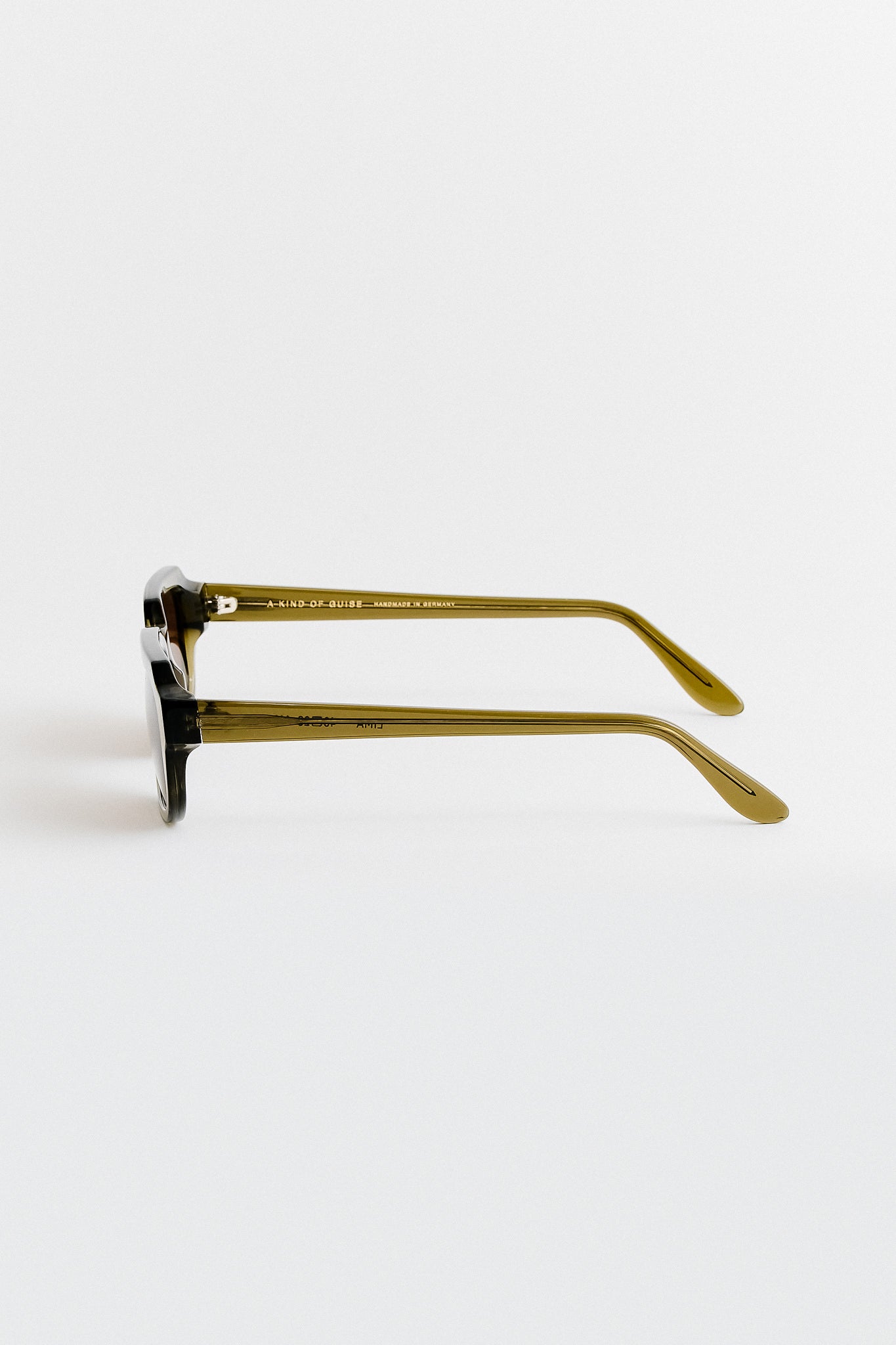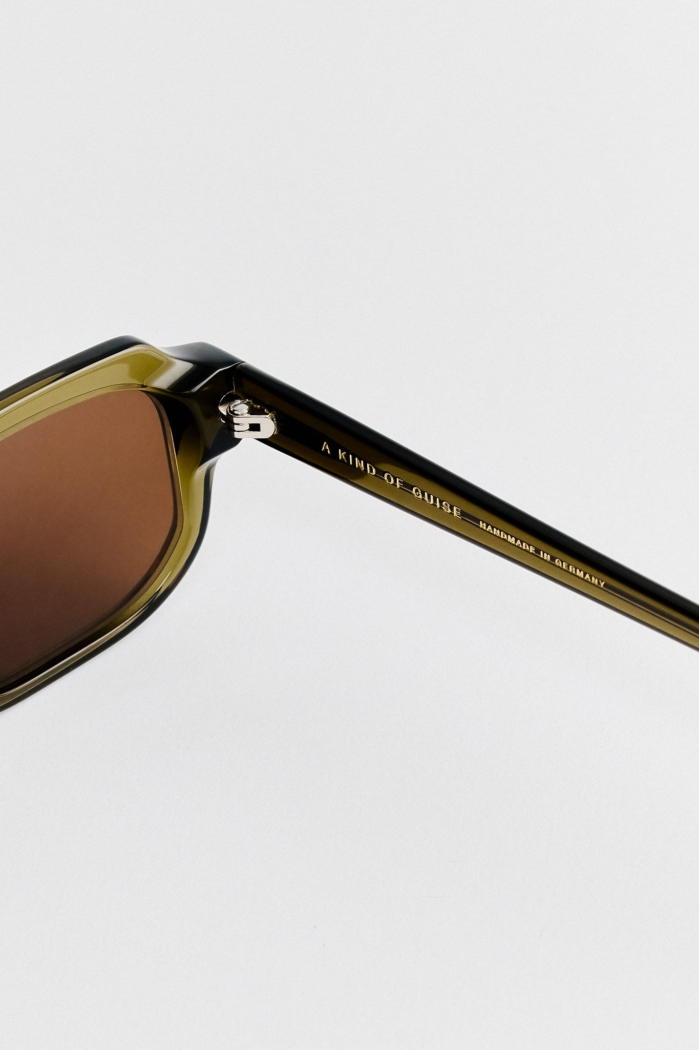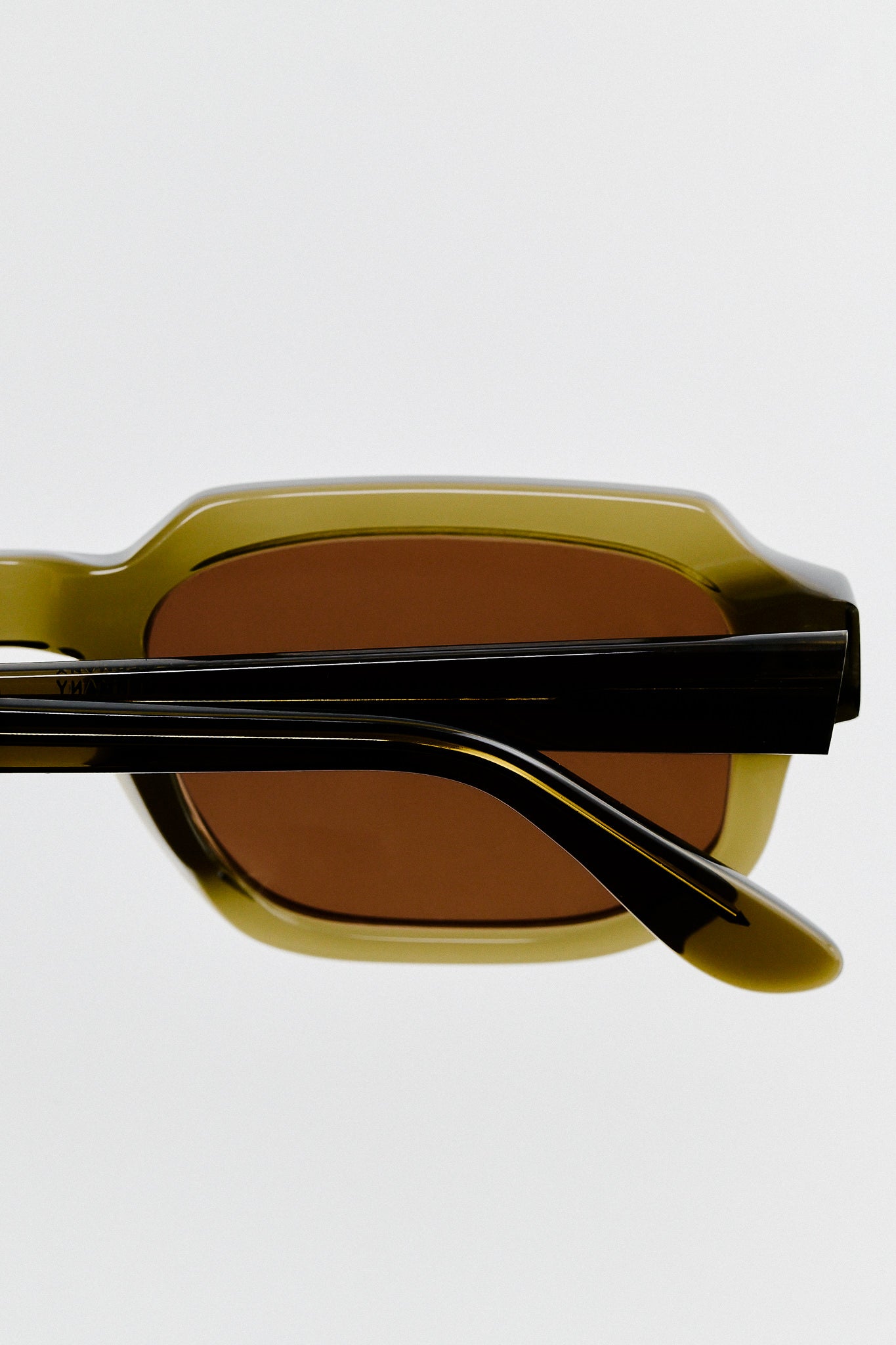 These sunglasses feature a bold, geometric silhouette with a distinct rectangular shape softened by subtly rounded edges. The thick acetate frame has a sculptural quality, especially at the outer corners, where it flares into a slightly angular cut for added dimension. The bridge is gently notched, creating a sleek, architectural line across the brow. Altogether, it's a design that blends vintage references with modern sharpness.