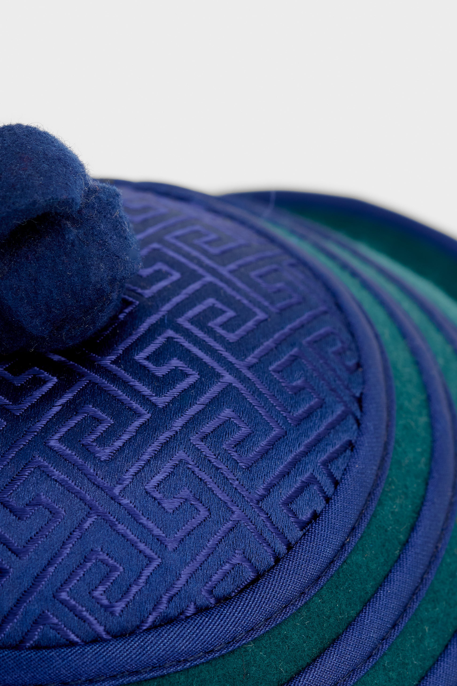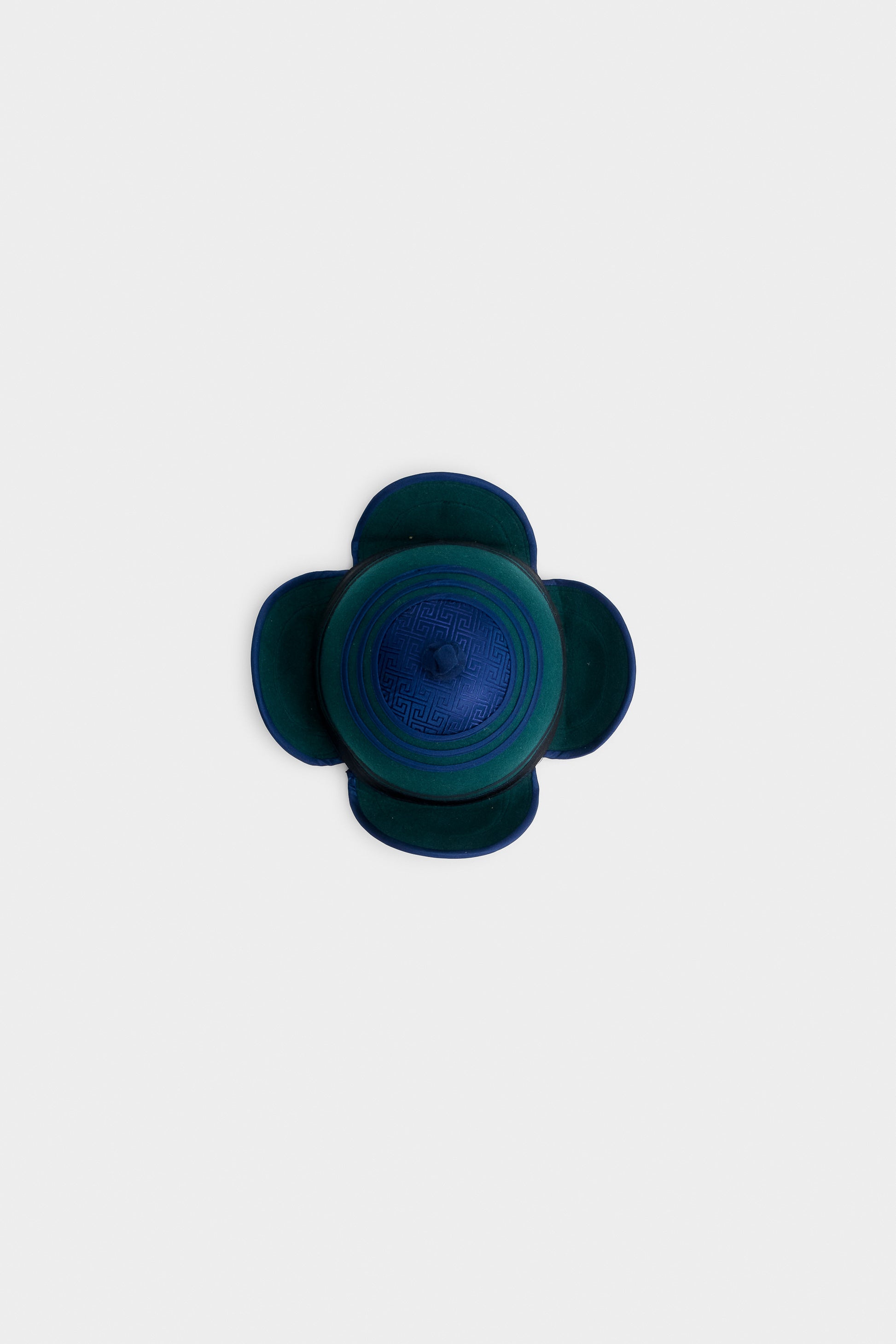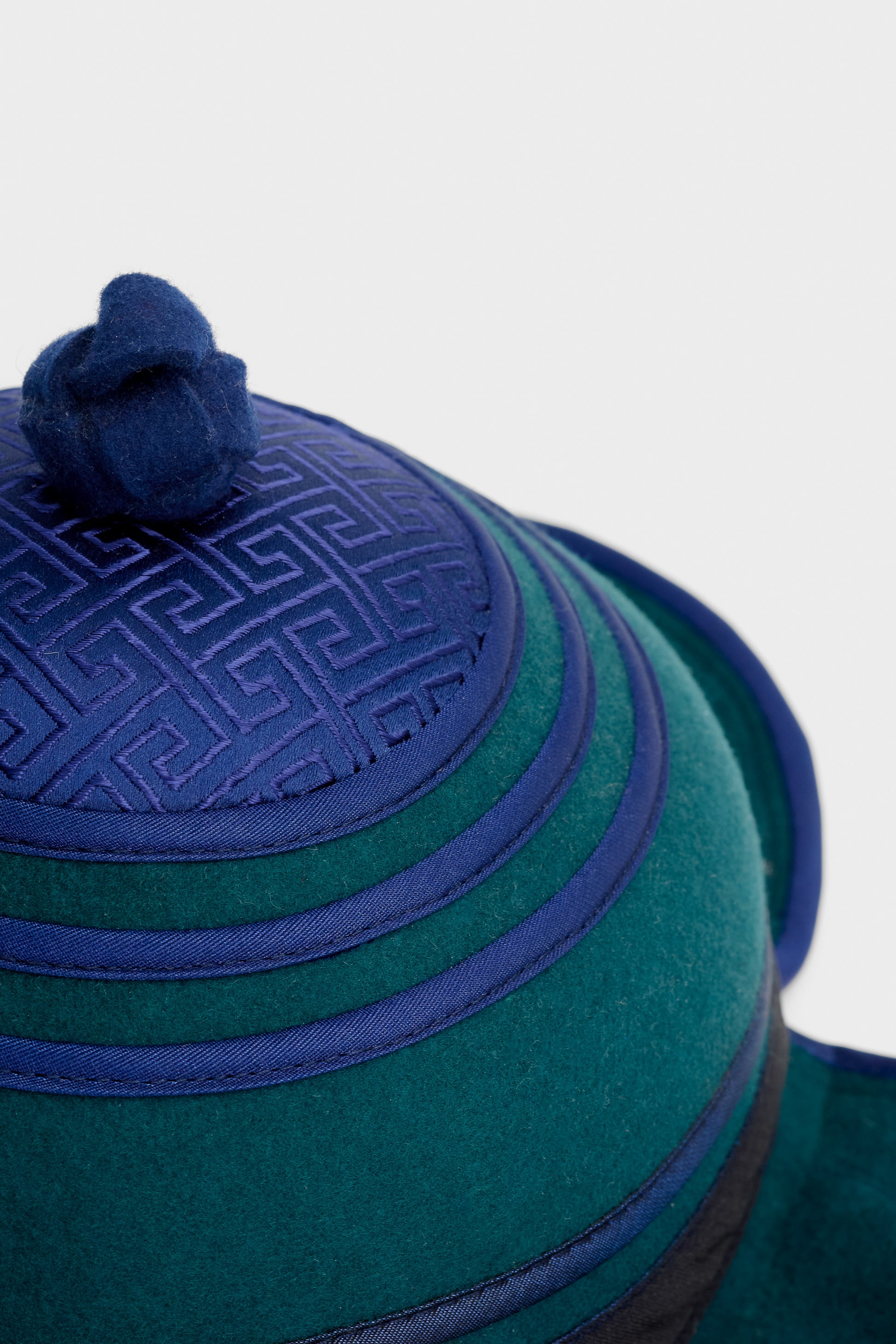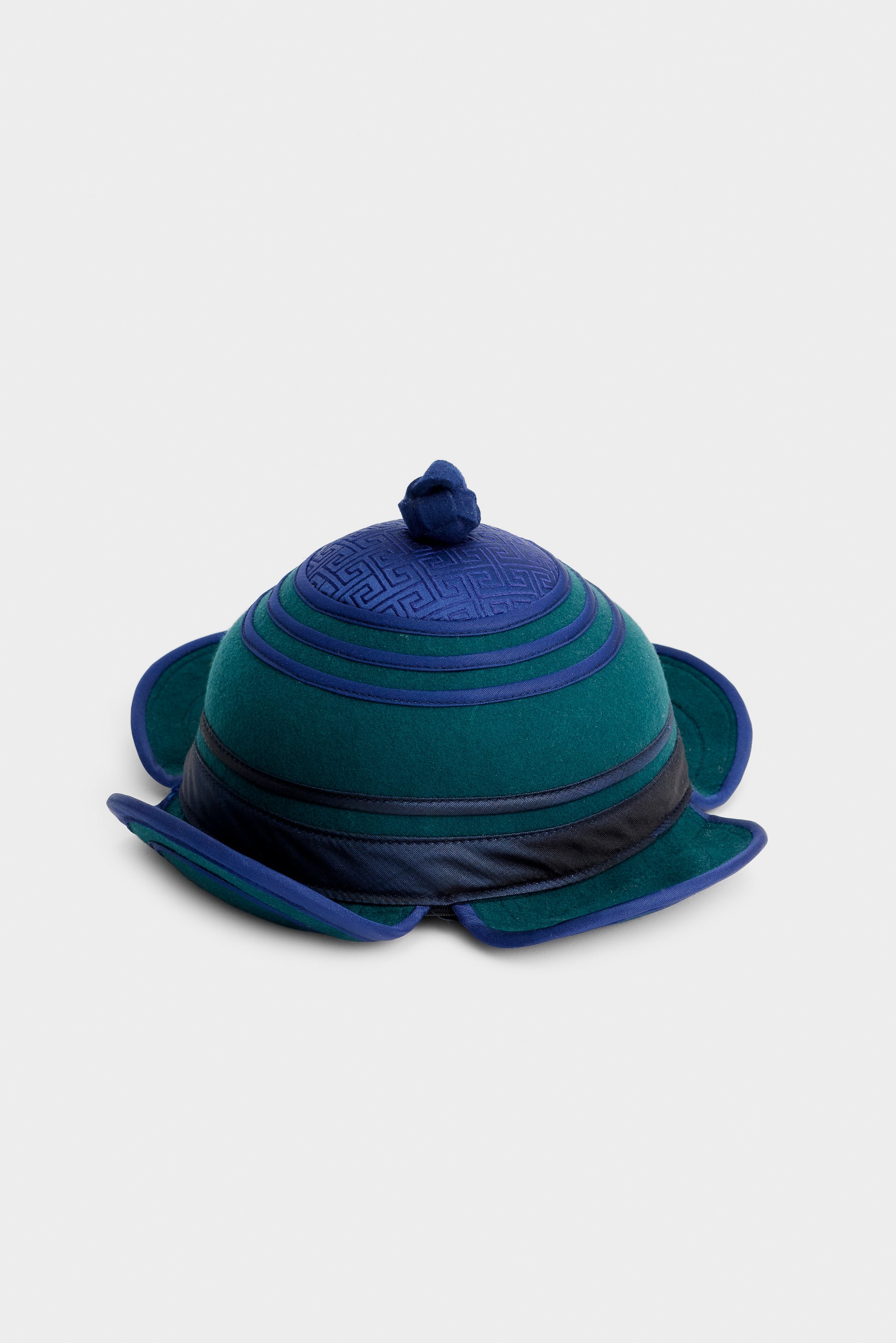 A classic Borg malgai, a traditional Mongolian winter hat once worn by horsemen and travelers across the steppe. Recognized by its rounded dome, petal-shaped flaps, and knotted top, this hat embodie function and cultural identity. The deep green and blue tones with embroidered silk detailing reference historic noble attire.