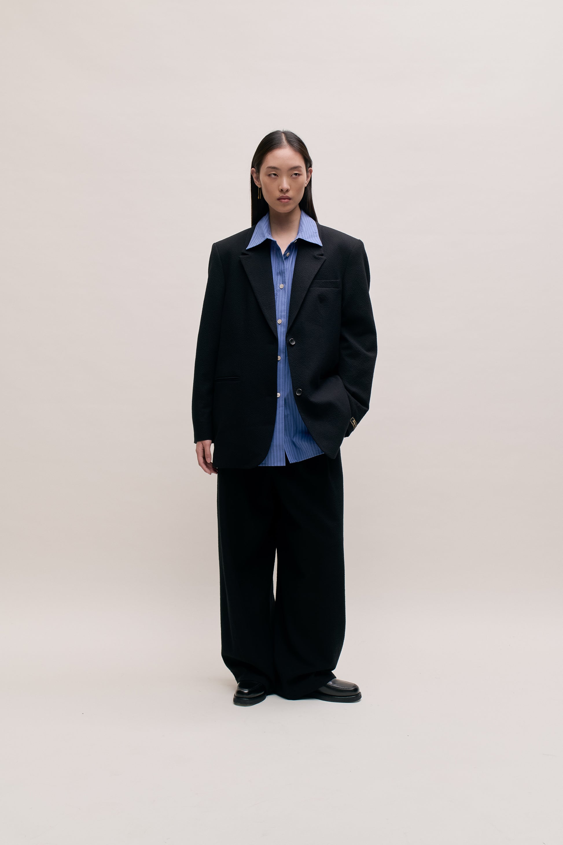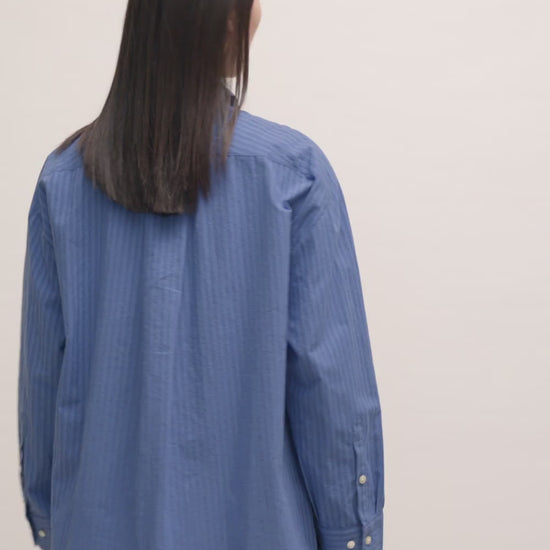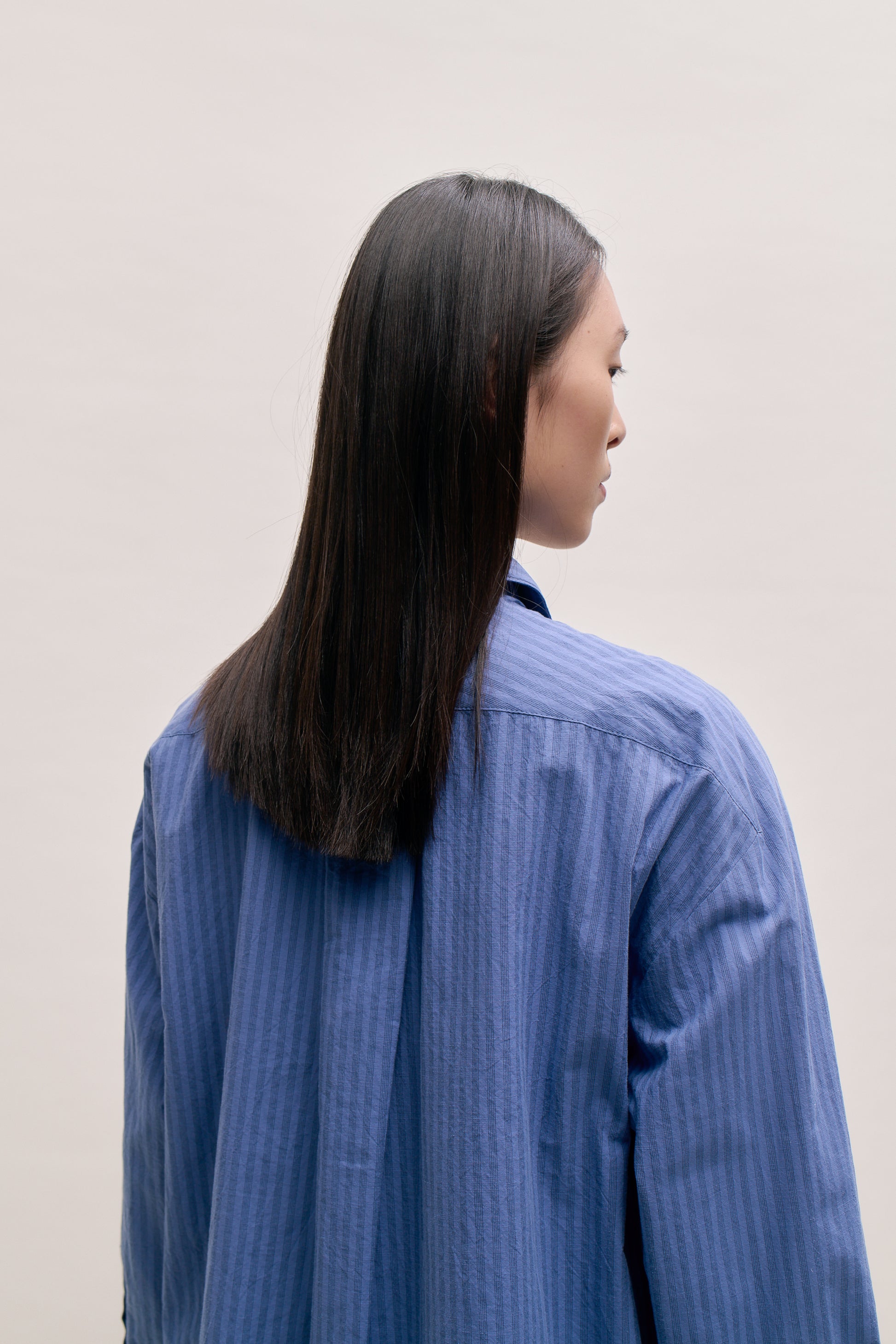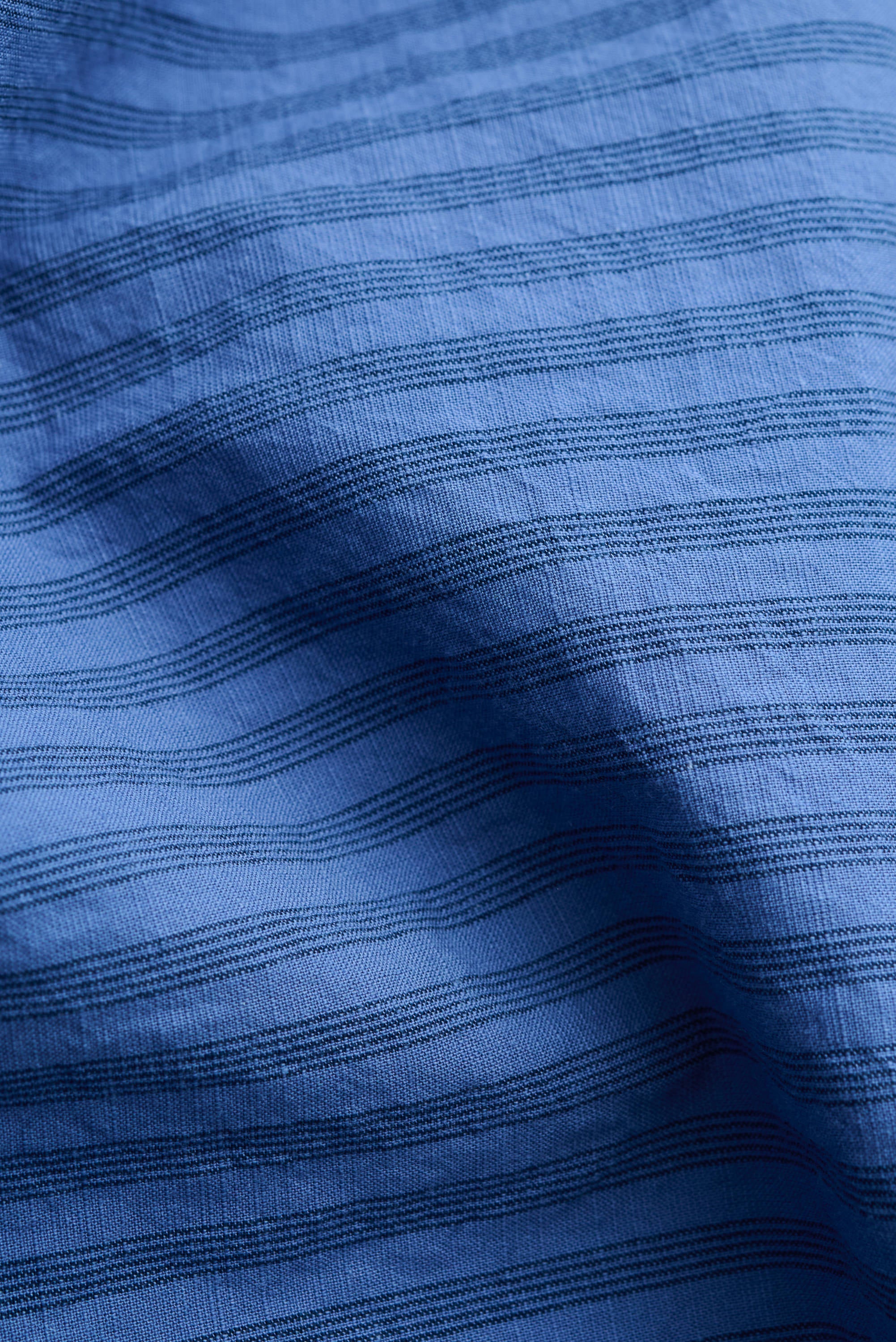 FABRIC: A crisp cotton fabric with a subtle ripple surface and a soft, peached outer side. The striped pattern introduces a clean, linear rhythm with a contemporary feel.
