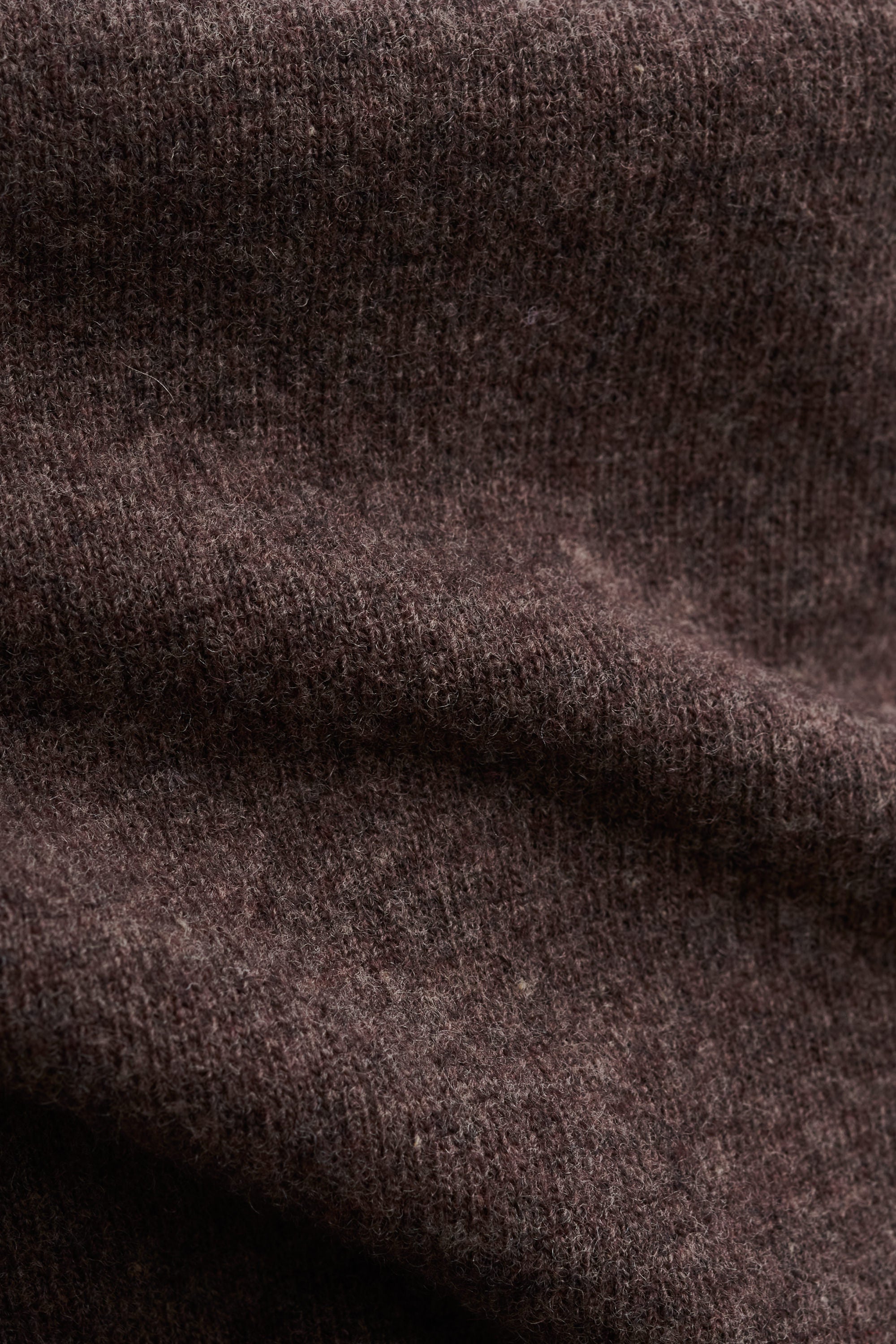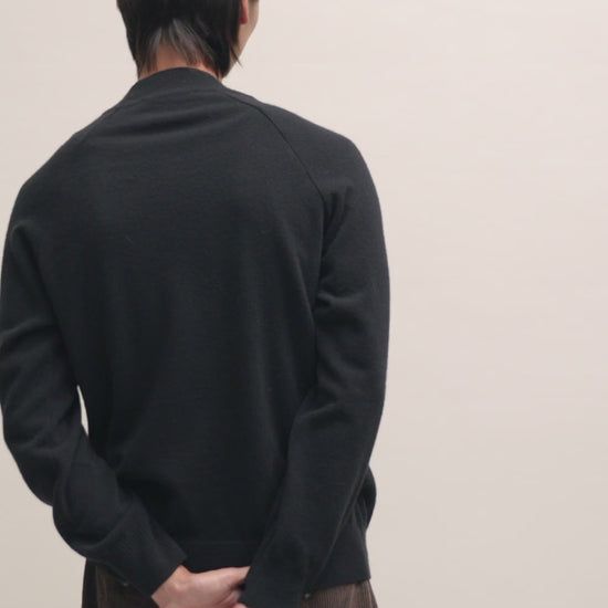 PRODUCT: A classic raglan pullover with a regular fit and a turtleneck, featuring subtle ribbed pattern details along the neckline.