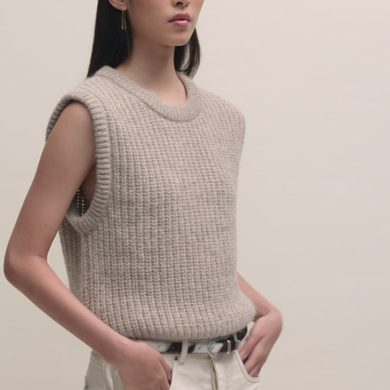 €235PRODUCT: The Onon Vest features a boxy, cropped silhouette with a round neckline. It comes in a ribbed knit pattern and is perfect for layering.