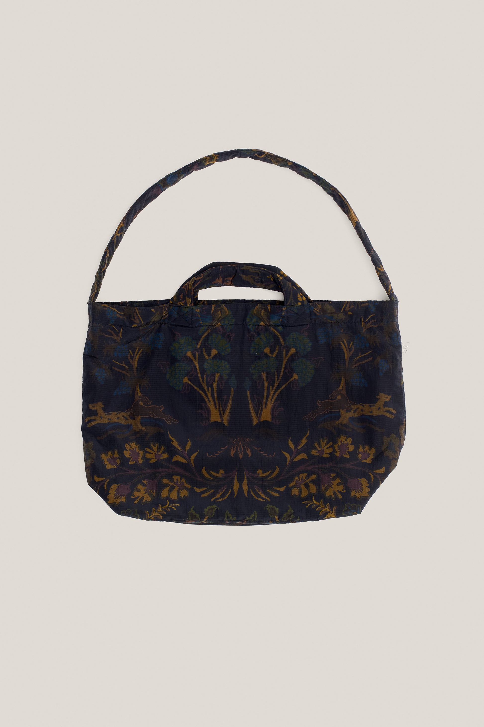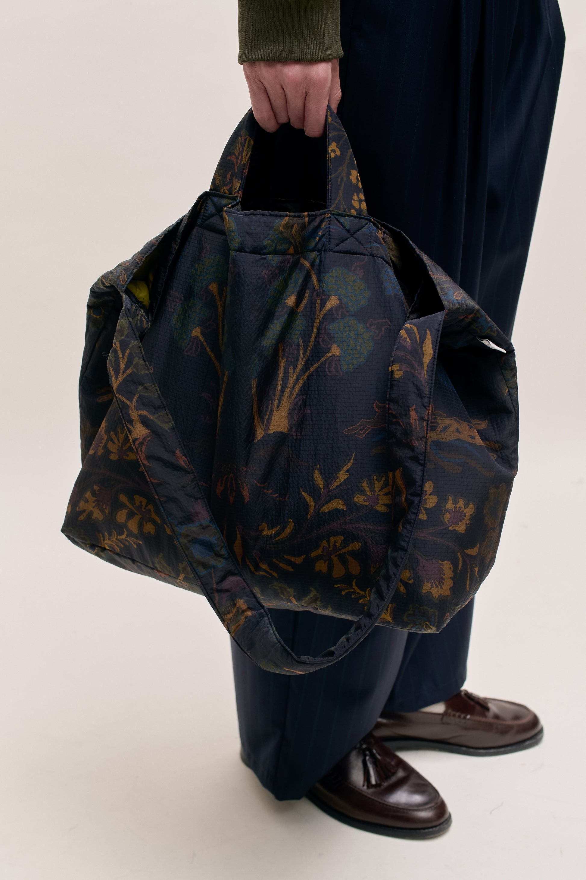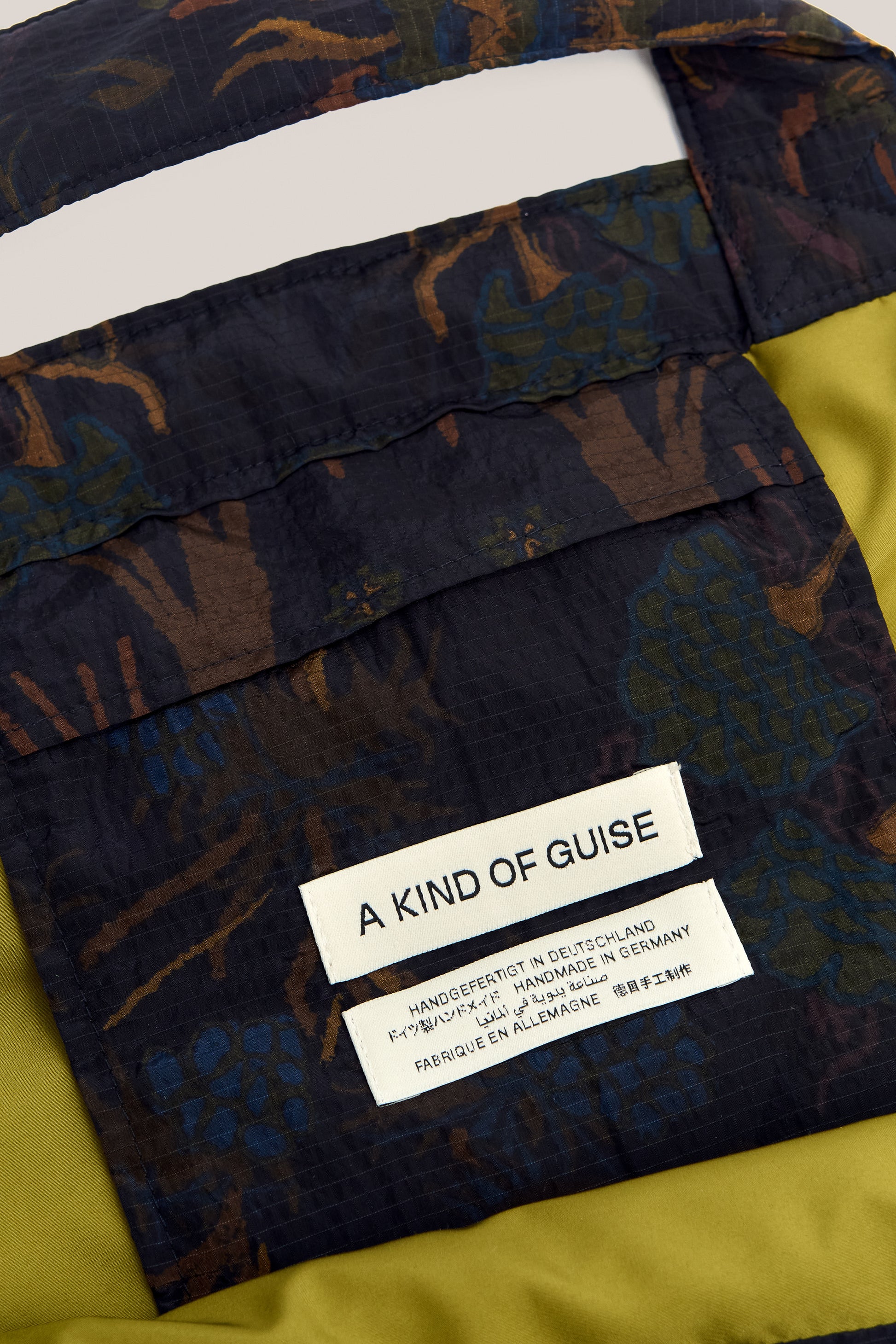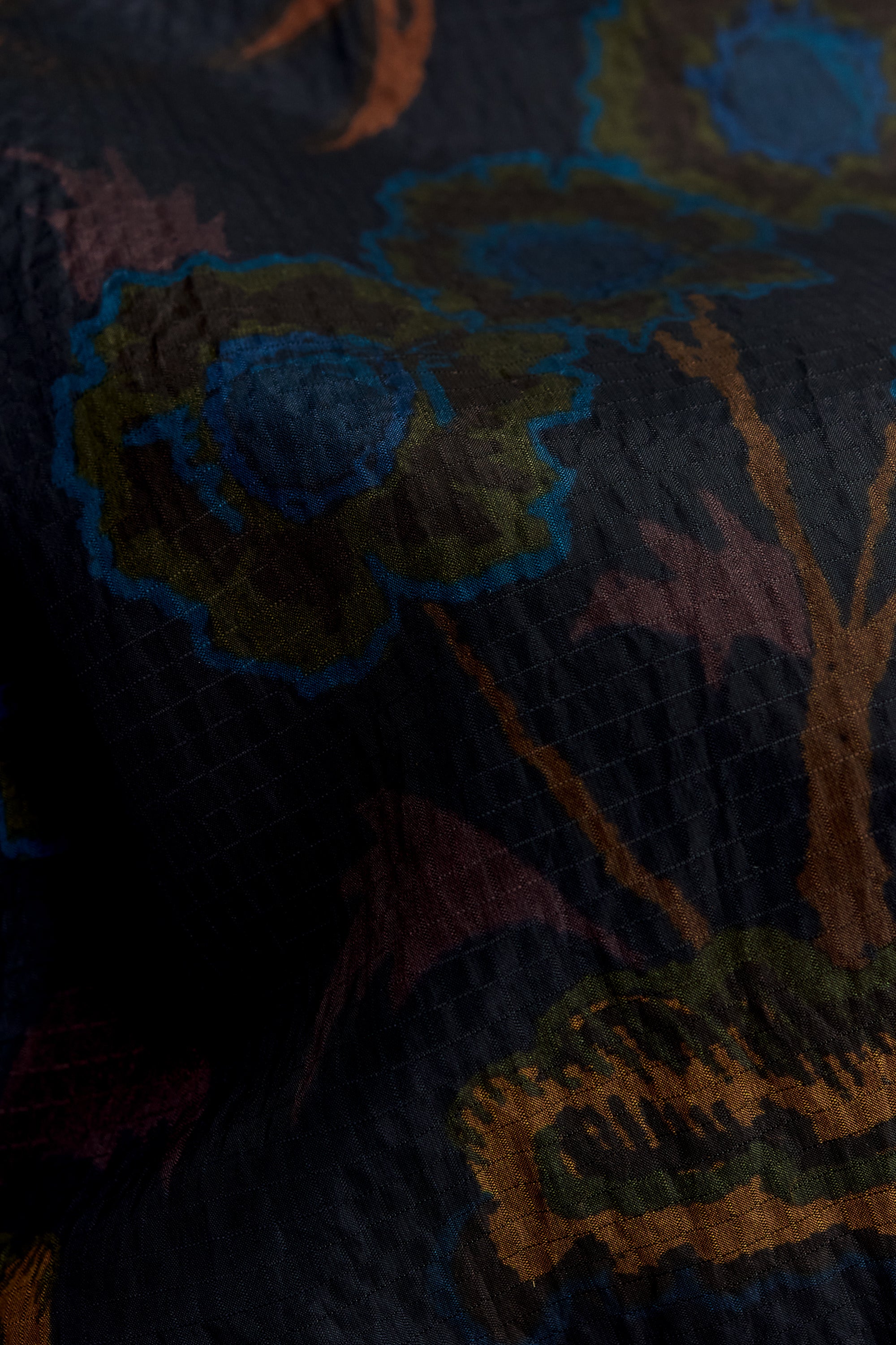 FABRIC: A lightweight ripstop tech fabric made from recycled polyamide, featuring a subtle grid structure and a crisp hand. Water-repellent and pfc-free, it is printed with an AKOG AW25 in-house designed pattern featuring stylized florals and animals in rich earthy tones on a dark ground.