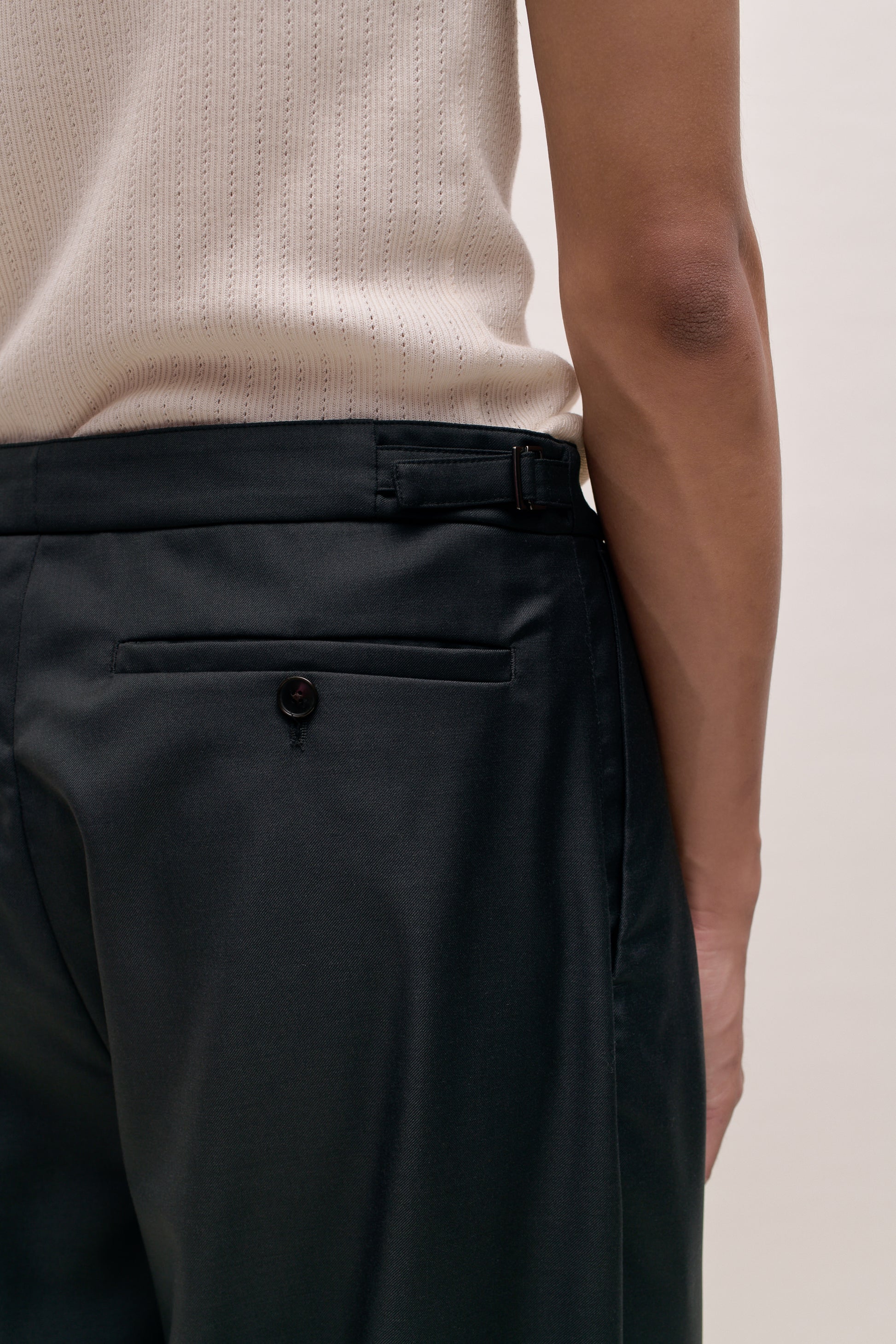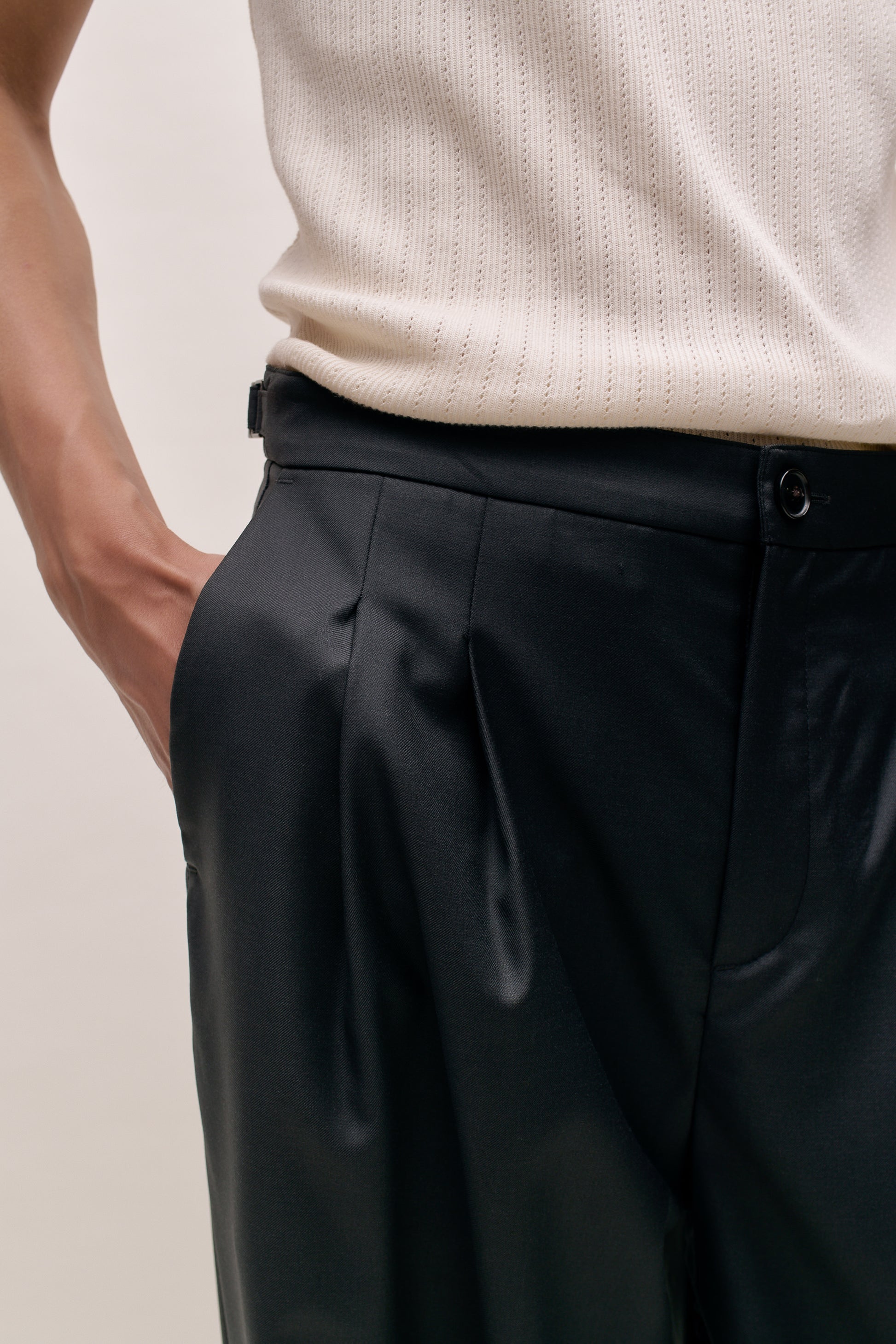 PRODUCT: The Piero Pants have a relaxed fit with a wide leg, double side pleats, slanted side pockets, a back welt pocket with button closure, and adjustable side straps for a custom fit.