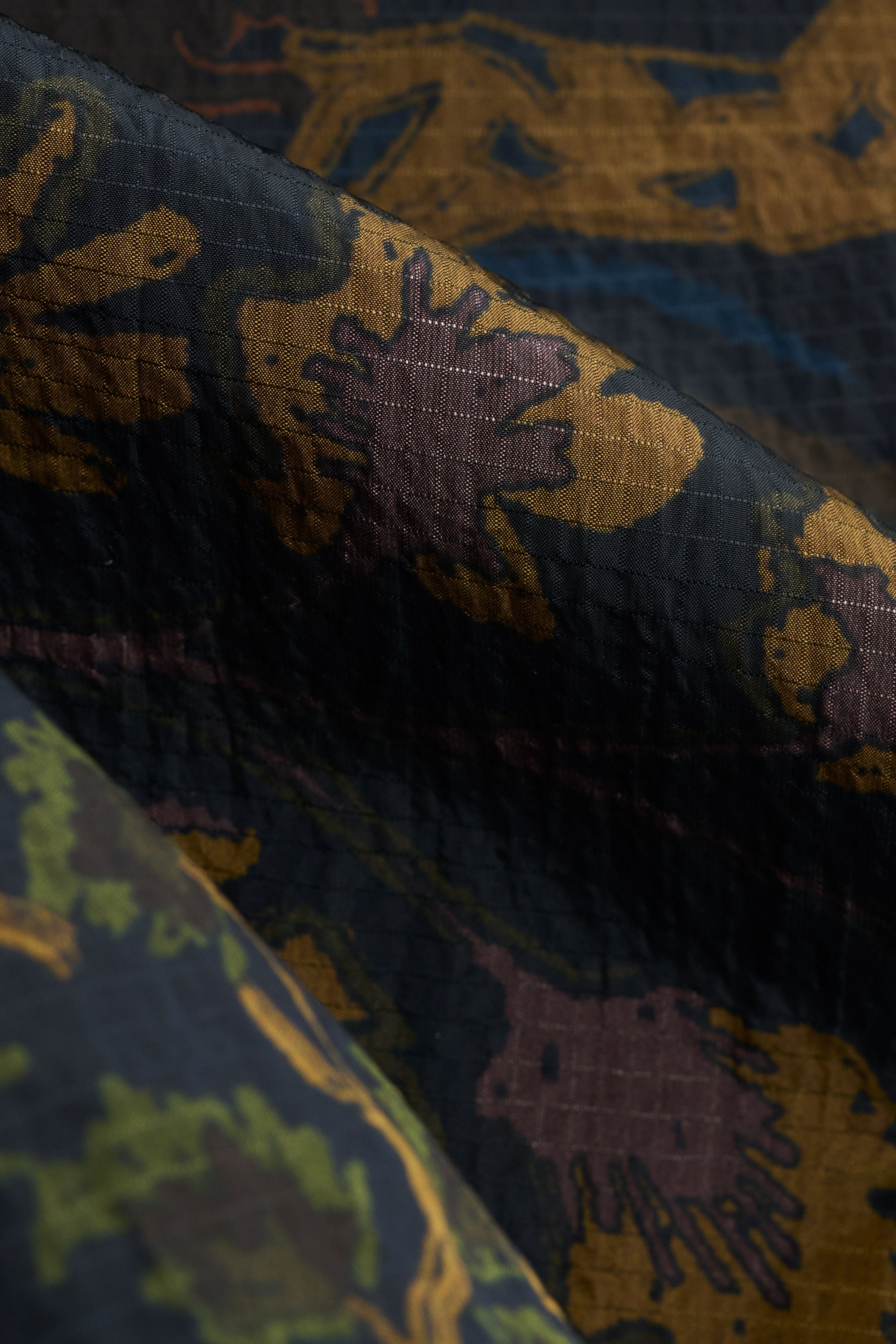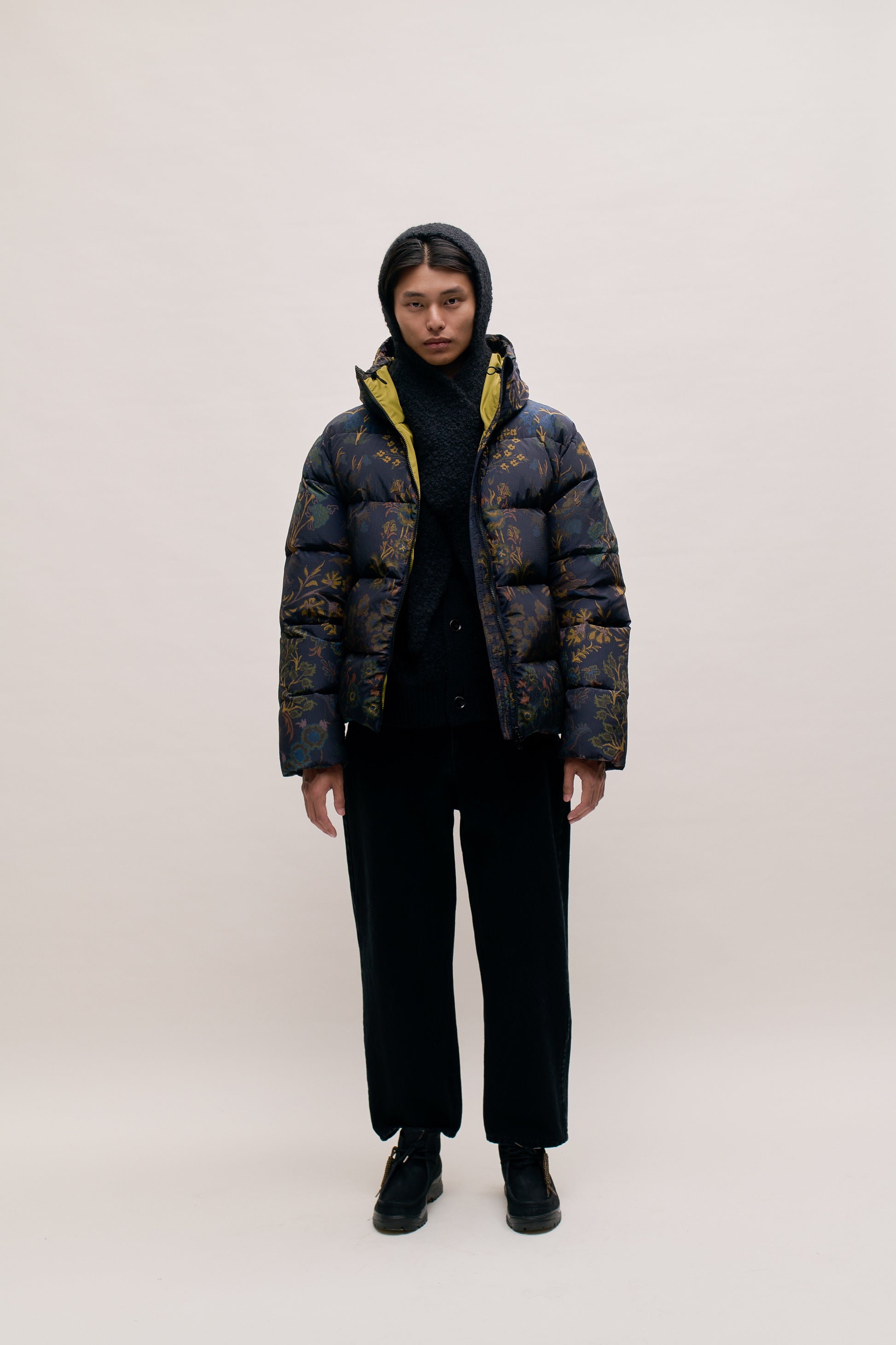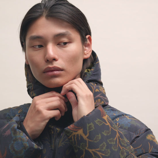 FABRIC: A lightweight and water-repellent ripstop made from 100% recycled polyamide. It is printed with an in-house designed pattern. Insulated with a 100% recycled blend of 90% down and 10% feathers for lightweight warmth.