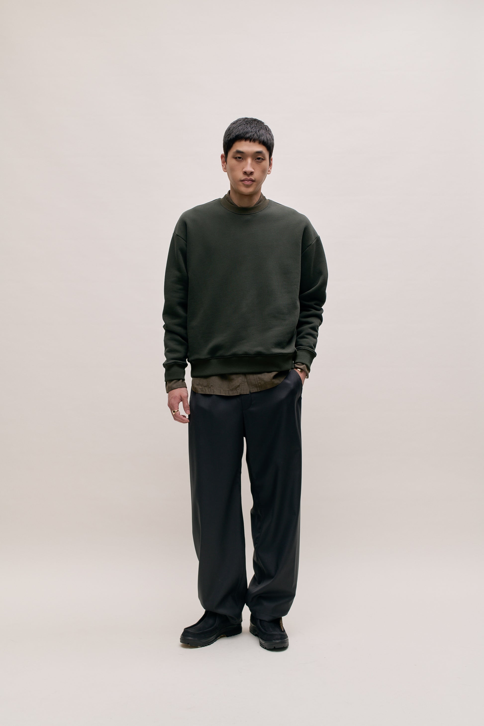 PRODUCT: A vintage-inspired crewneck sweater with an oversized fit and dropped shoulders.