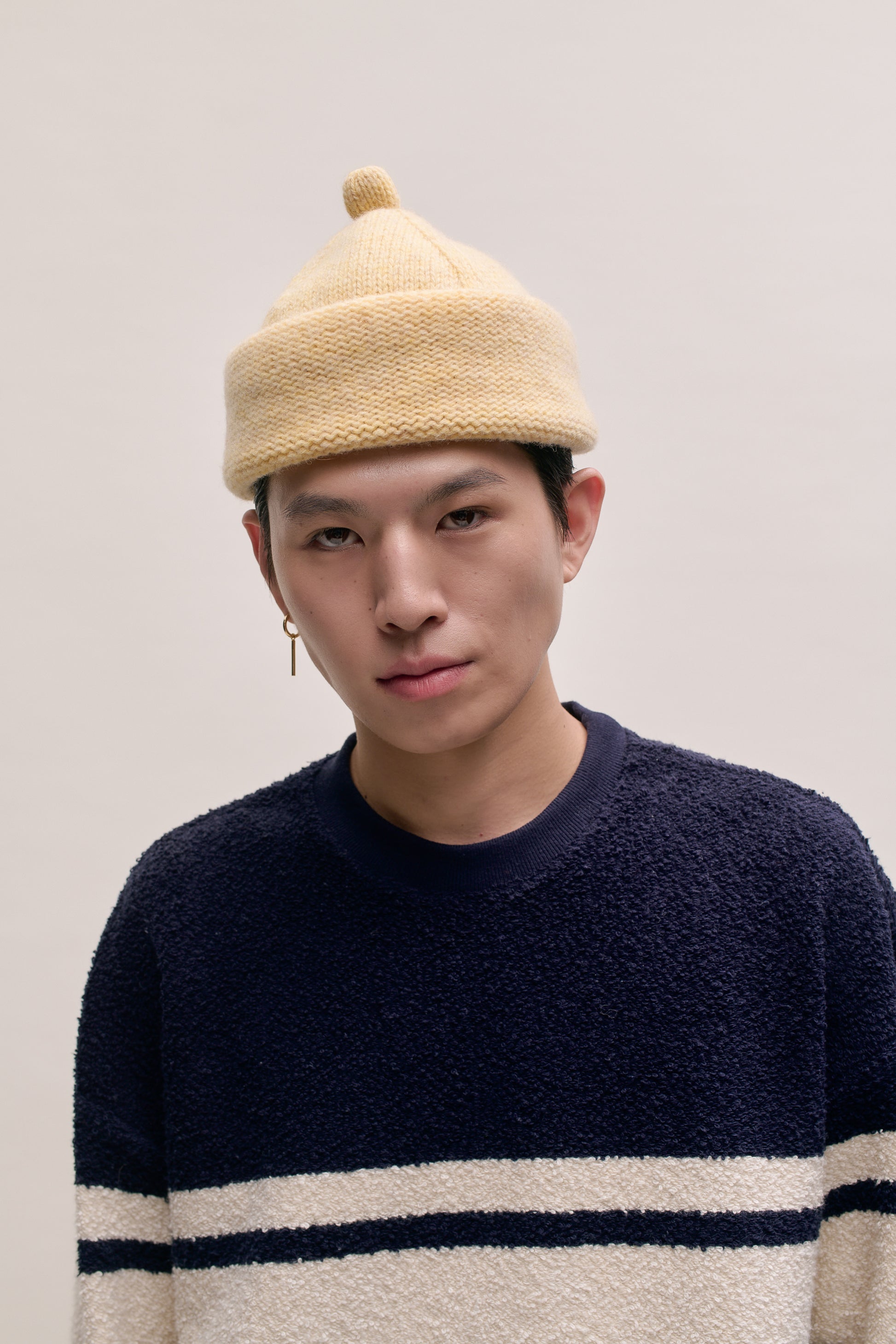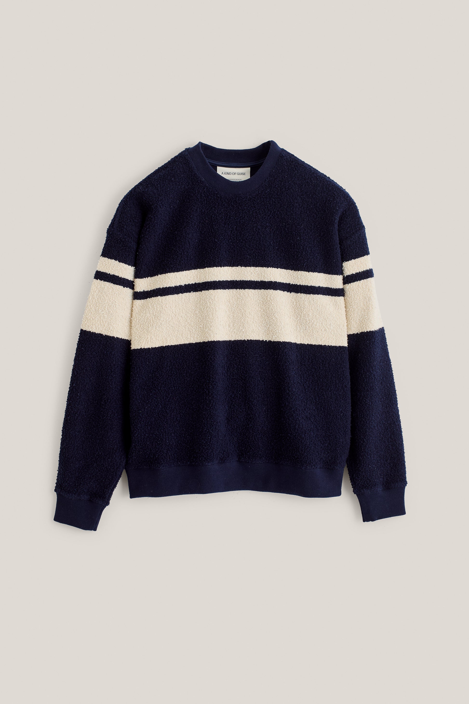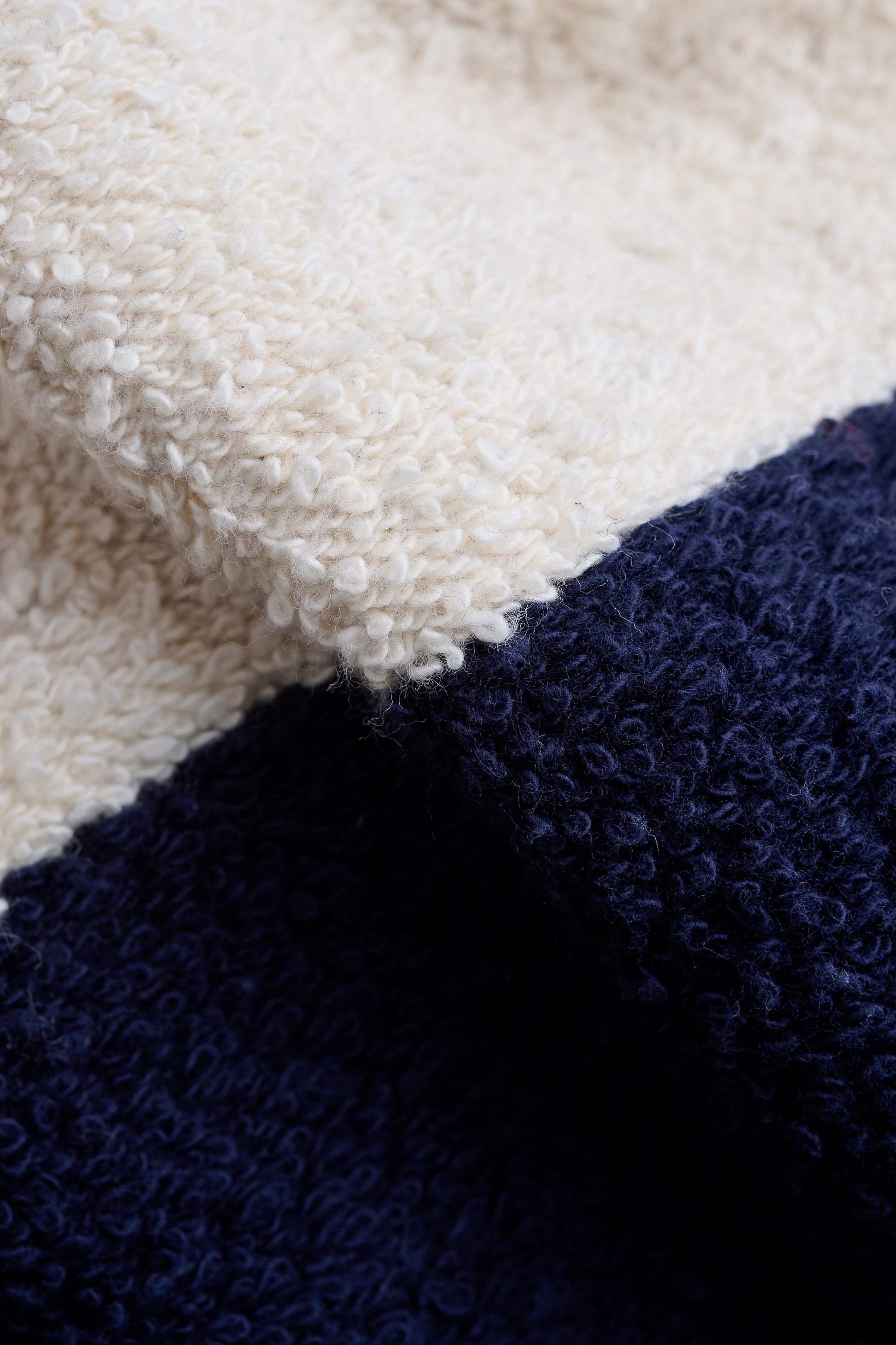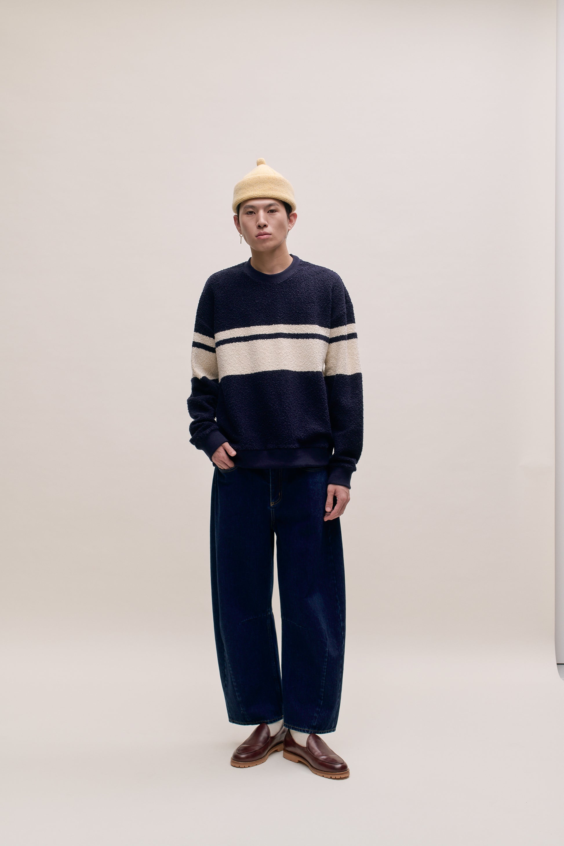 FABRIC: A cotton terry with looped texture on the outer side and a smooth, flat inner side. Features a striped pattern that adds a casual, tactile character.