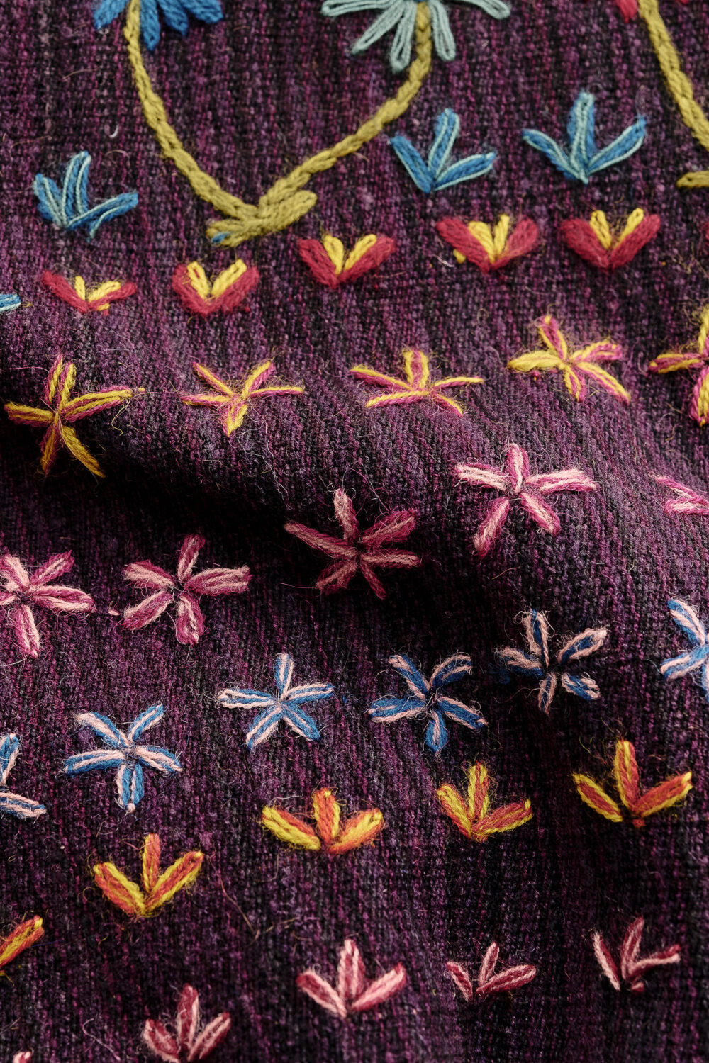 The fabric – a blend of 60% wool and 40% alpaca – takes over four weeks to create, beginning with hand-spun yarns naturally dyed using plants, minerals, and cochineal insects. Woven on traditional backstrap looms, this meticulous process showcases exceptional skill and patience, while intricate embroidery inspired by Peru’s flora and fauna adds an additional layer of artistry.