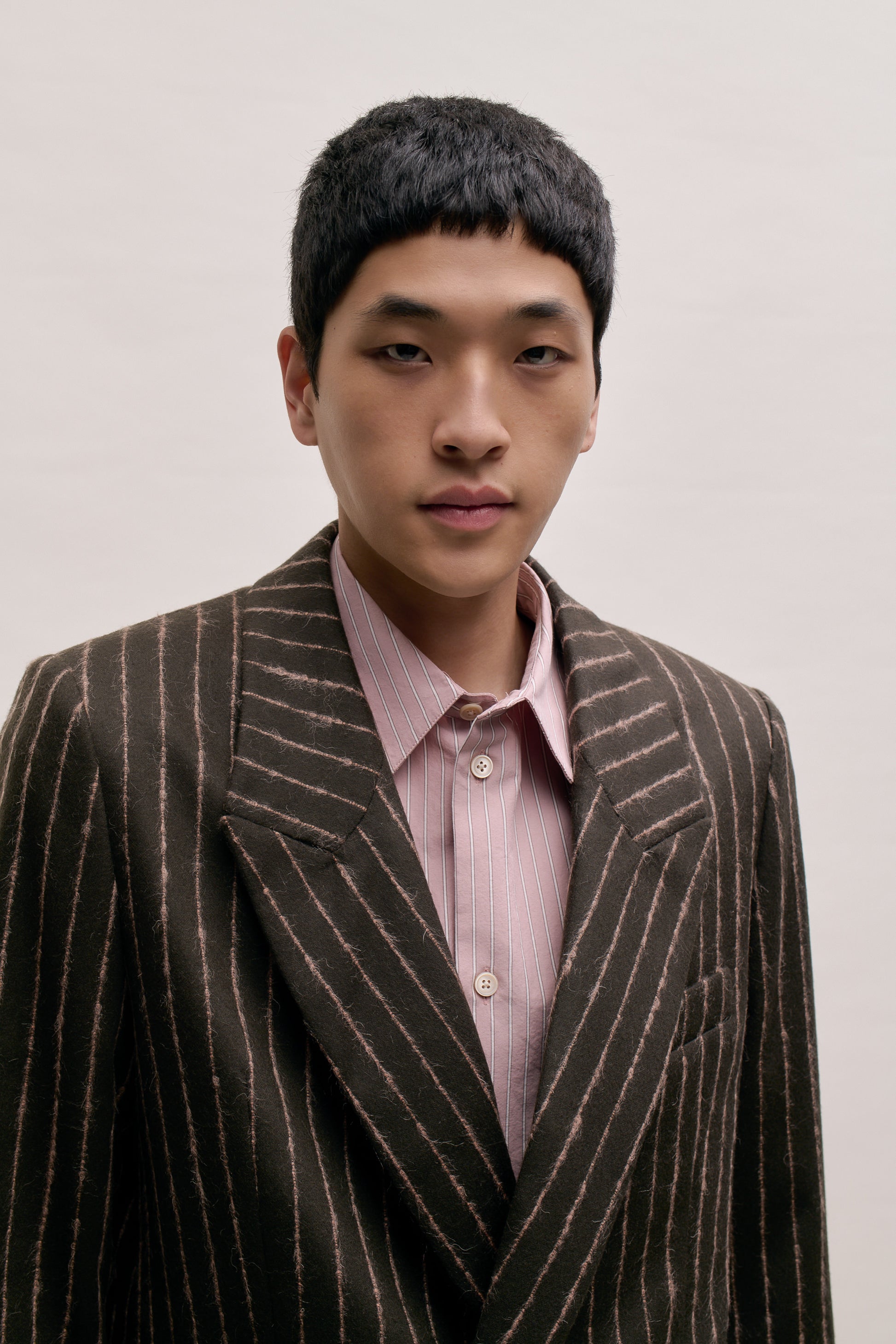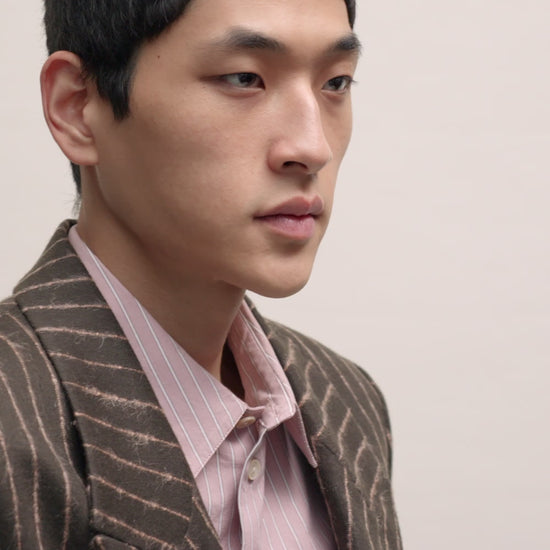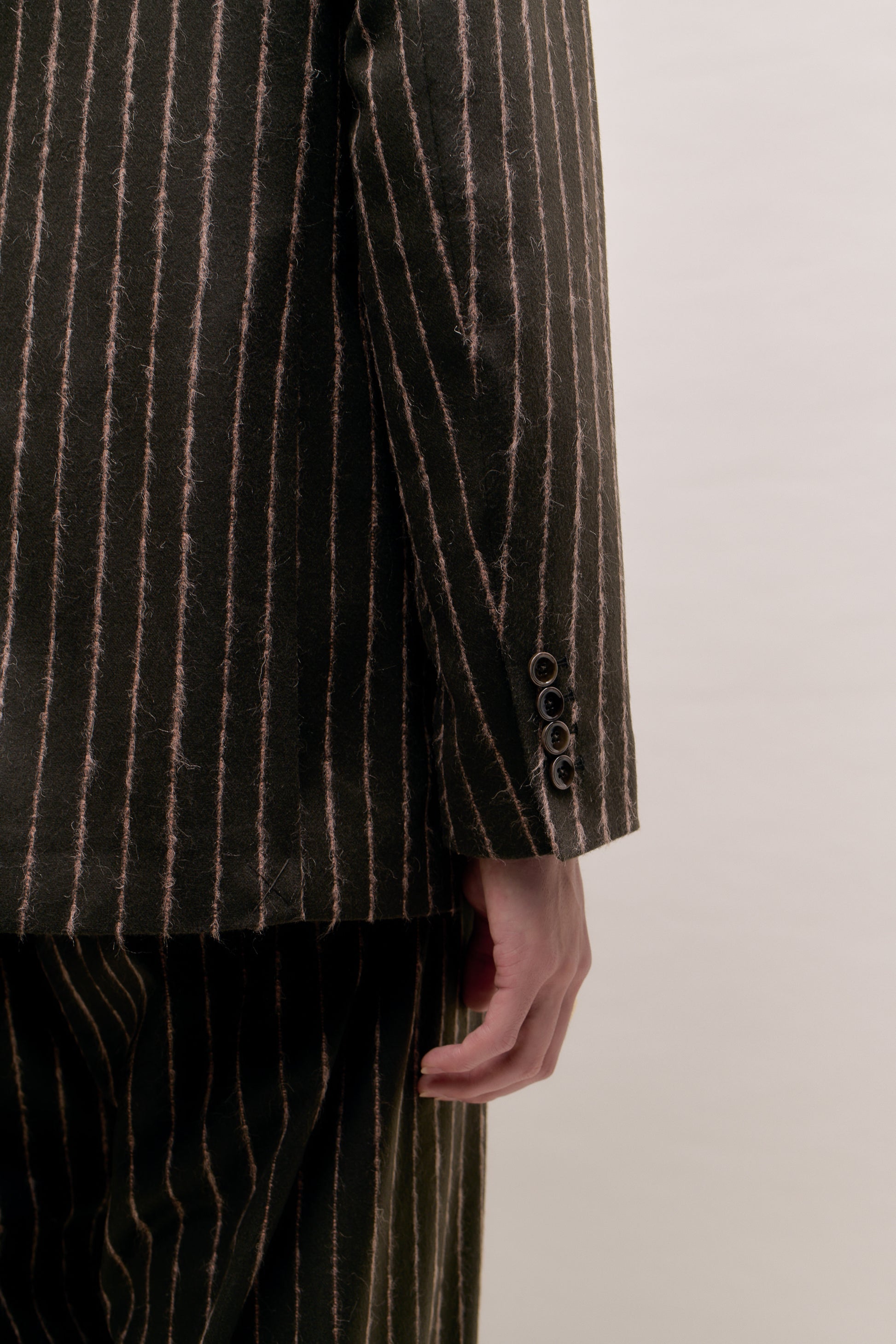 FABRIC: A virgin wool and mohair blend with hairy, raised stripes that create a bold, textured contrast. The fabric is soft to the touch, yet retains a certain stiffness and structure, giving it both warmth and definition.