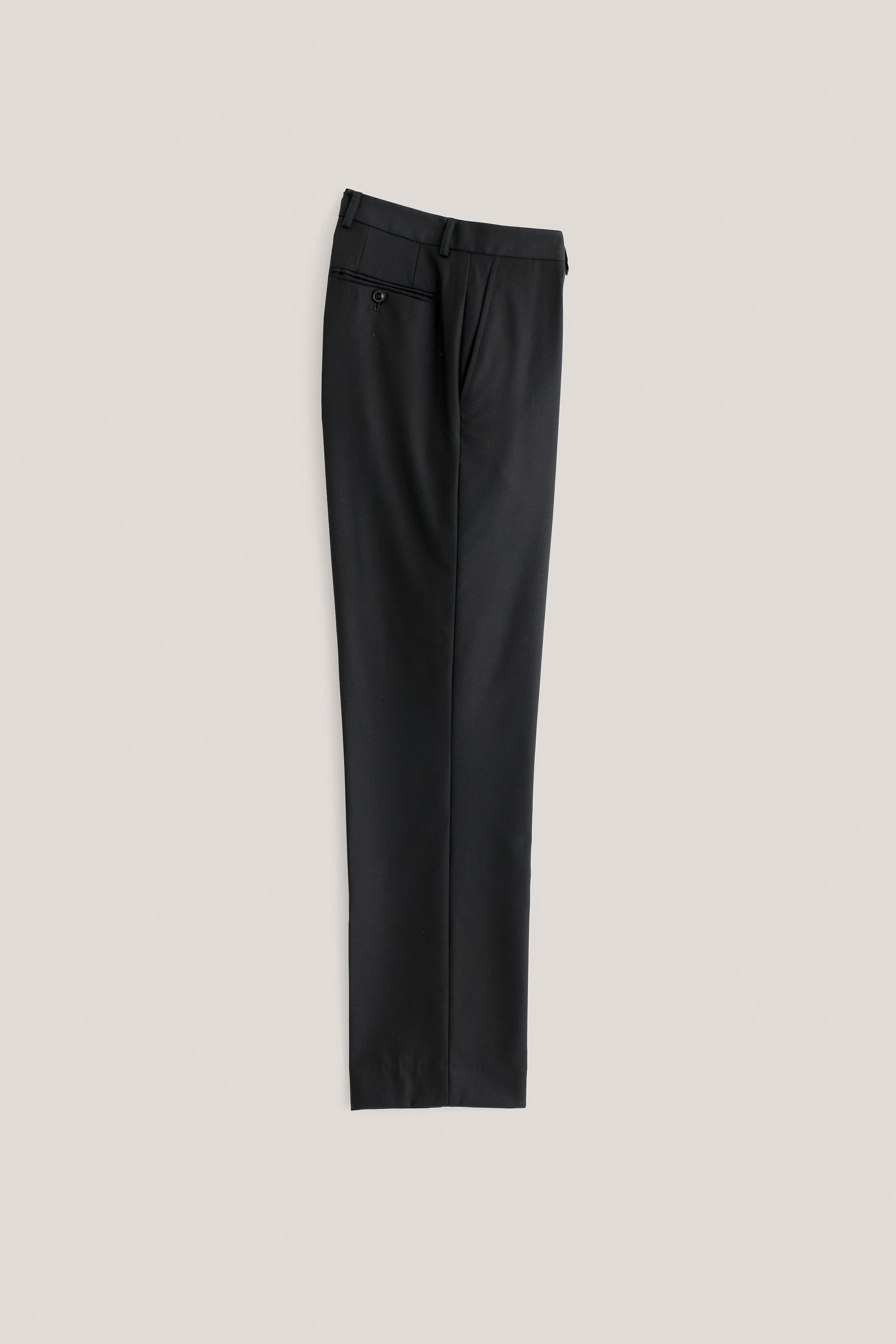 PRODUCT: The Relaxed Tailored Trousers have a trim silhouette with a slight taper, welt back pockets with buttons, a visible front button closure, and a front pleat.