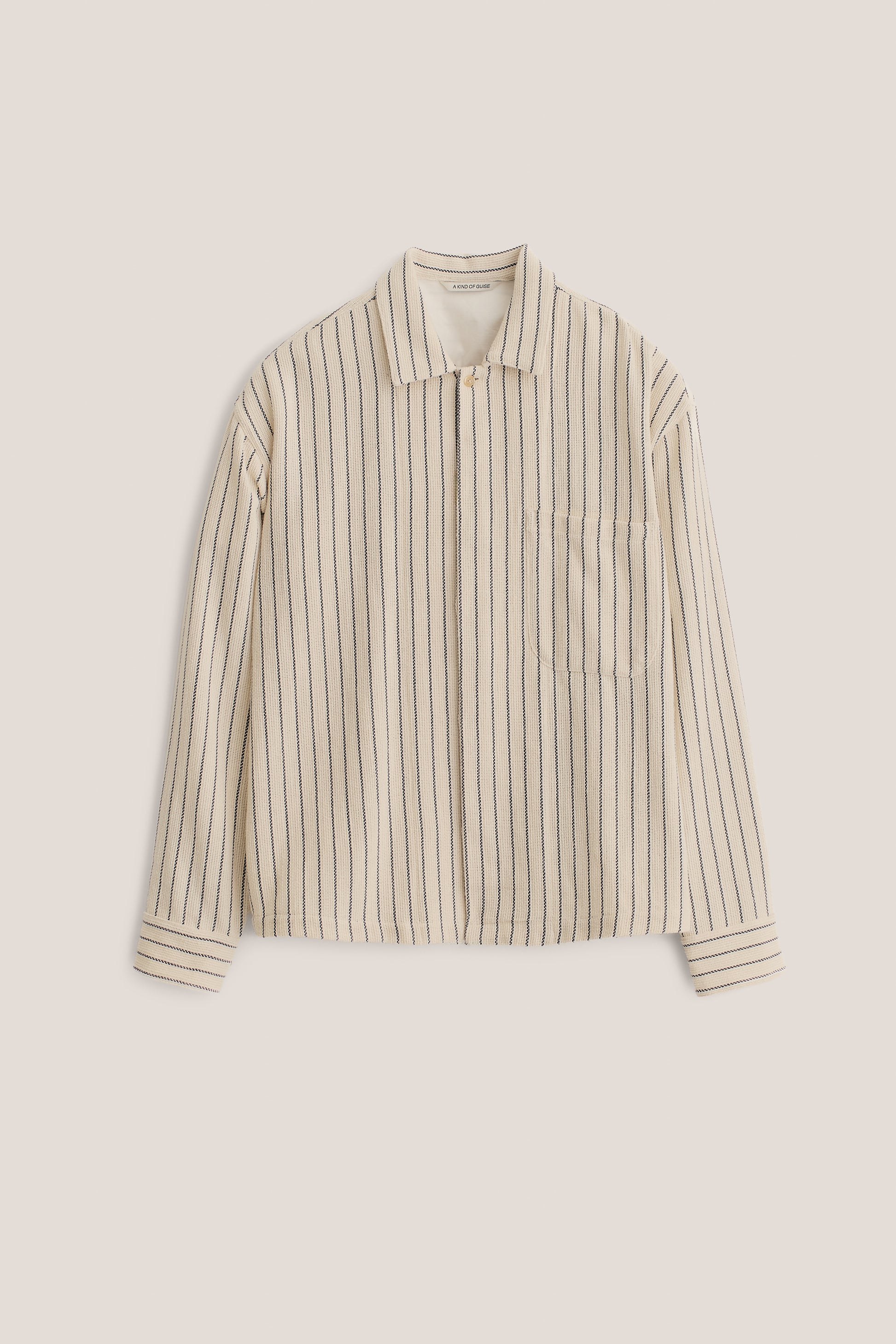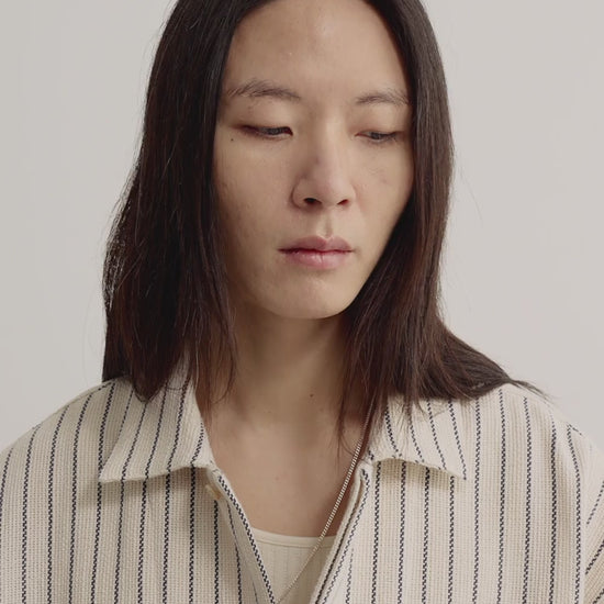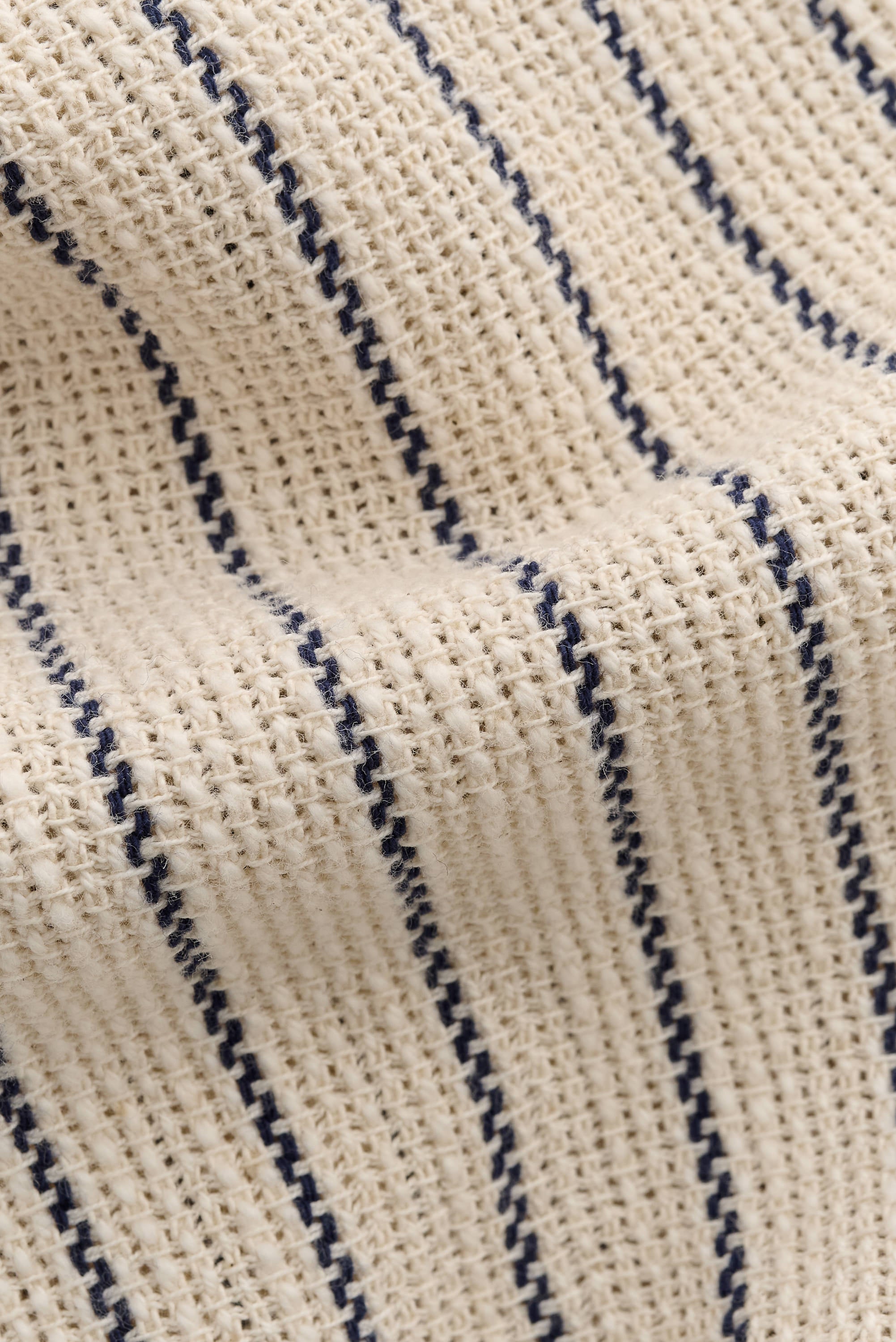 FABRIC: Woven in Spain, this cotton and recycled cotton blend has an off-white base with contrasting navy stripes arranged in an engineered pattern. The open weave makes it breathable and comfortable to wear.