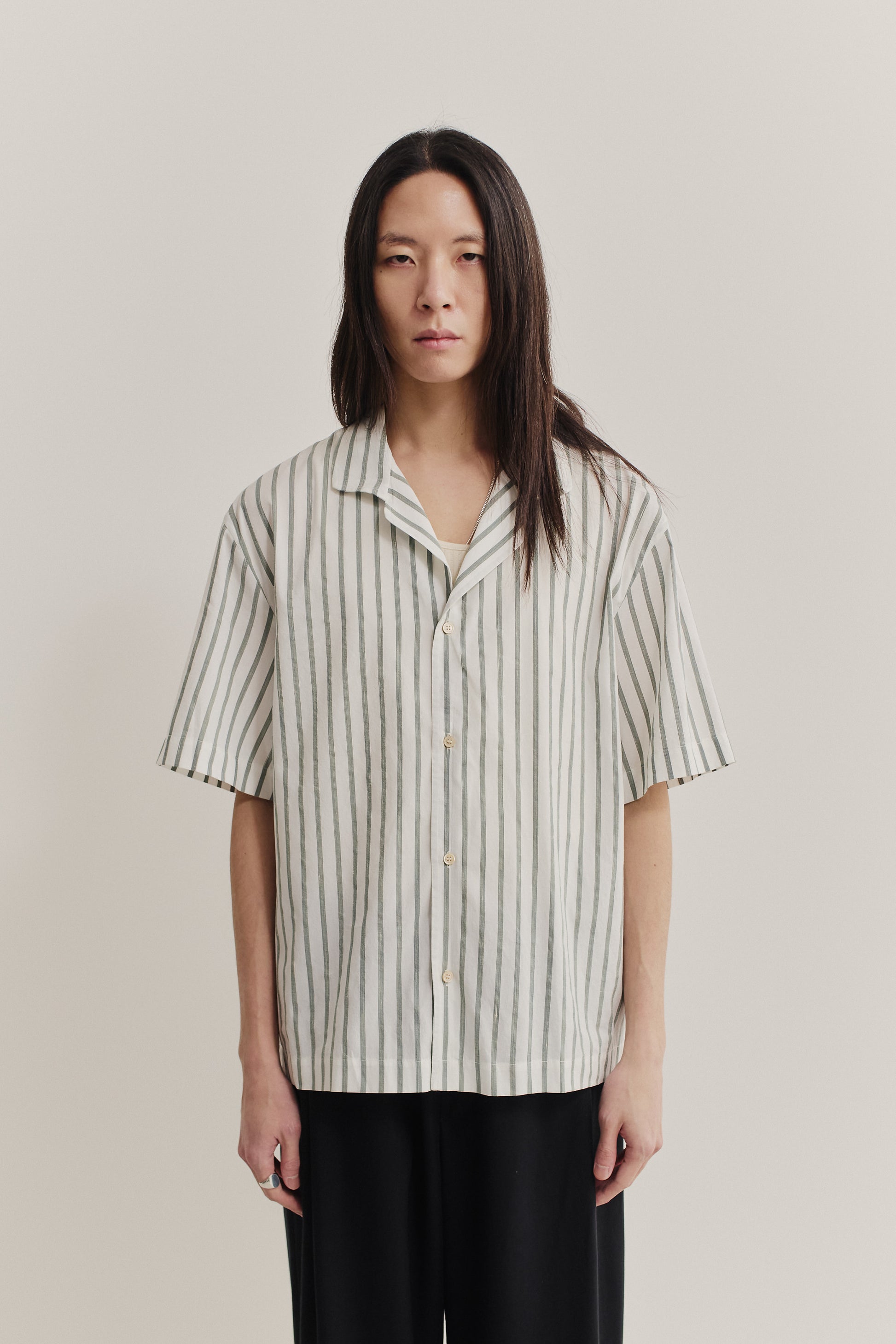 PRODUCT: The Samata Shirt is a refined version of our Gioia Shirt, featuring a relaxed fit with dropped shoulders, short sleeves, a notched shirt collar, and a straight hemline.