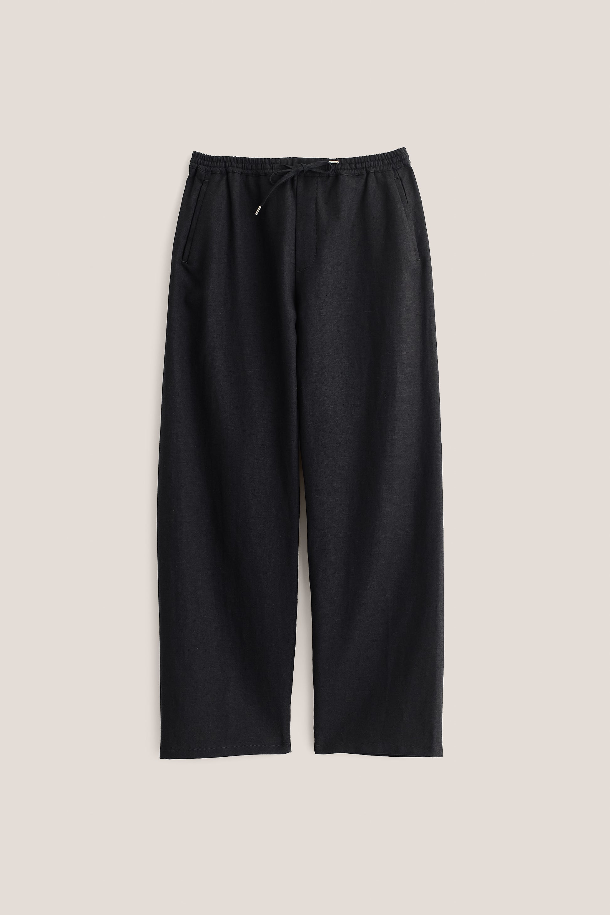 PRODUCT: The Samurai Trousers have no side seam, a wide straight fit, an elasticated waistband, and welt pockets in the front and back with button closures.