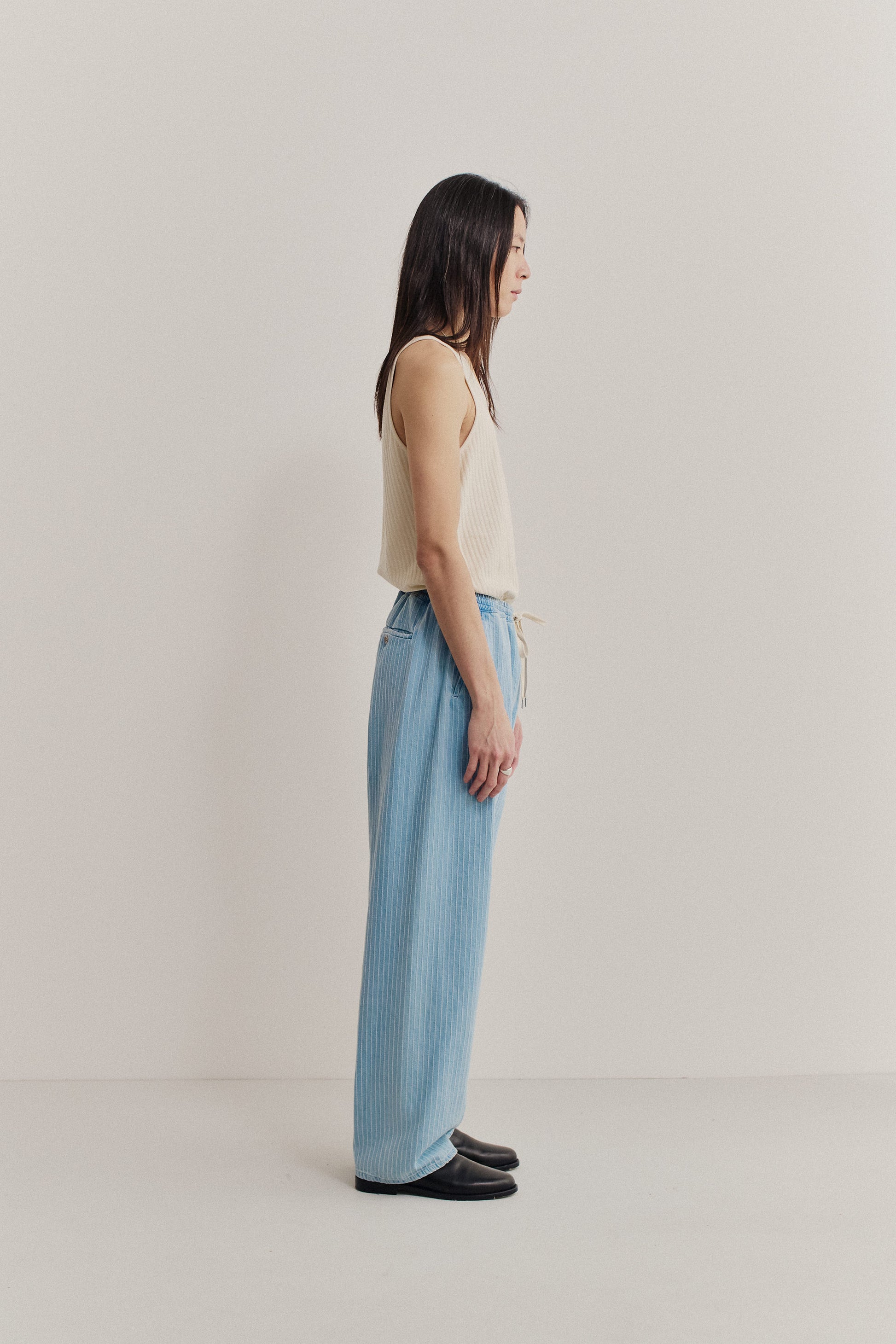 PRODUCT: The Samurai Trousers have no side seam, a wide straight fit, an elasticated waistband, and welt pockets in the front and back with button closures.