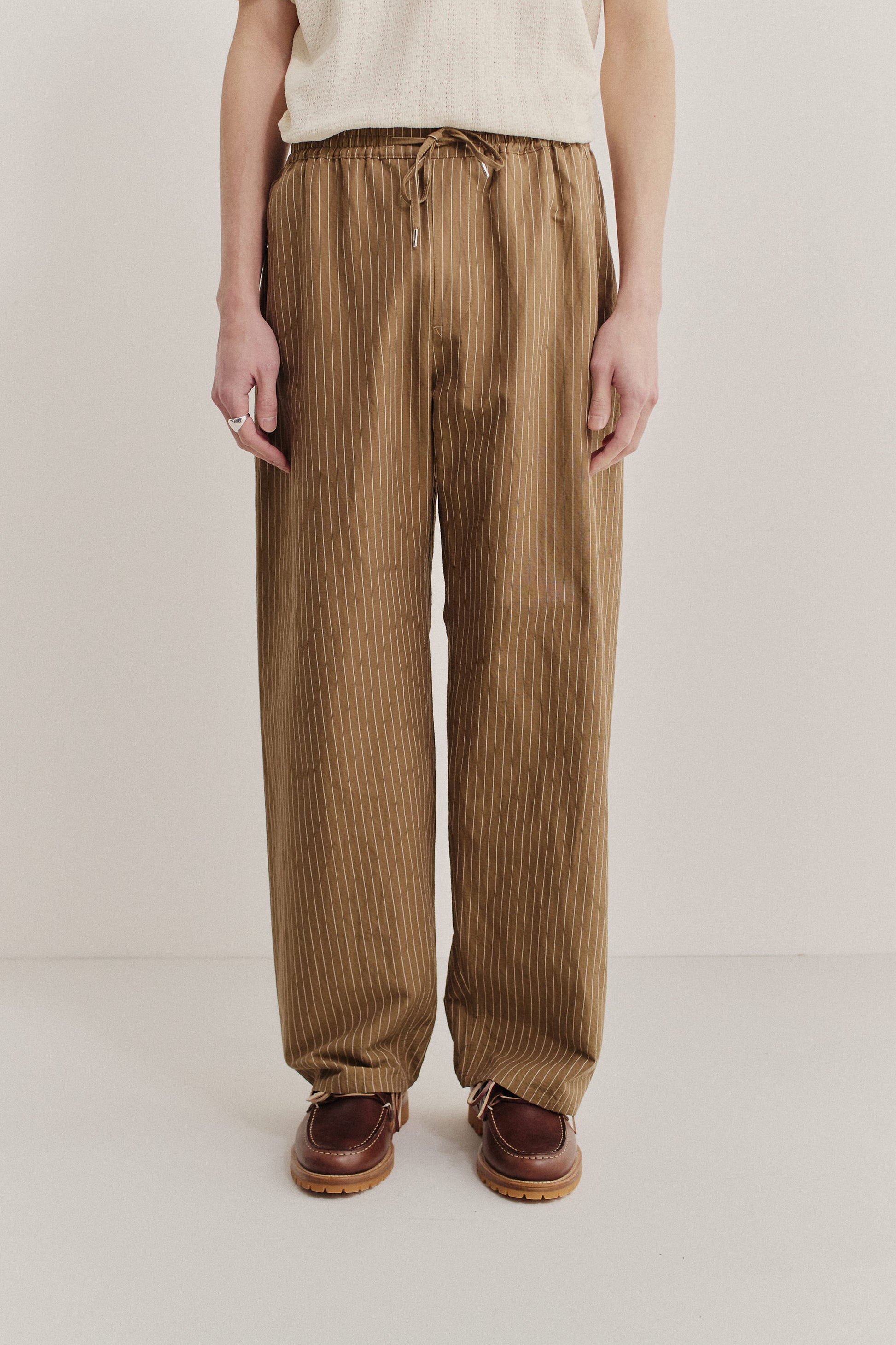 PRODUCT: The Samurai Trousers have no side seam, a wide straight fit, an elasticated waistband, and welt pockets in the front and back with button closures.