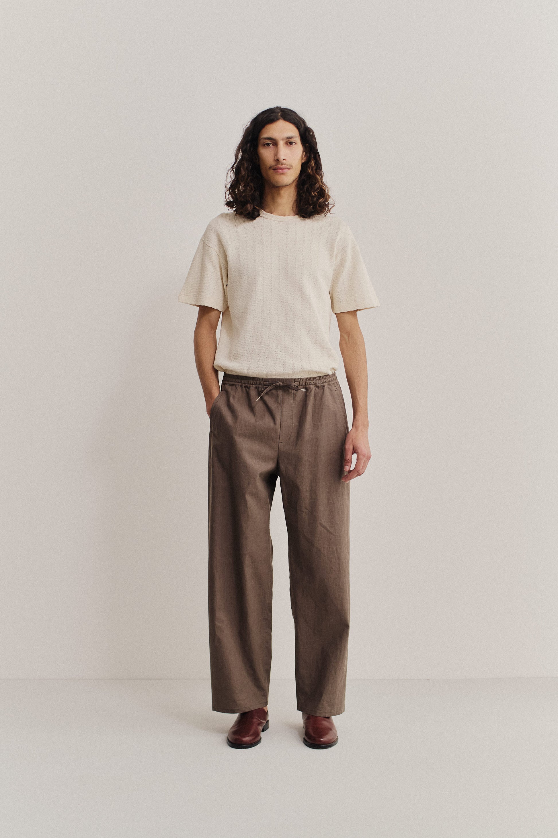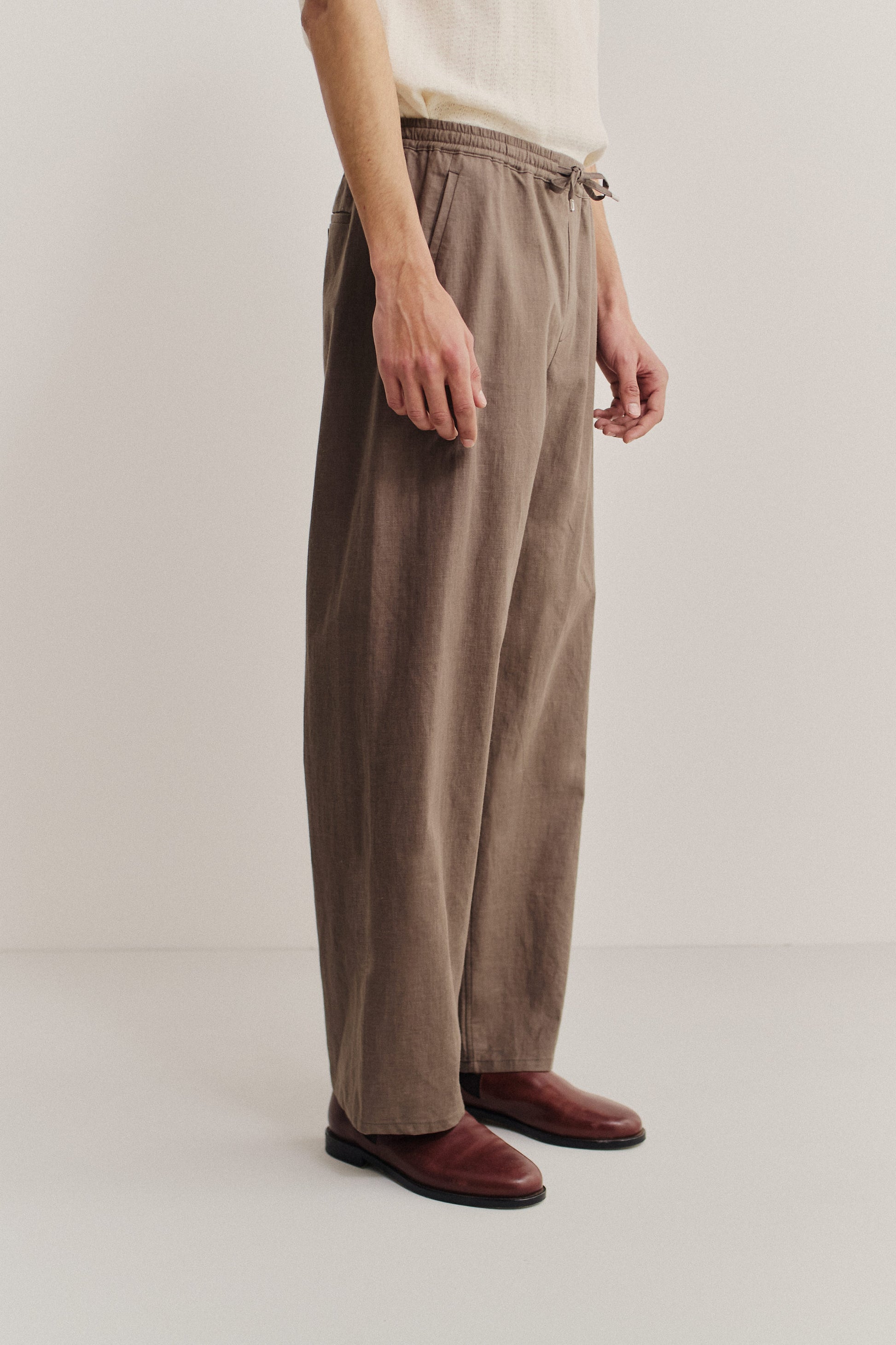 FABRIC: A mid weight 100% linen fabric in a natural brown tone, crafted in belgium for breathability and effortless comfort. Finished with a soft coating for an outdoorsy look and a subtly crushed surface that adds character.