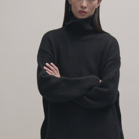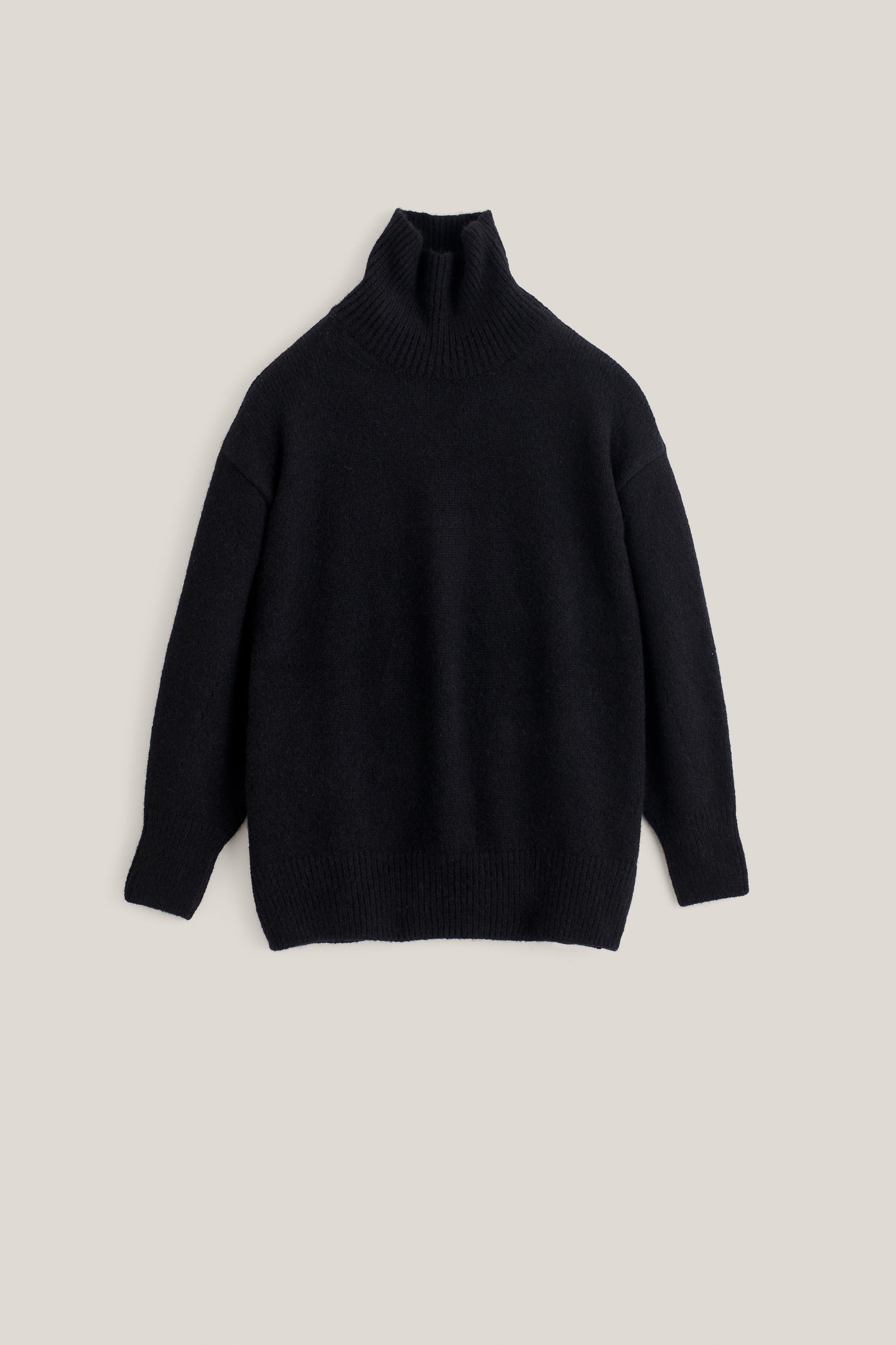 PRODUCT: This knit sweater comes with an oversized silhouette and slightly dropped shoulders. Completed with ribbed cuffs, waist and high-neck.