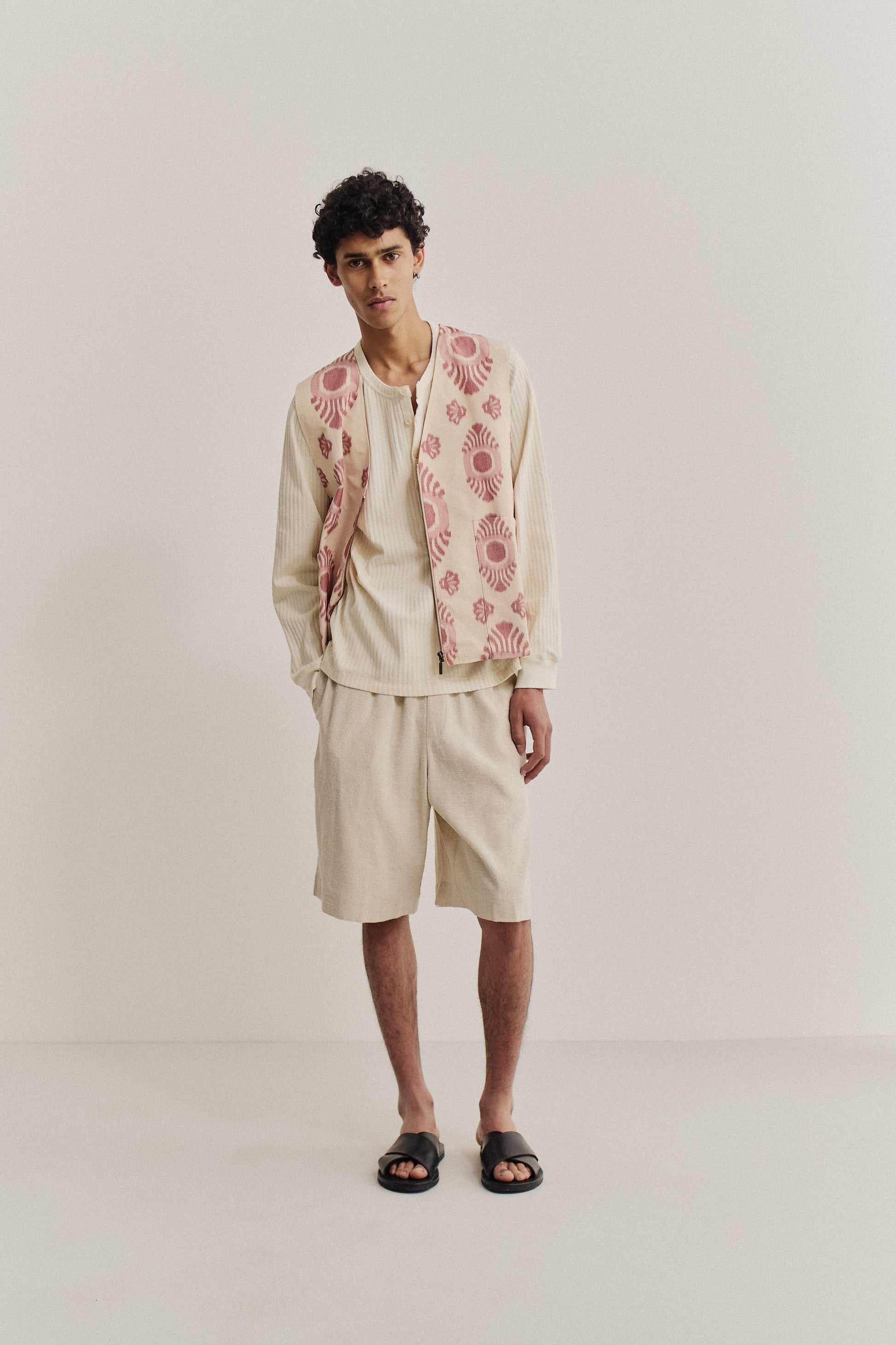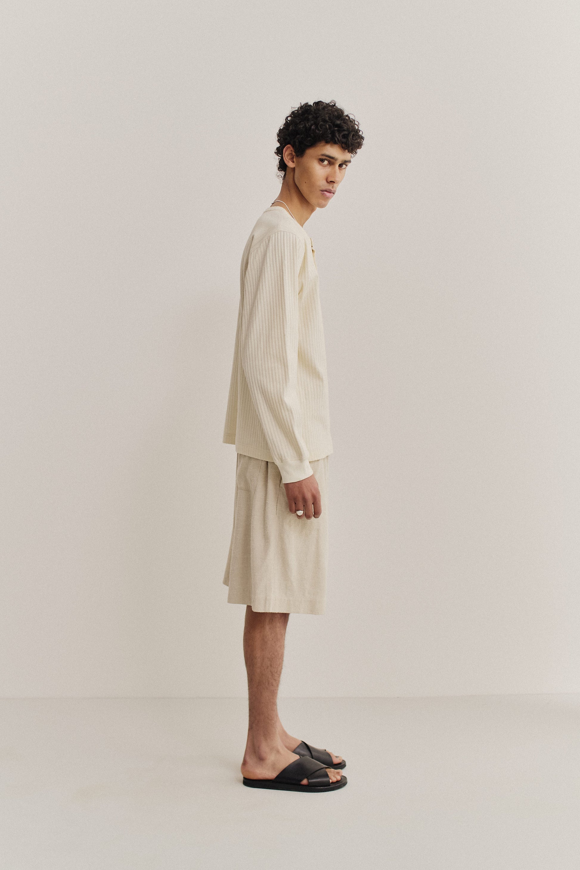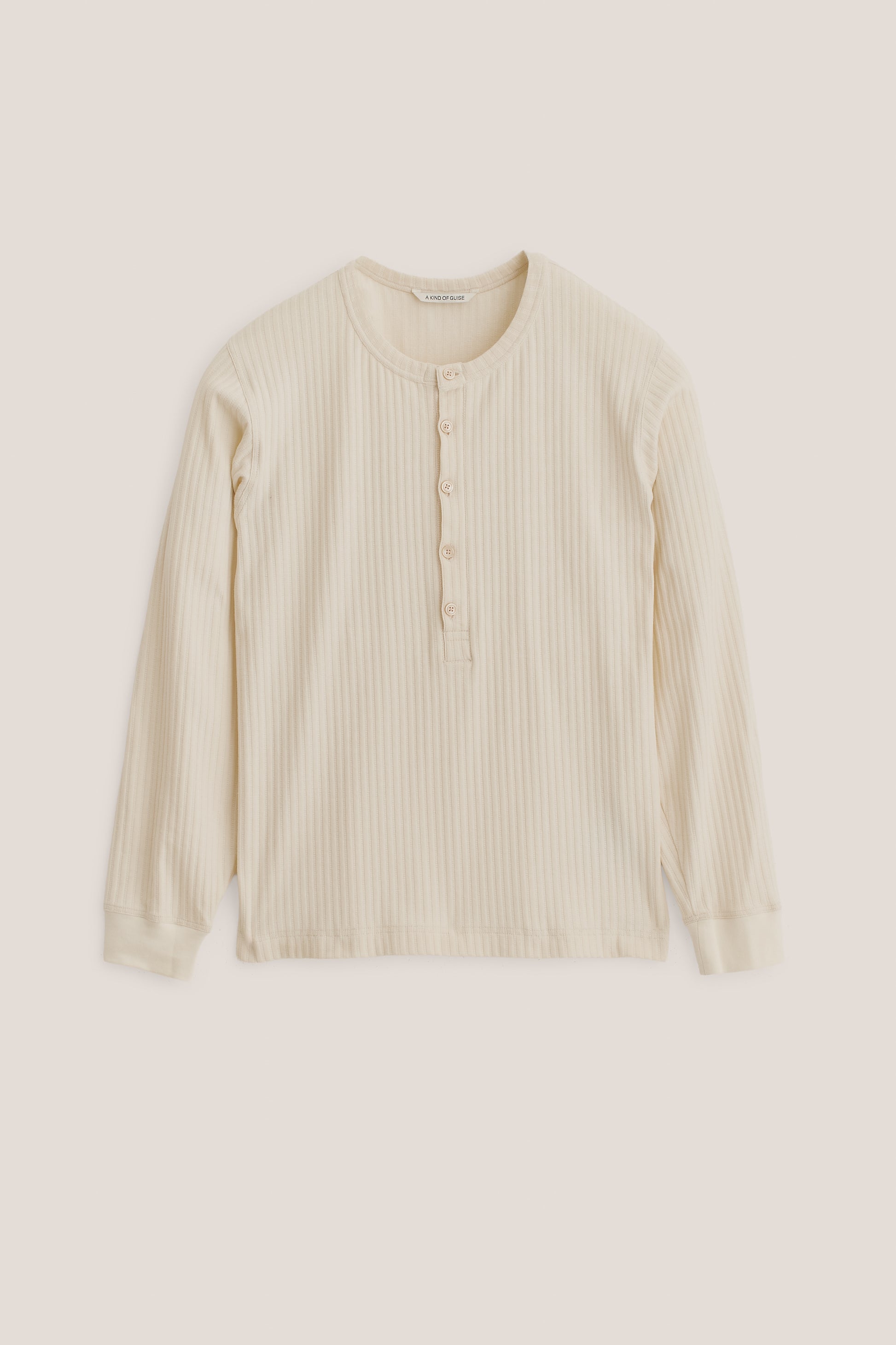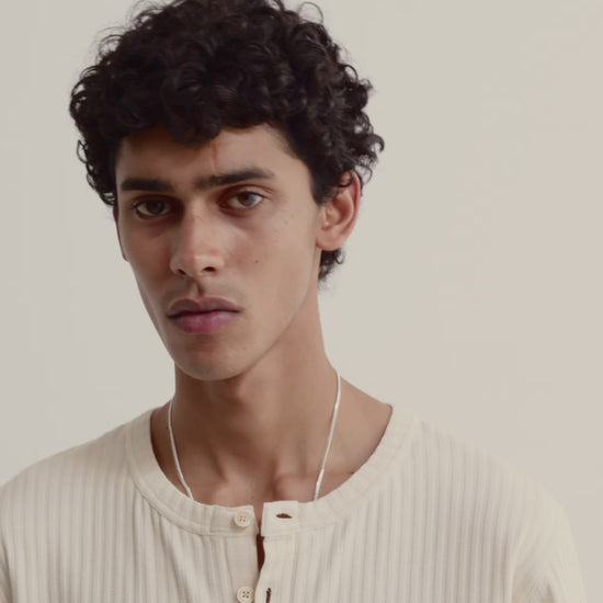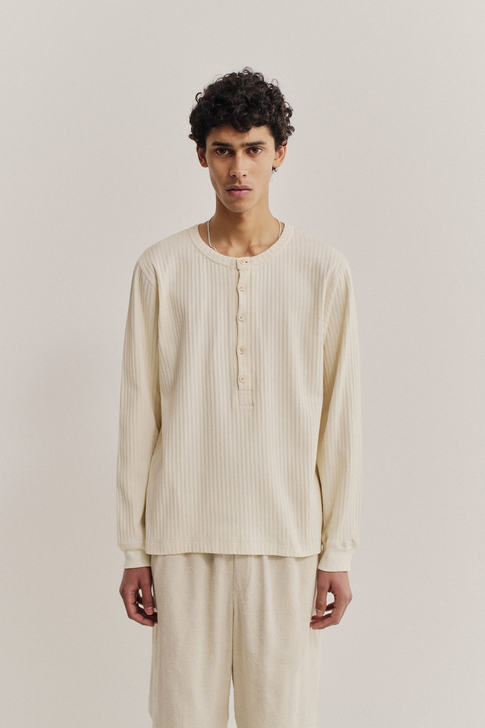 PRODUCT: The Save Long Sleeve is a vintage-inspired, collarless henley with a round neckline, slightly dropped shoulders, and a long button placket backed with herringbone tape. It has a loose silhouette and ribbed cuffs.