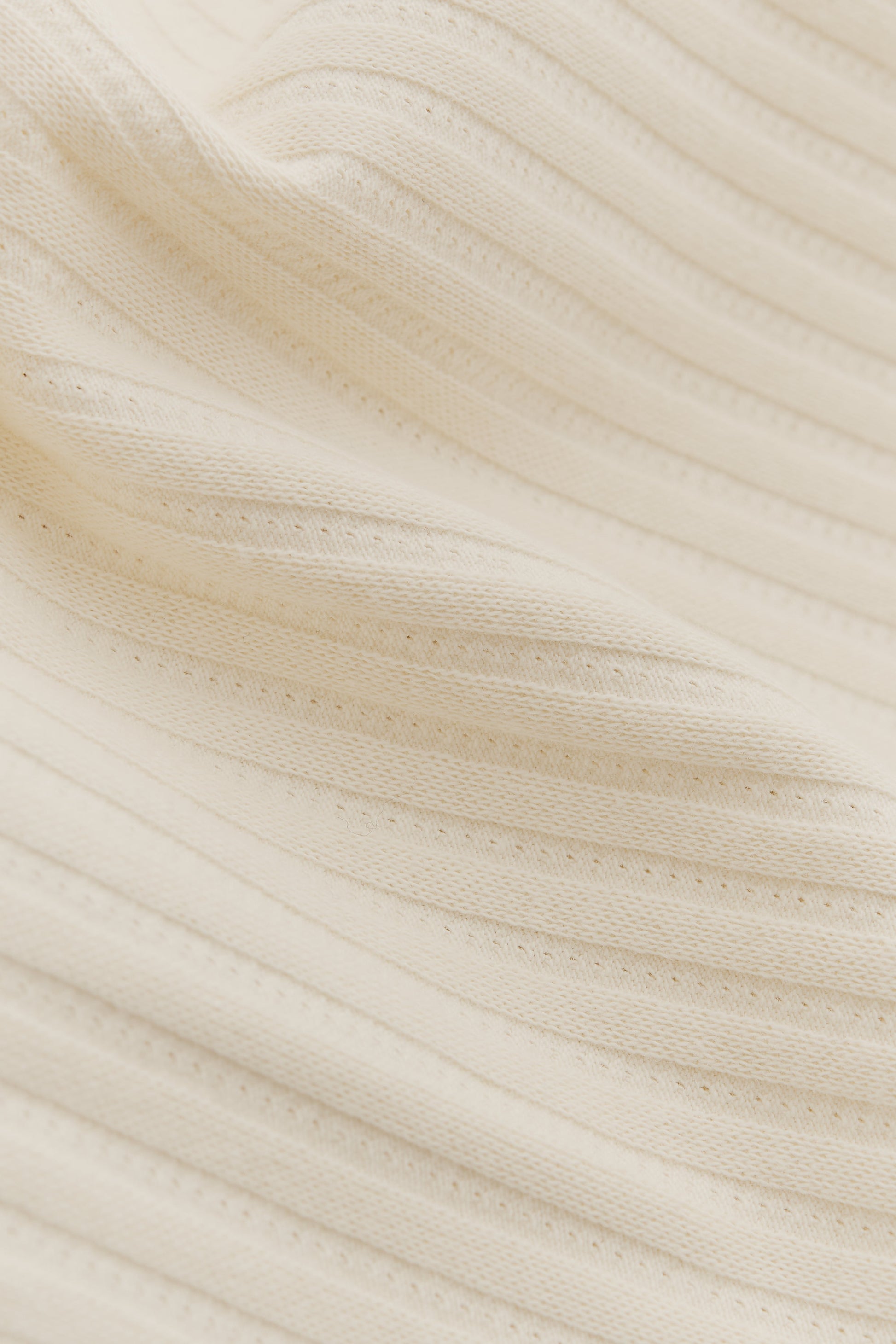 FABRIC: Soft off-white cotton jersey with a rib structure and delicate openwork detailing, creating a breathable, pointelle-like pattern.