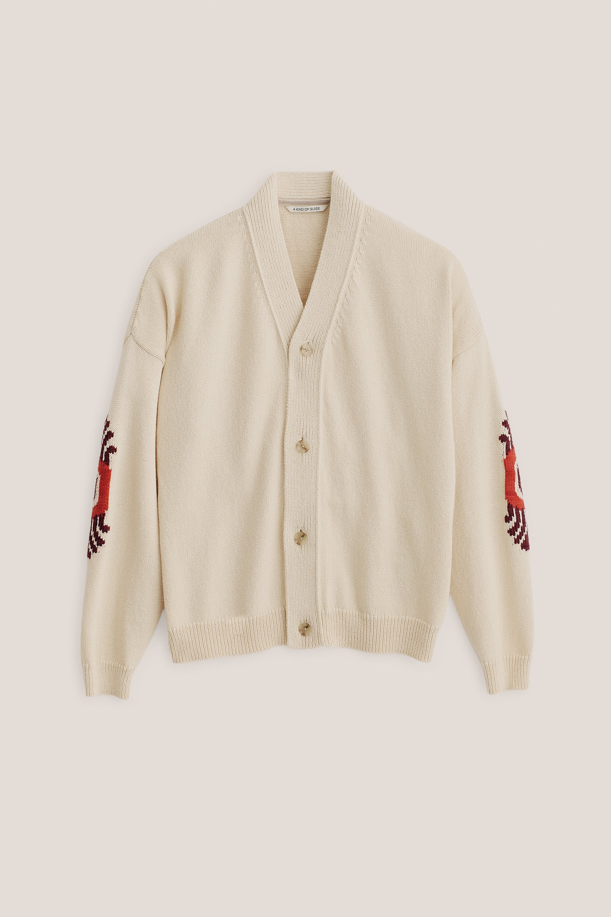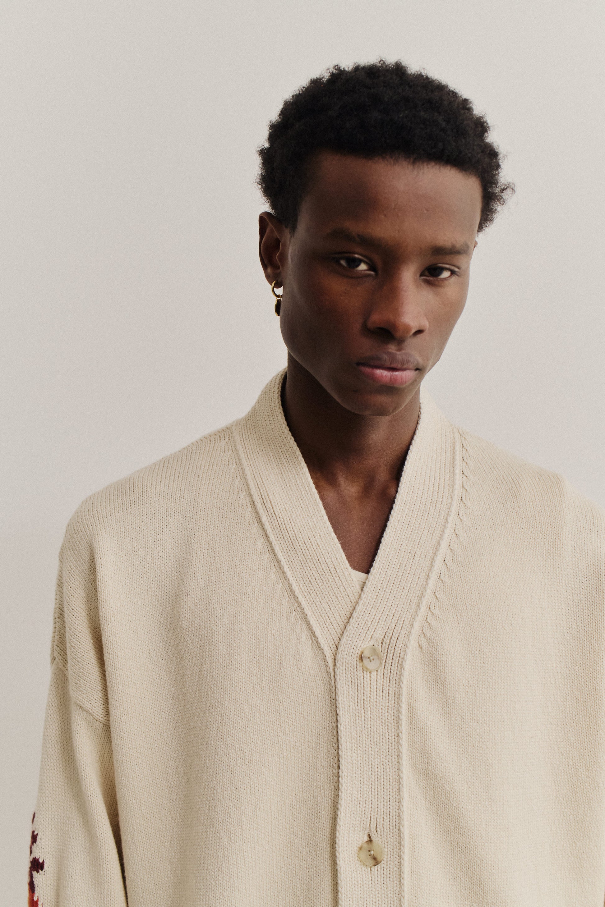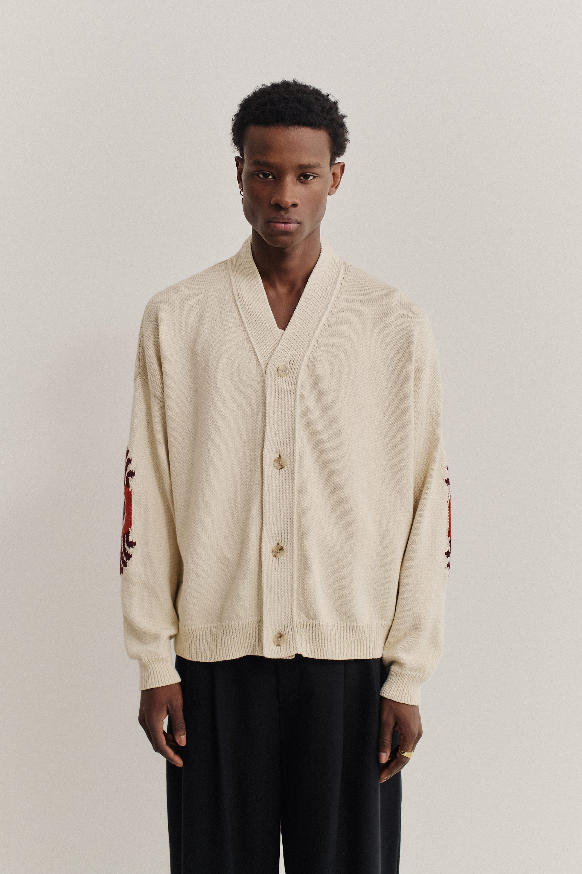 PRODUCT: The Sengo Knit Cardigan has a slightly cropped, boxy fit with a deep v-neck and dropped shoulders. Finished with ribbed cuffs and hem, and embroidered elements on the elbows.