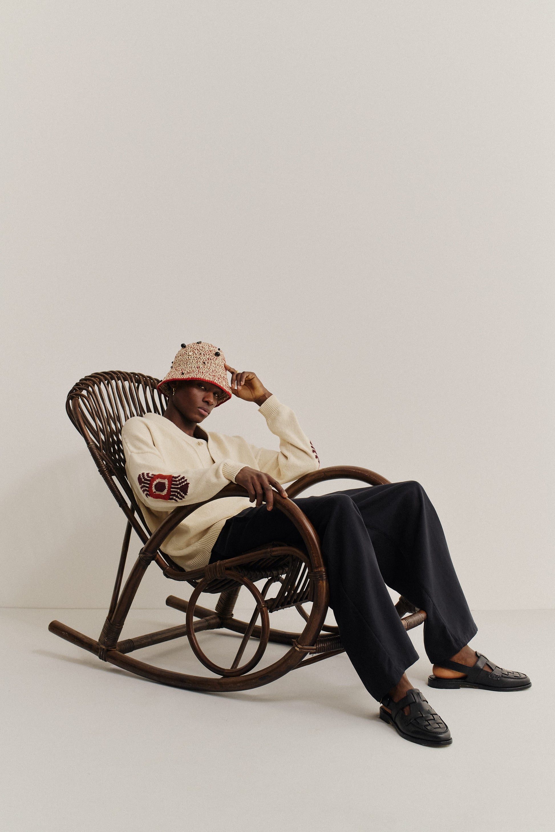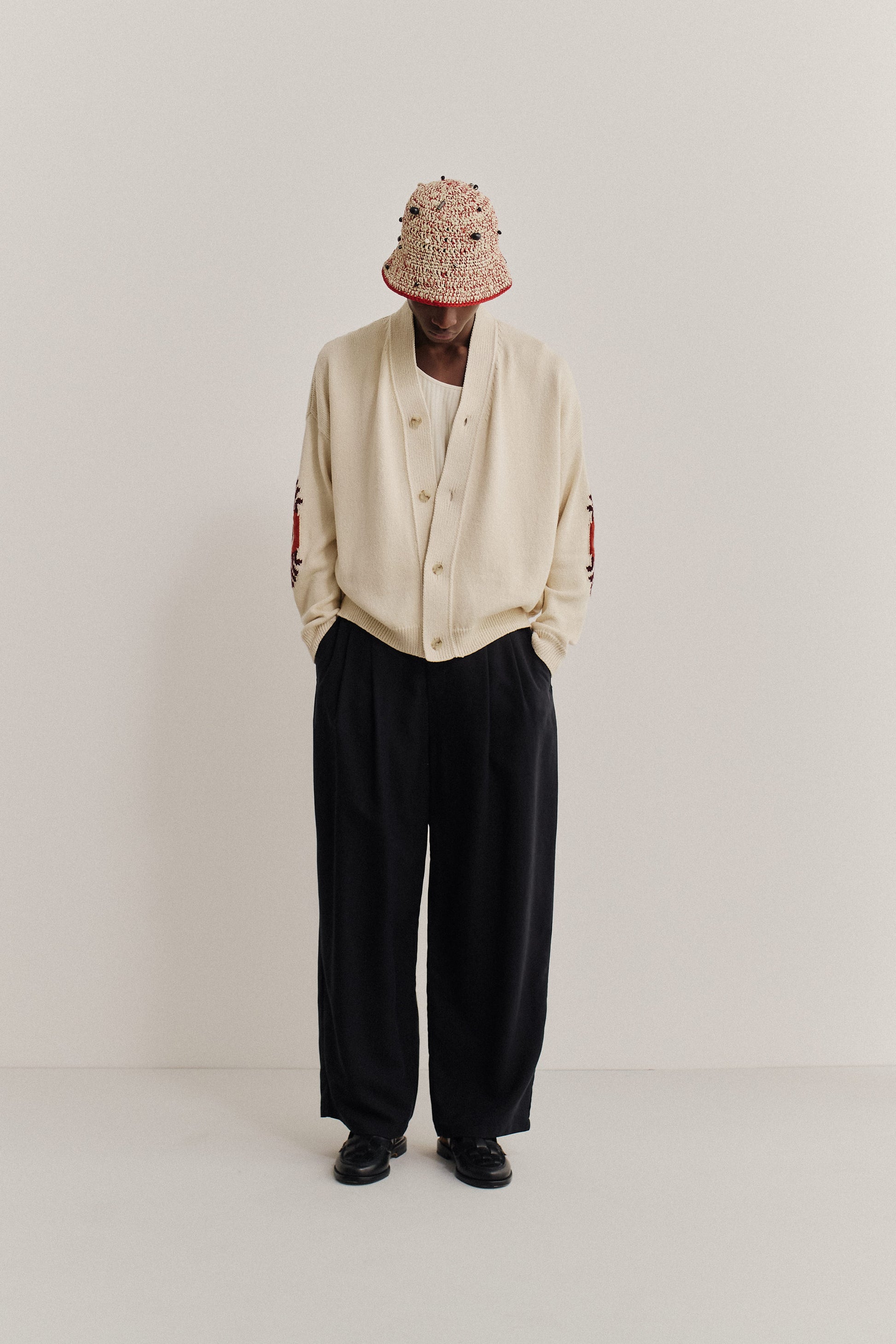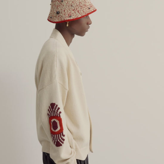 PRODUCT: The Sengo Knit Cardigan has a slightly cropped, boxy fit with a deep v-neck and dropped shoulders. Finished with ribbed cuffs and hem, and embroidered elements on the elbows.