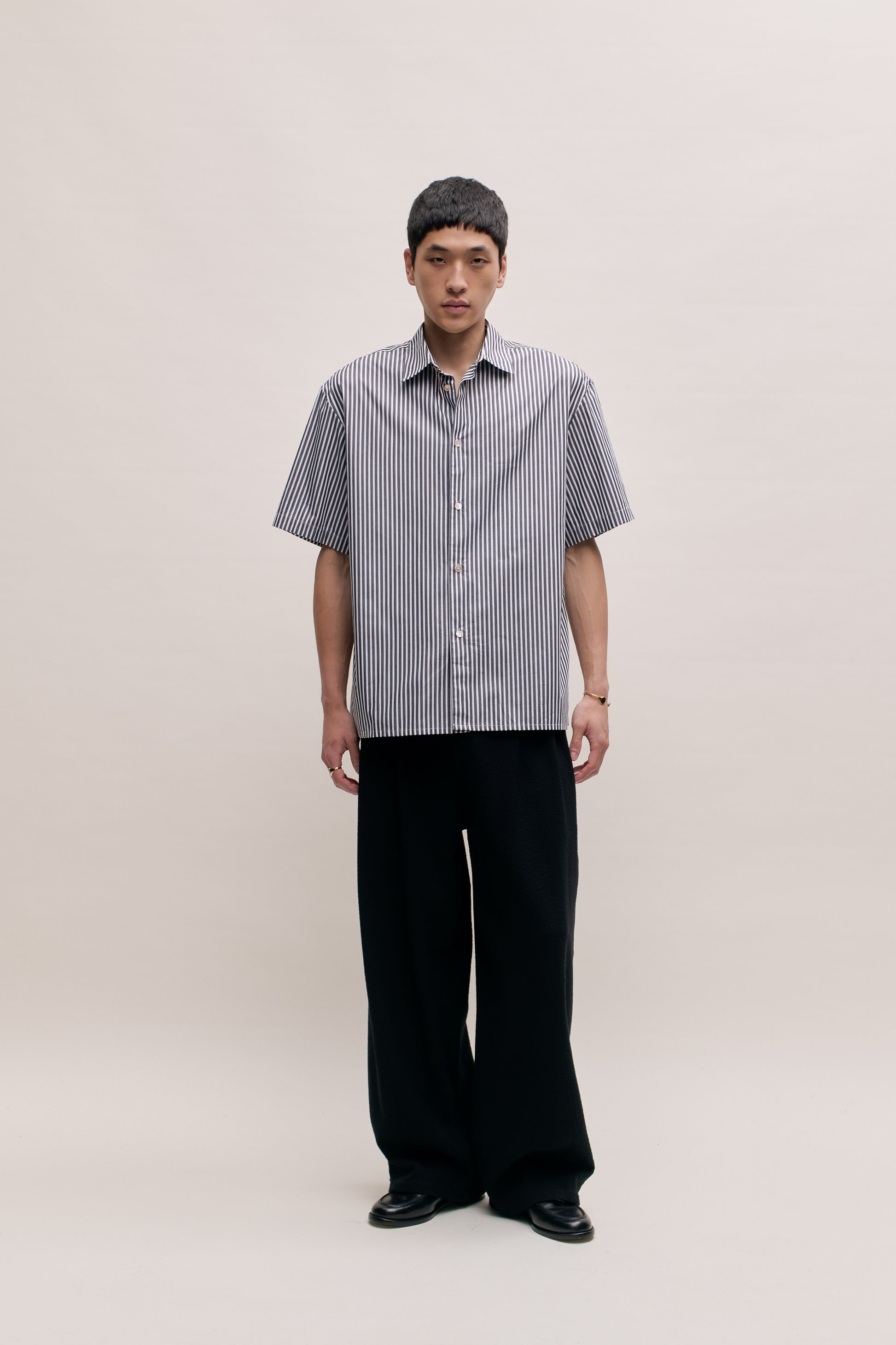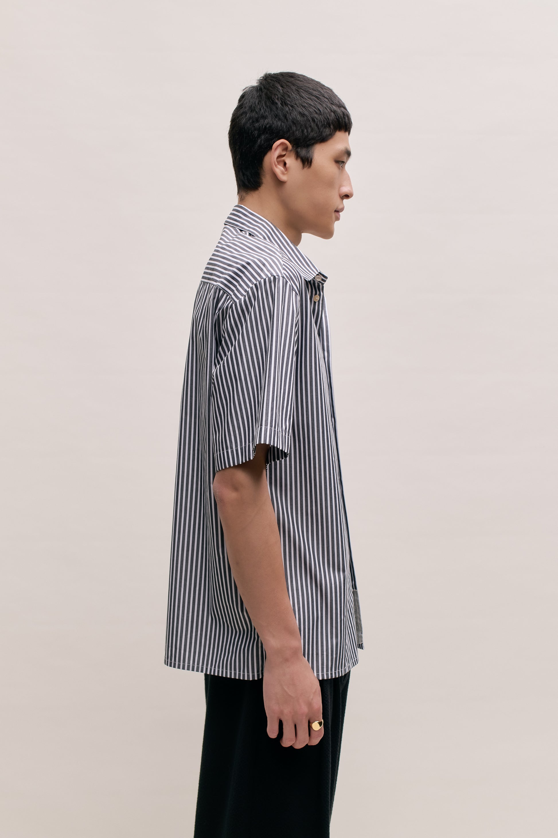 €150PRODUCT: Short-sleeved shirt with a boxy fit featuring slightly dropped shoulders, a straight hem, and side seam slit.