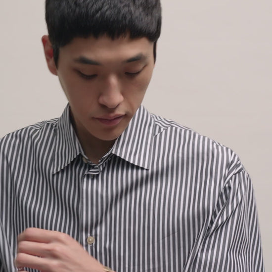FABRIC: Lightweight cotton fabric with vertical stripes. Pre-washed for reduced shrinkage, featuring a clean surface and bold, contrasting look.