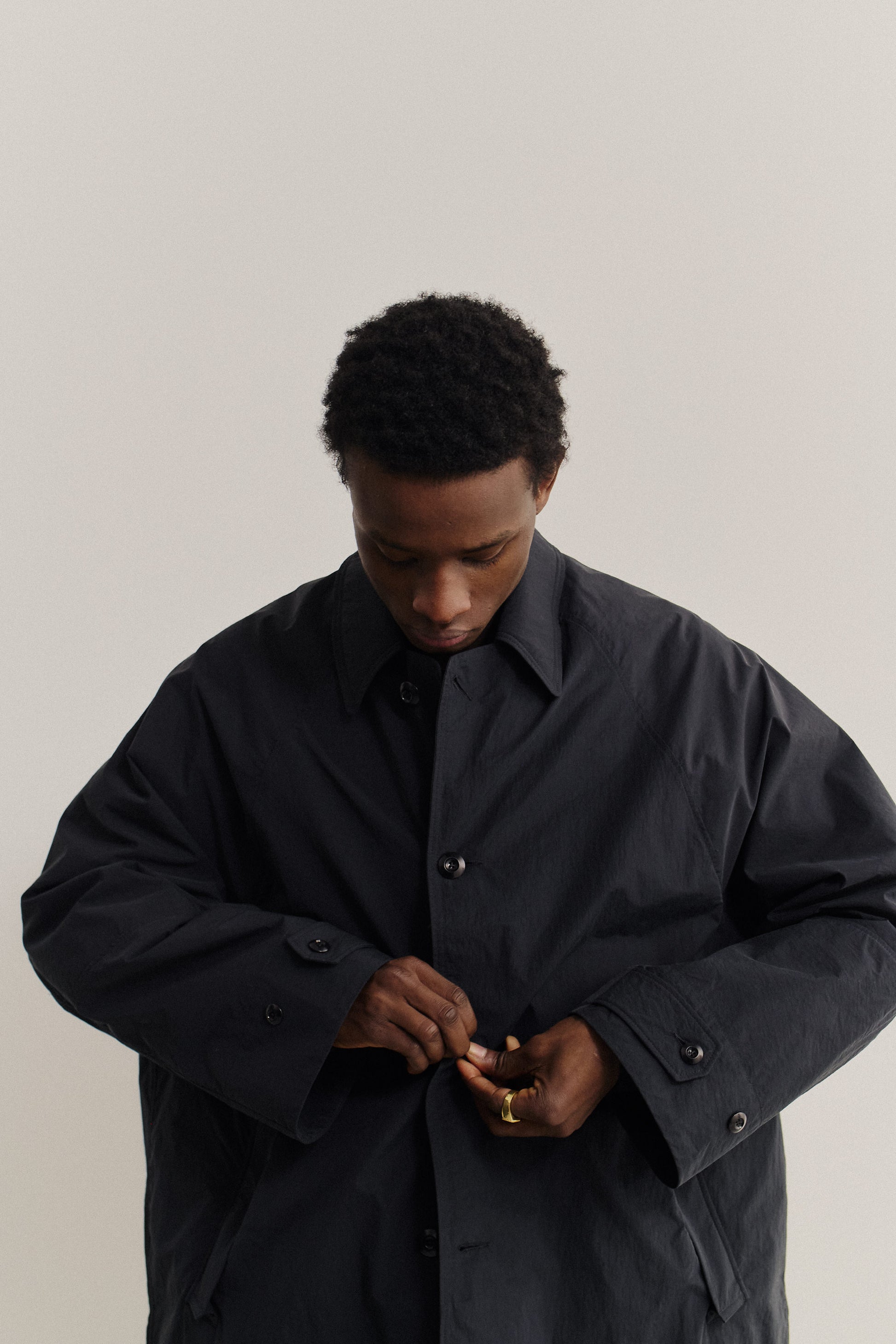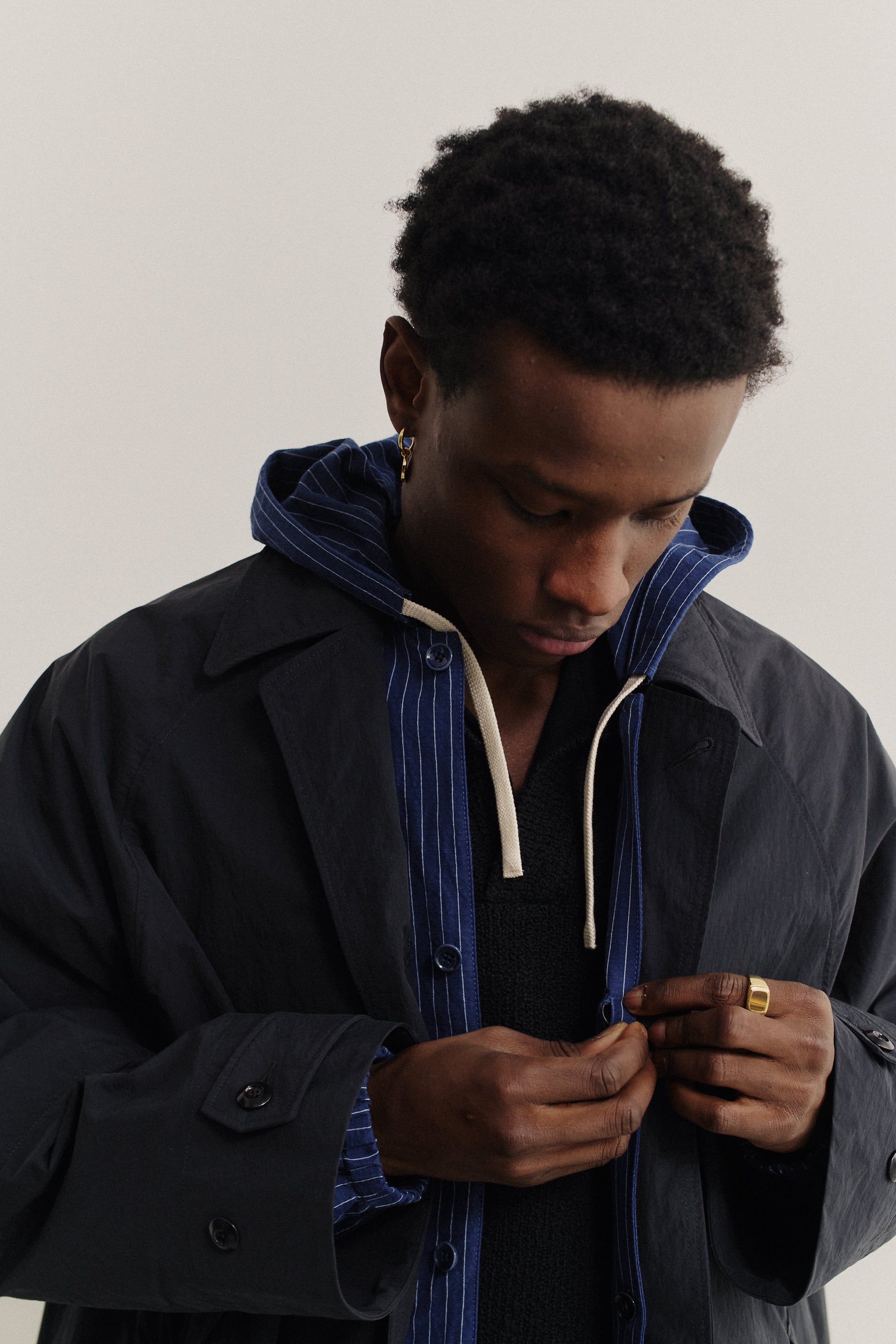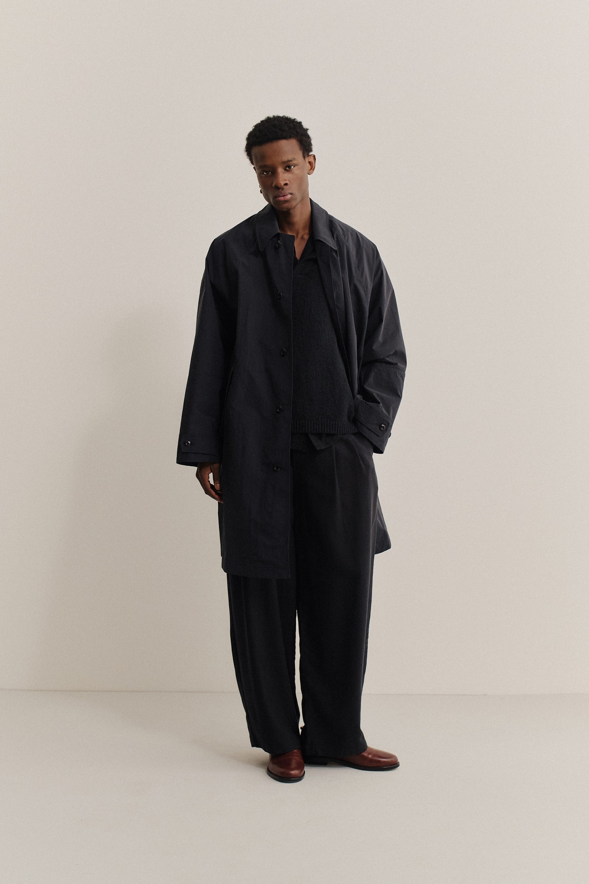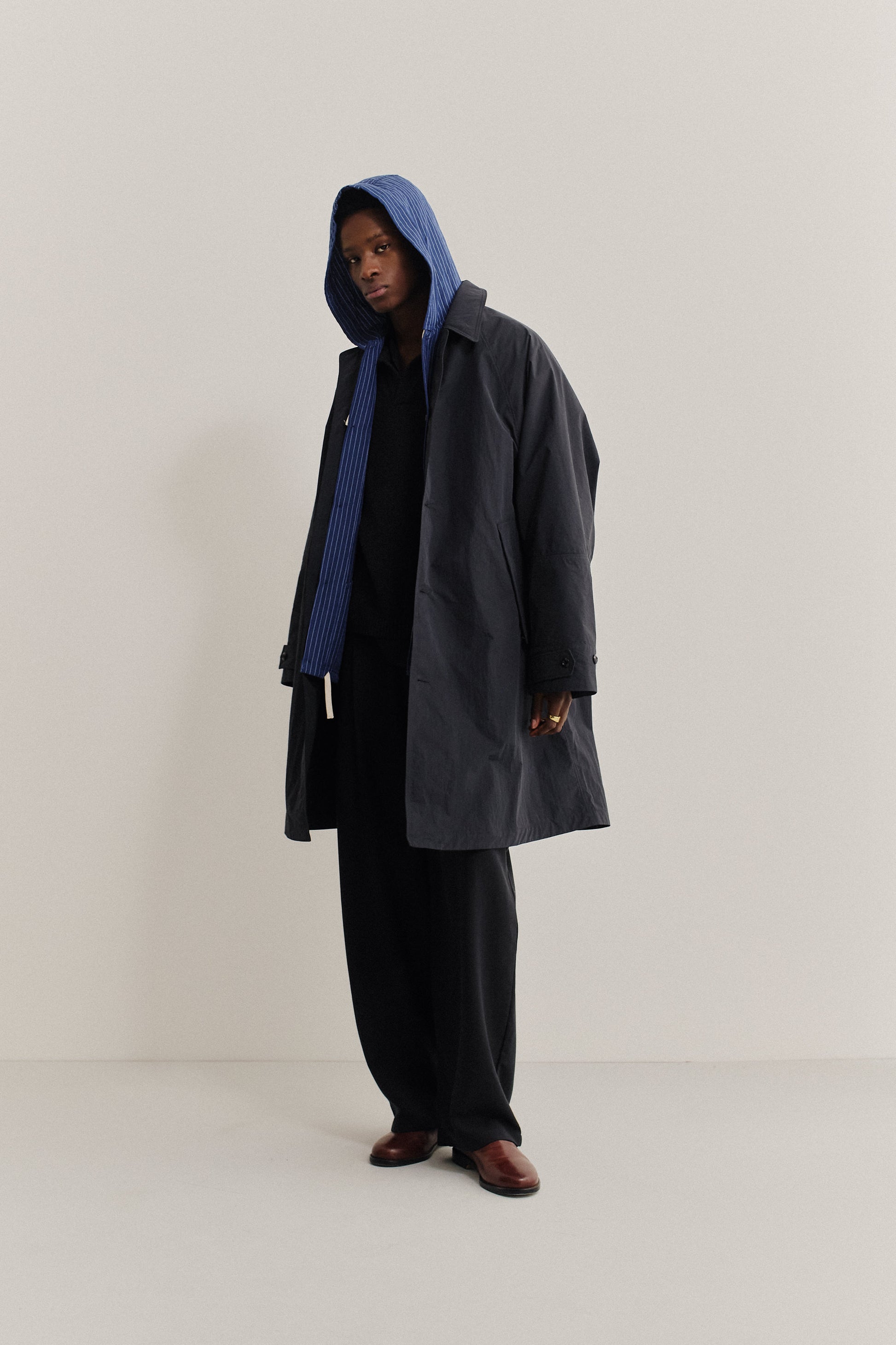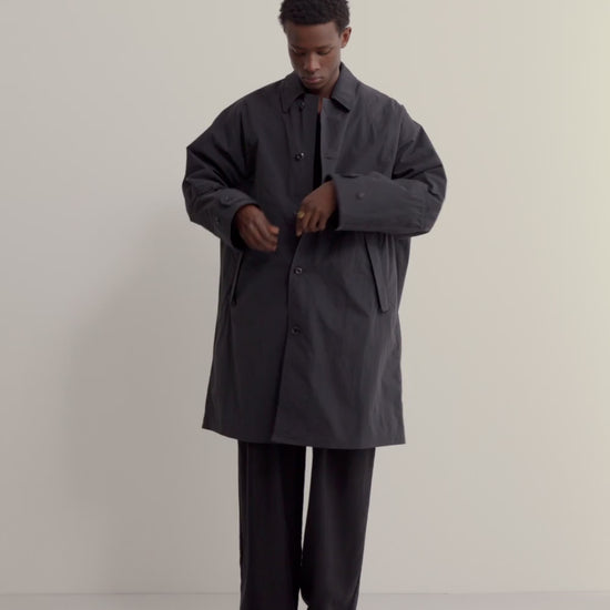 PRODUCT: The Serrara Mac features an oversized, water-repellent outer shell with a deconstructed silhouette, reverse collar, and adjustable cuffs. Functional details include zipped welt pockets and a hidden zipper pocket at the sleeve hem. Designed as a standalone piece, it can be worn independently or paired with the Tsavo Jacket, which is available separately.