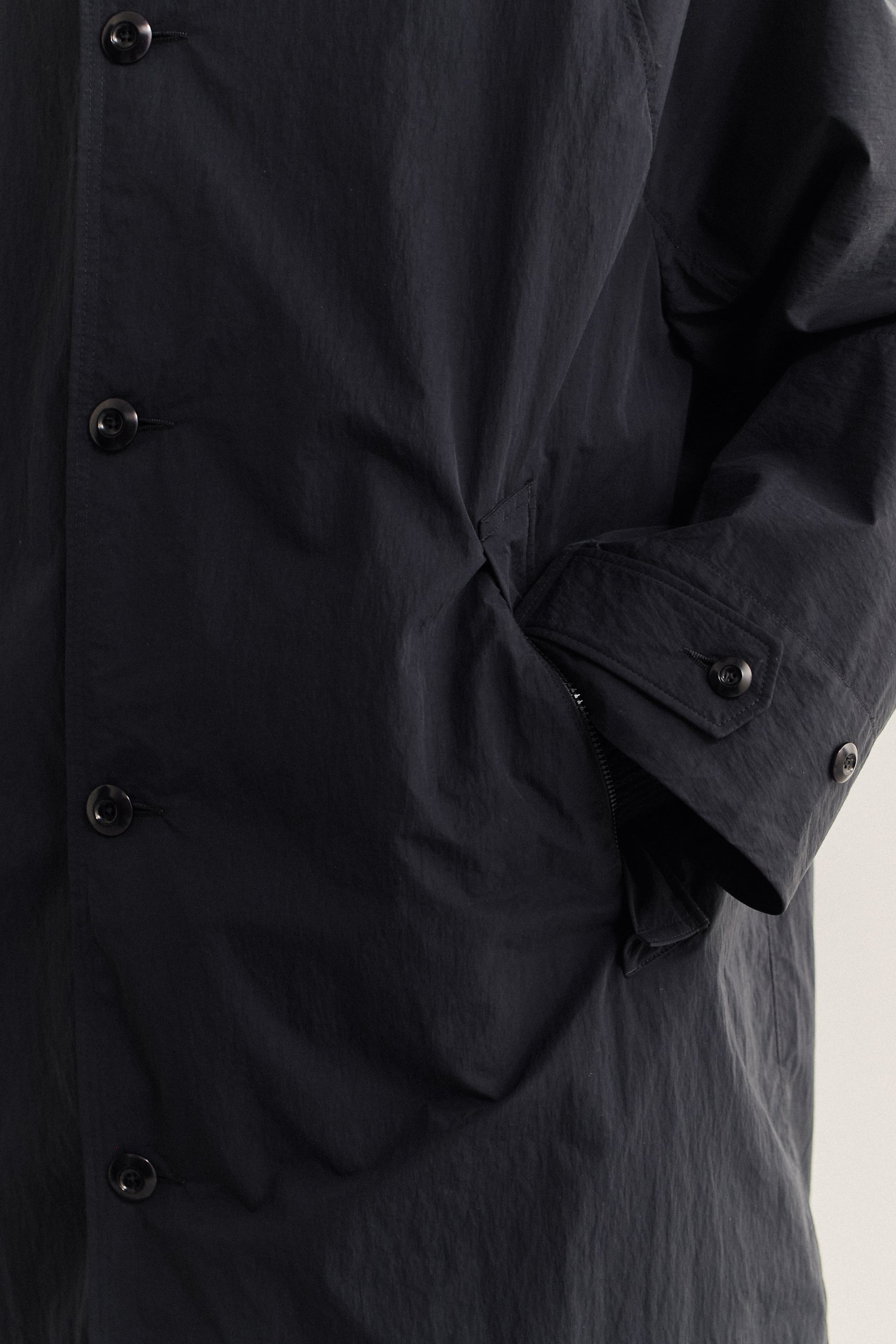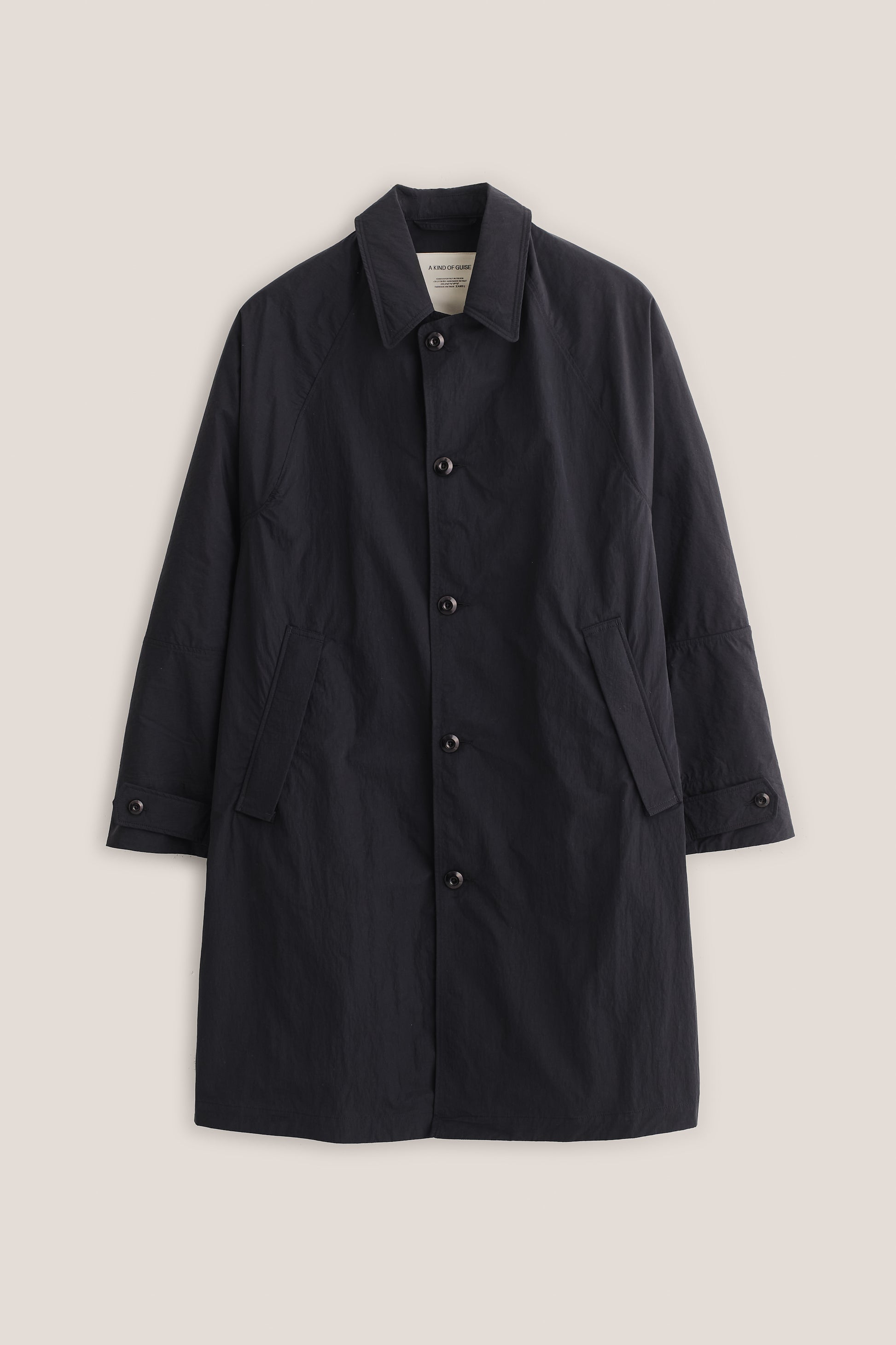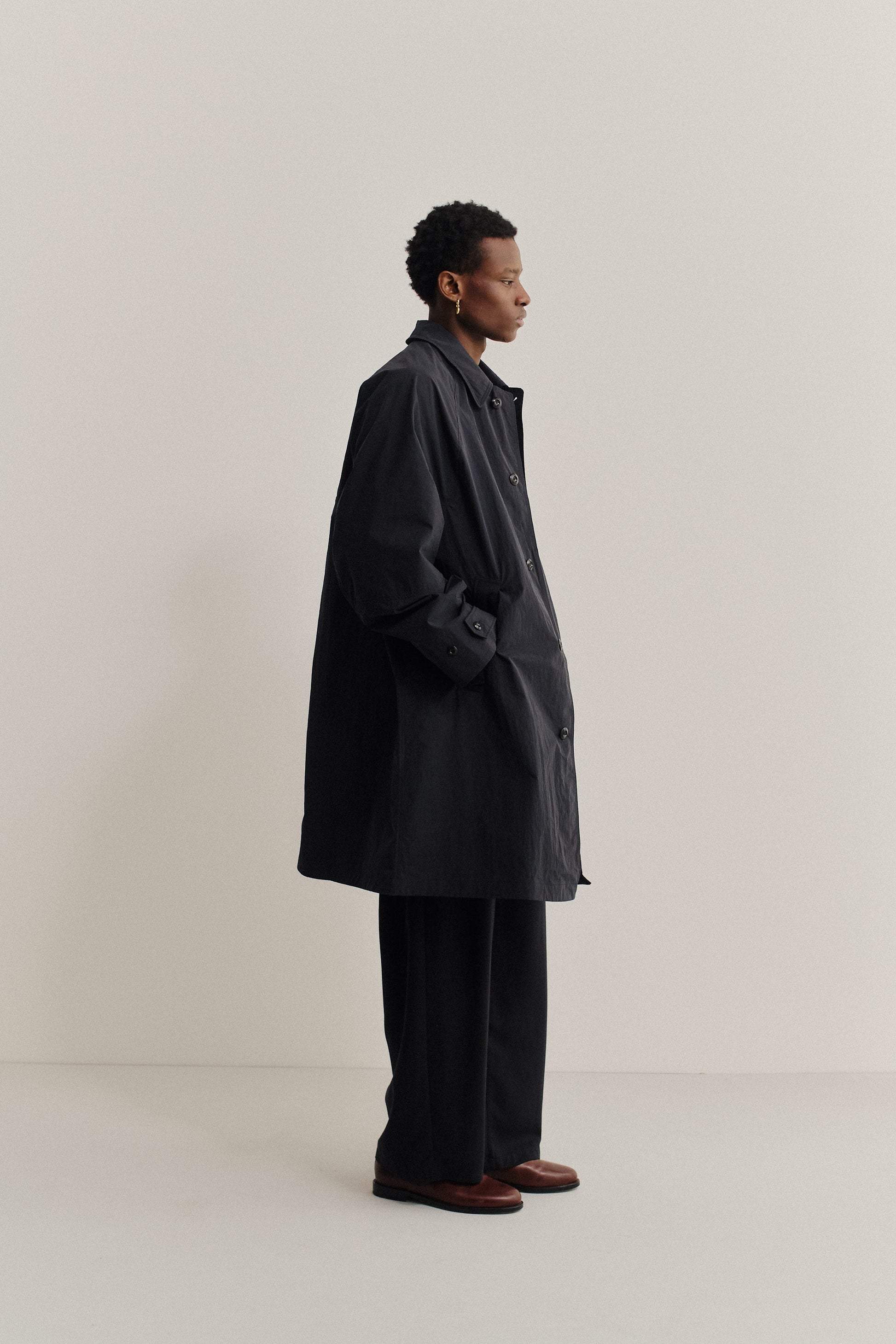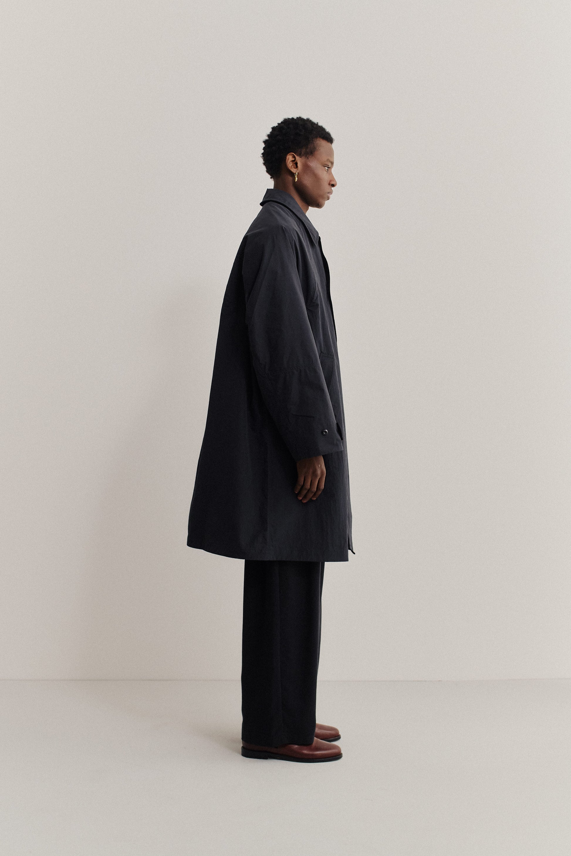 PRODUCT: The Serrara Mac features an oversized, water-repellent outer shell with a deconstructed silhouette, reverse collar, and adjustable cuffs. Functional details include zipped welt pockets and a hidden zipper pocket at the sleeve hem. Designed as a standalone piece, it can be worn independently or paired with the Tsavo Jacket, which is available separately.