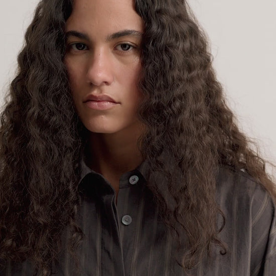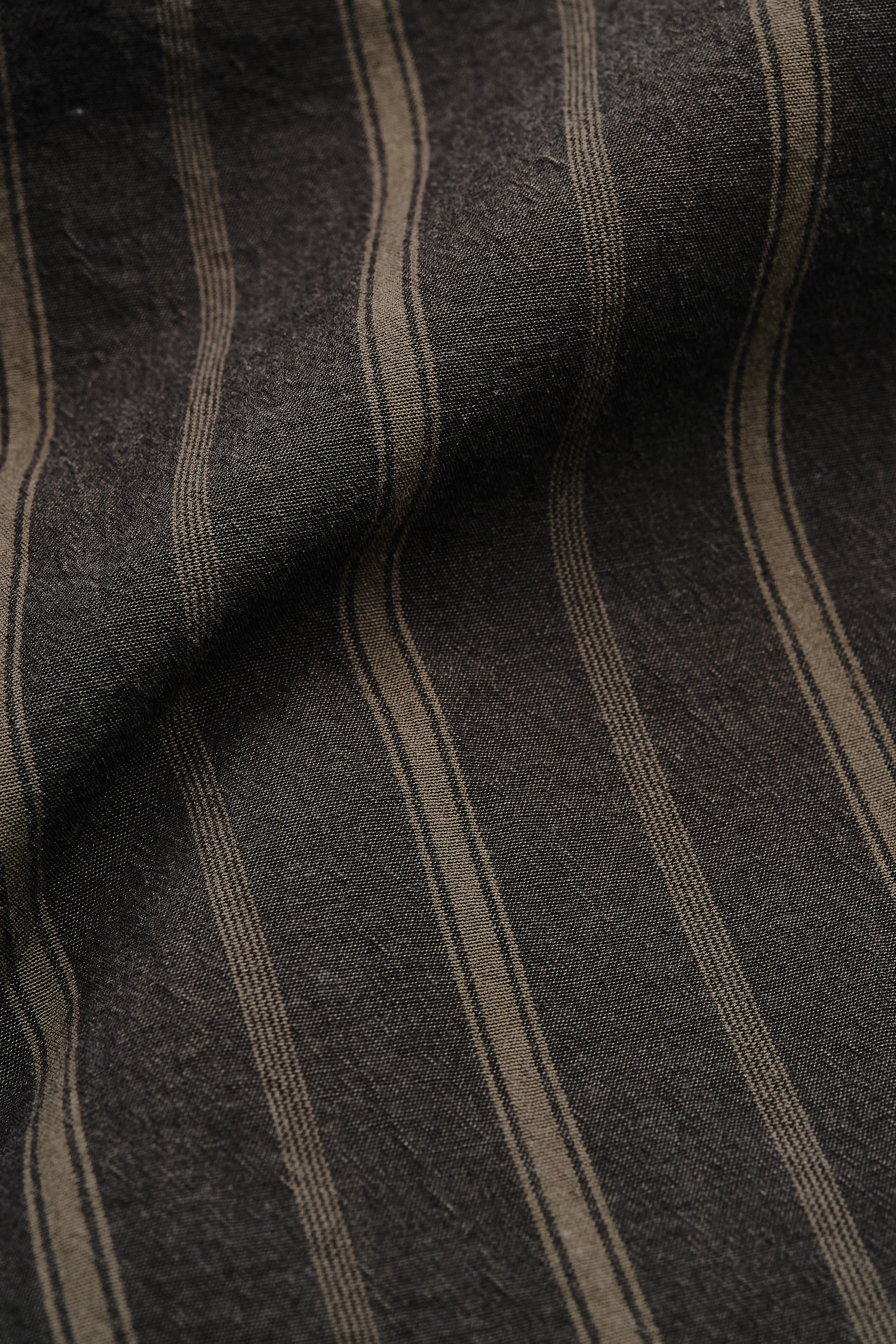 FABRIC: Woven fabric made from 100% cotton, with a dark base and beige and brown stripes in varying widths and textures. Yarn-dyed to enhance depth and richness of color.