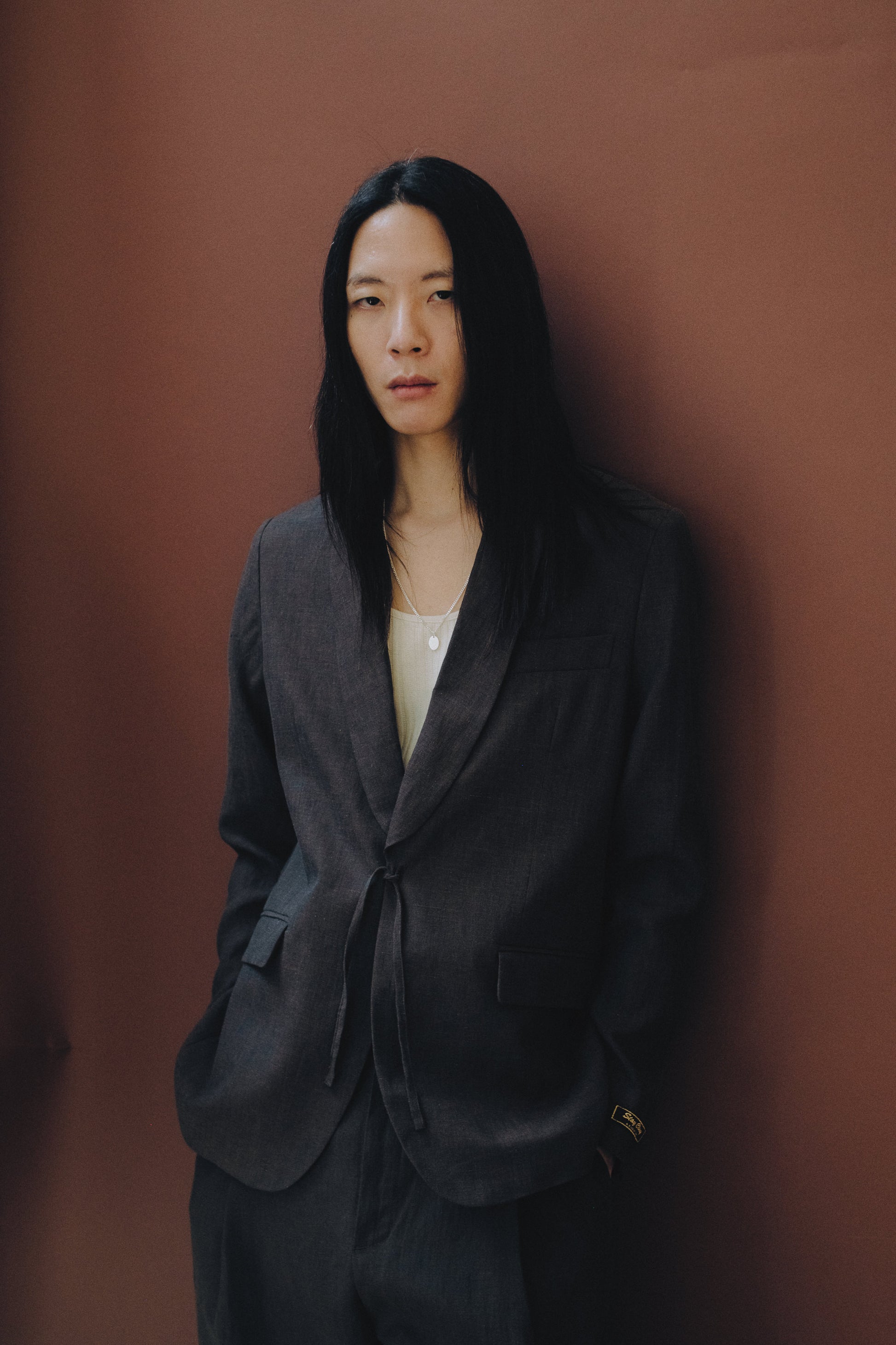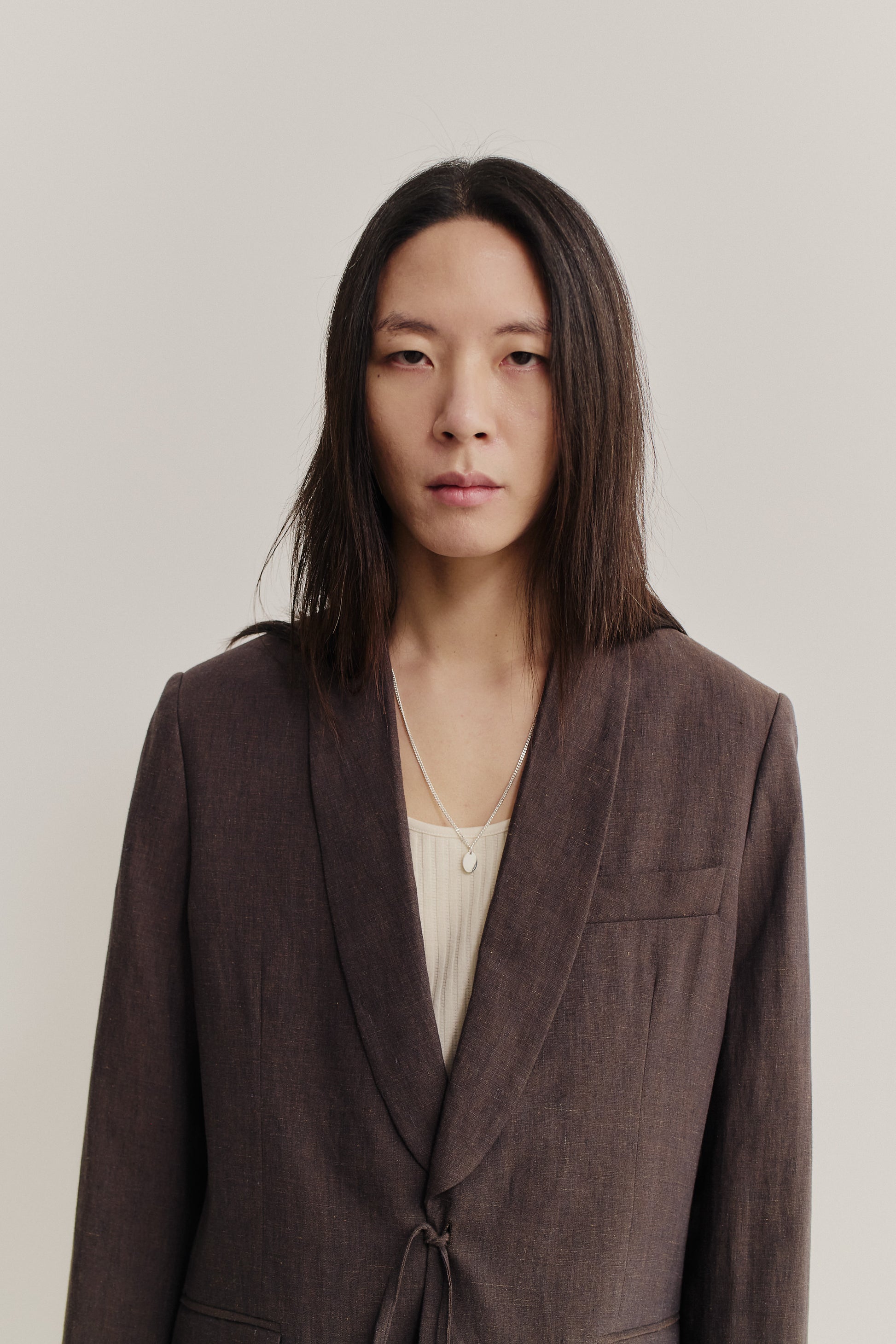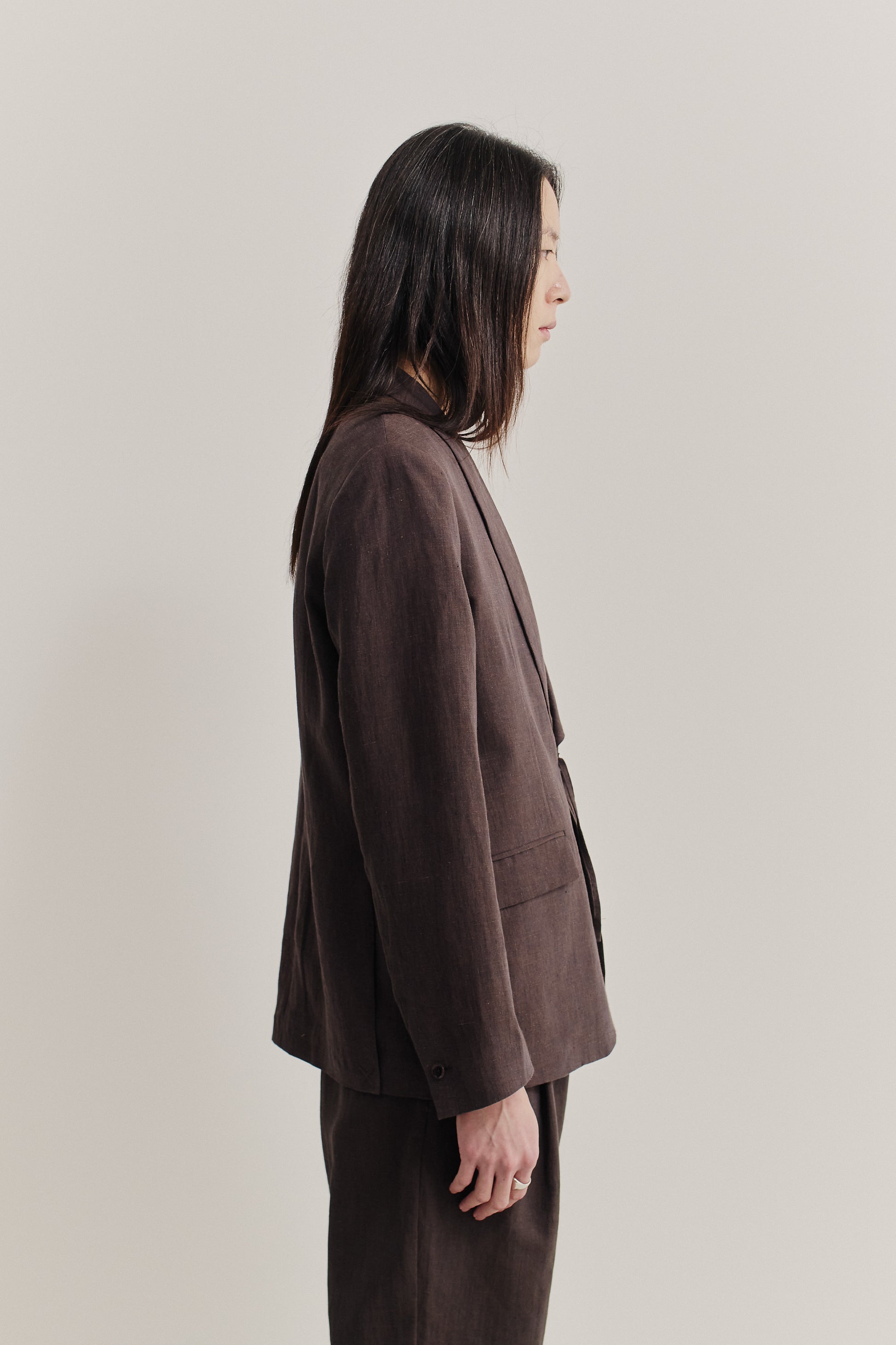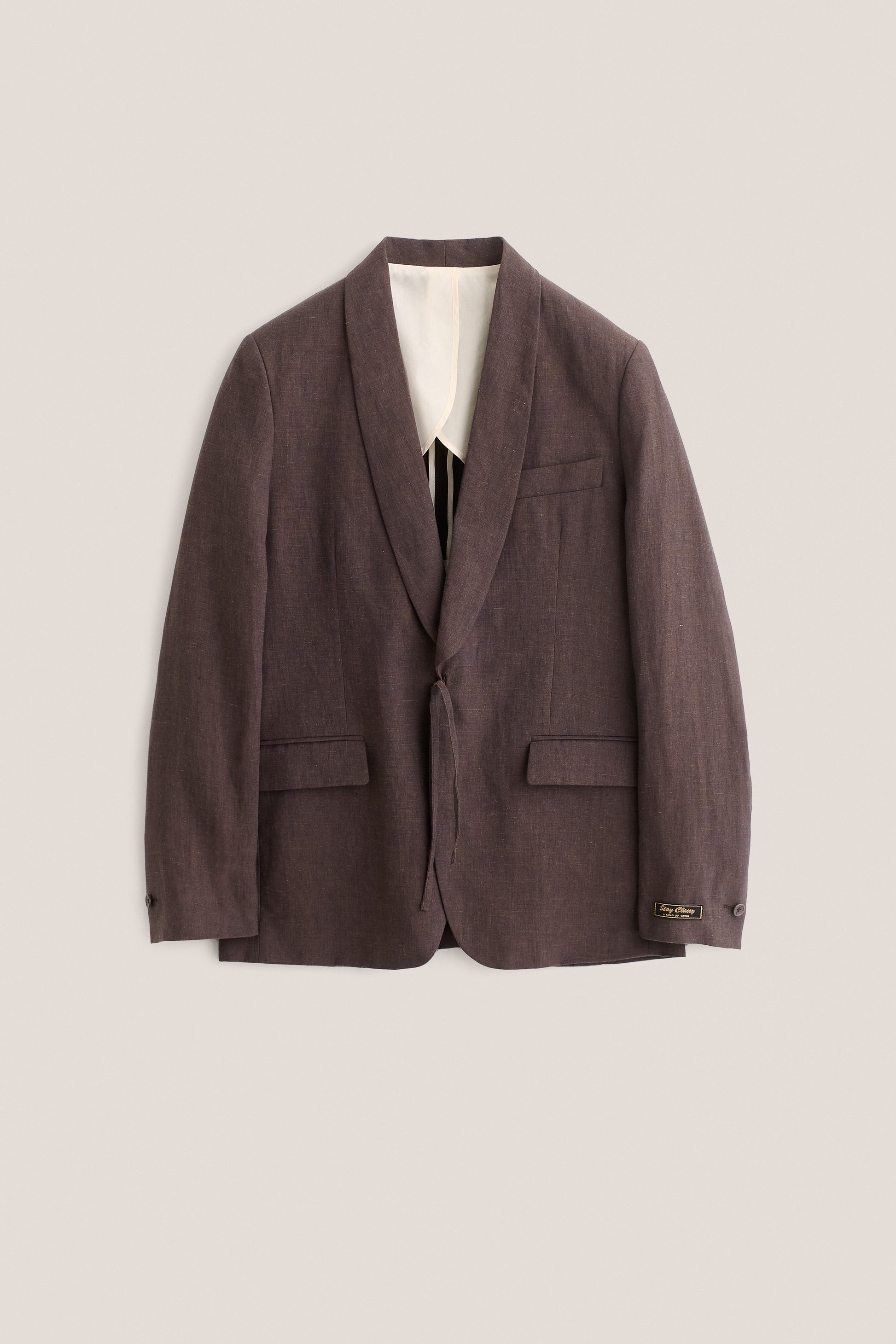 PRODUCT: The Shinji Blazer has a trim silhouette. It features a refined shawl collar, two flap pockets, a welt chest pocket, and a kimono-inspired cord closure. Completed with our signature ''stay classy'' label at the sleeve.