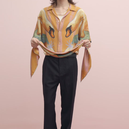PRODUCT: The Silk Scarf in Loving Swans features a fluid square silhouette and a custom-developed print pattern. Its smooth surface and soft drape allow it to be worn in various ways—around the neck, as a headscarf, or folded as an accent piece. The in-house motif lends the scarf a visual identity while maintaining a quiet elegance.