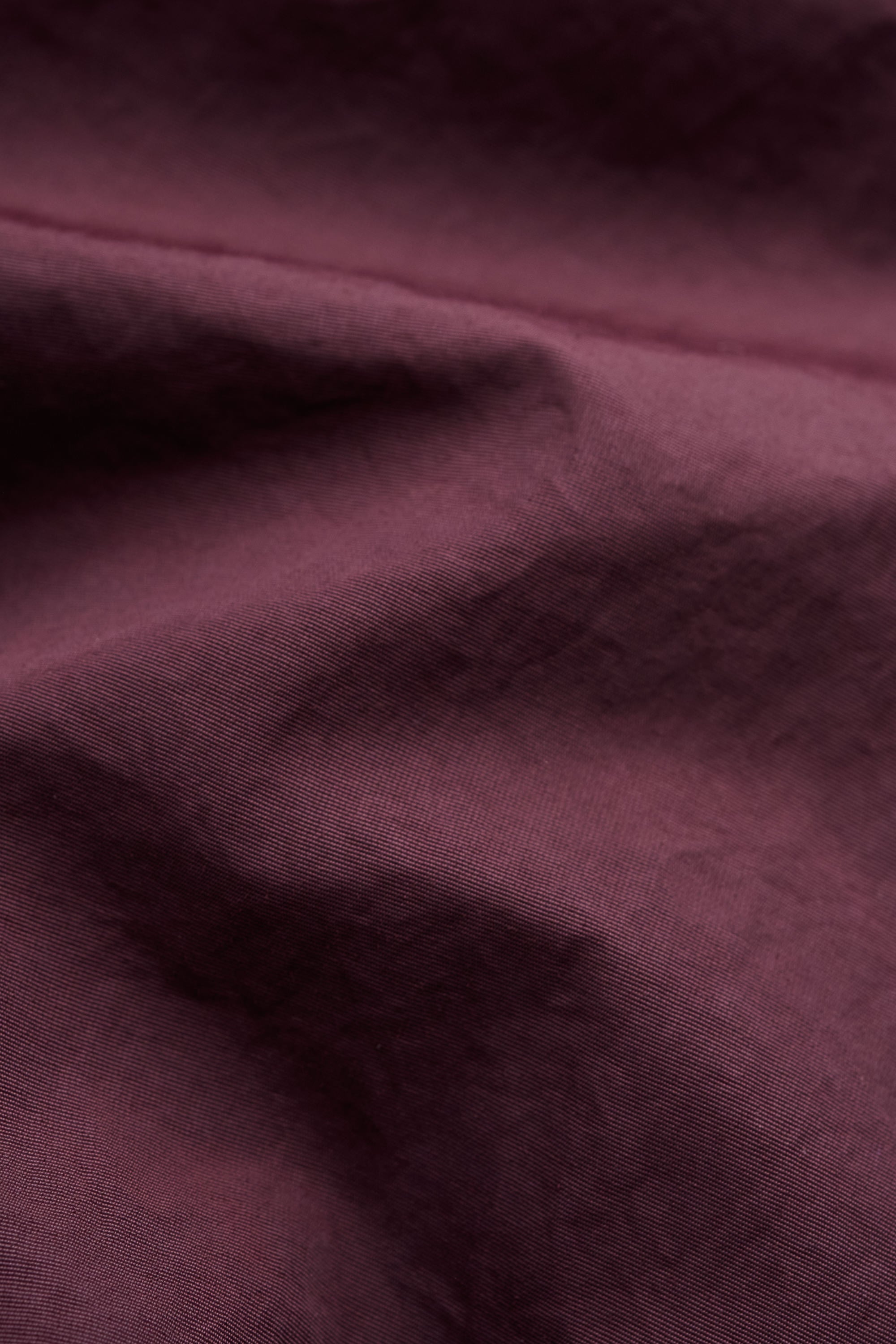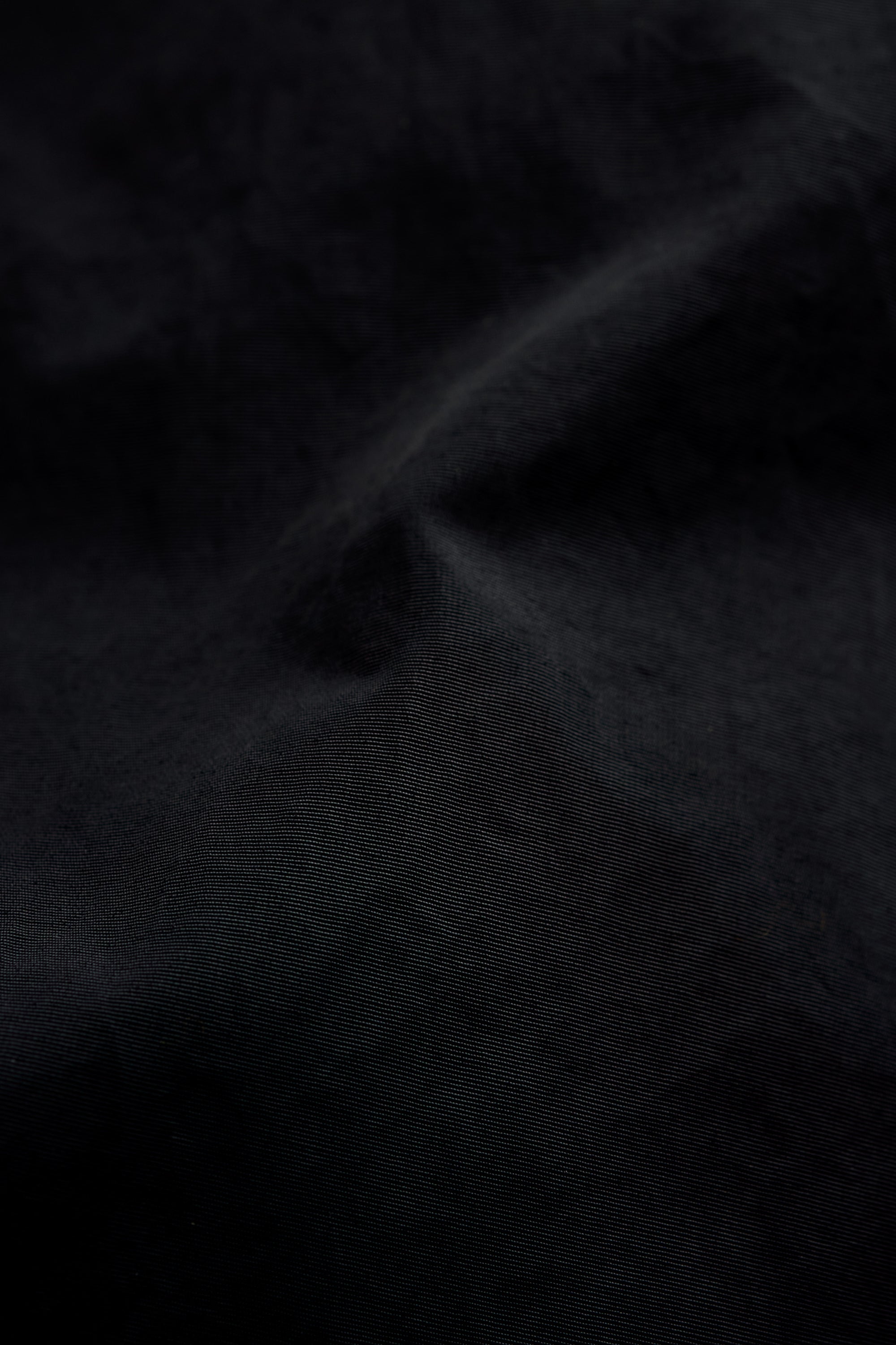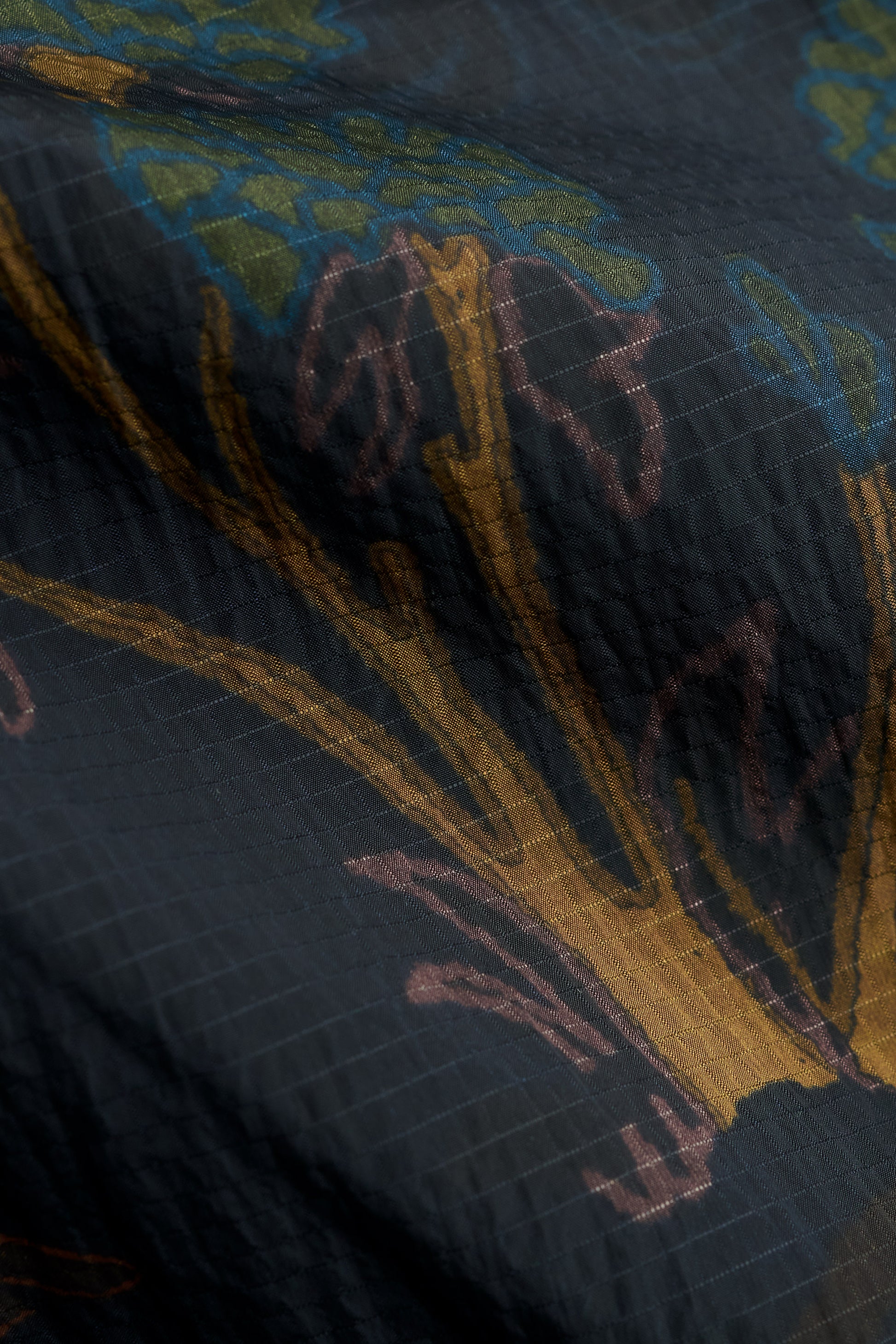 FABRIC: A lightweight ripstop tech fabric made from recycled polyamide, featuring a subtle grid structure and a crisp hand. Water-repellent and pfc-free, it is printed with an in-house designed pattern featuring stylized florals and animals in rich earthy tones on a dark ground.