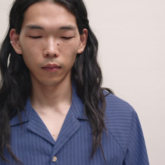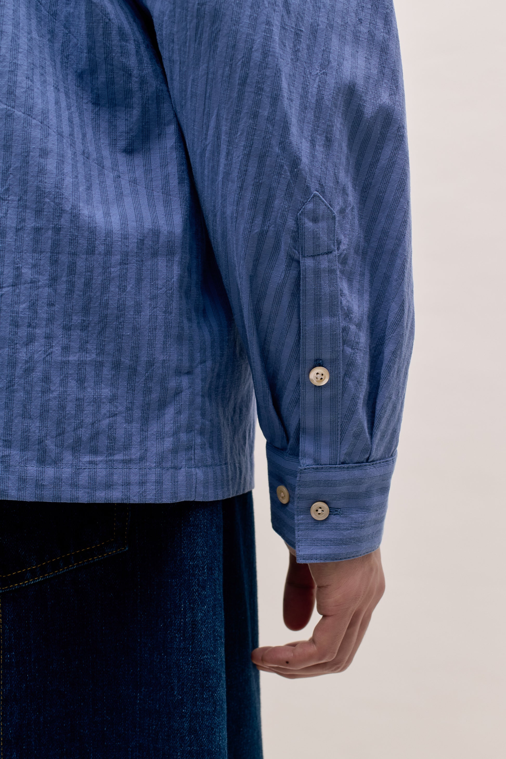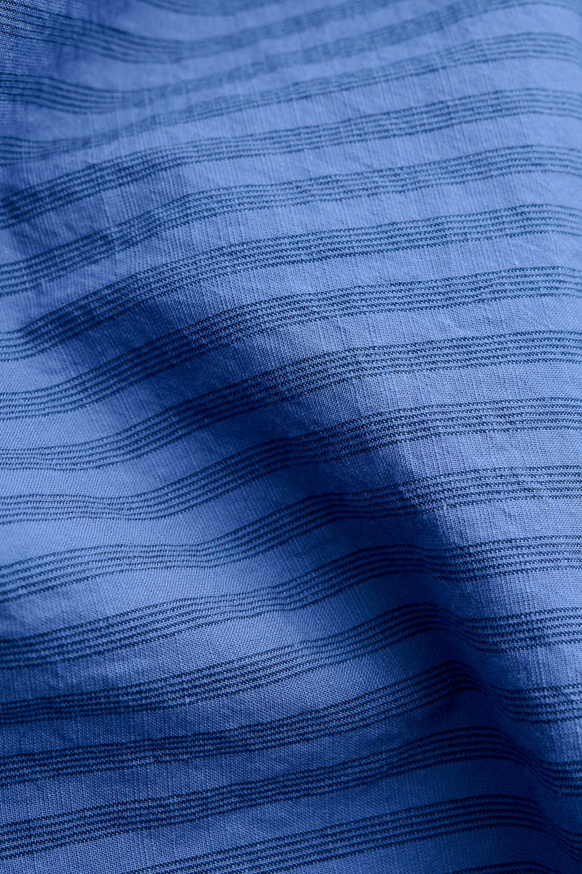 FABRIC: A crisp cotton fabric with a subtle ripple surface and a soft, peached outer side. The striped pattern introduces a clean, linear rhythm with a contemporary feel.