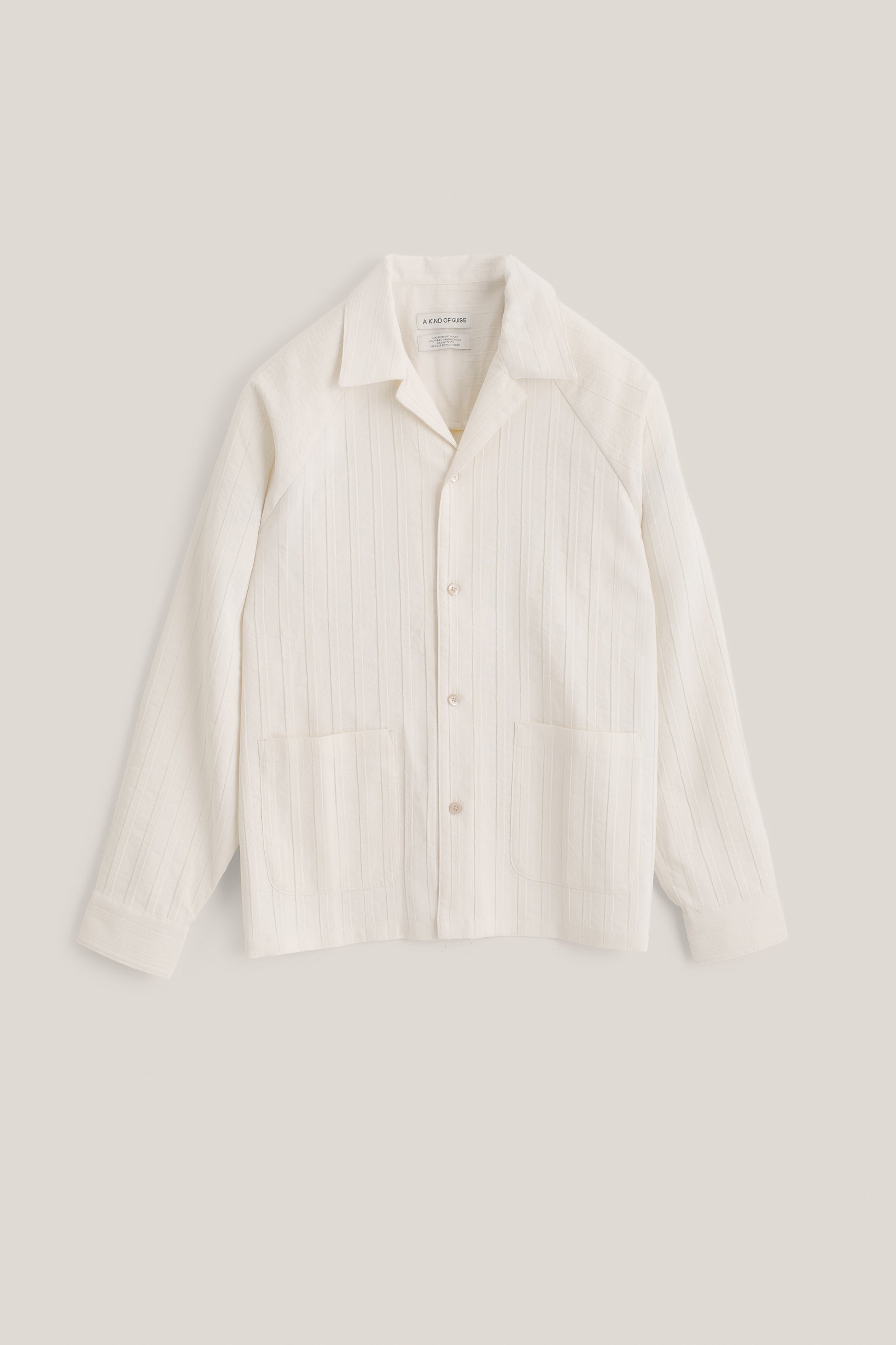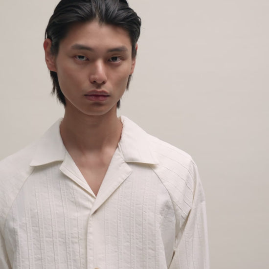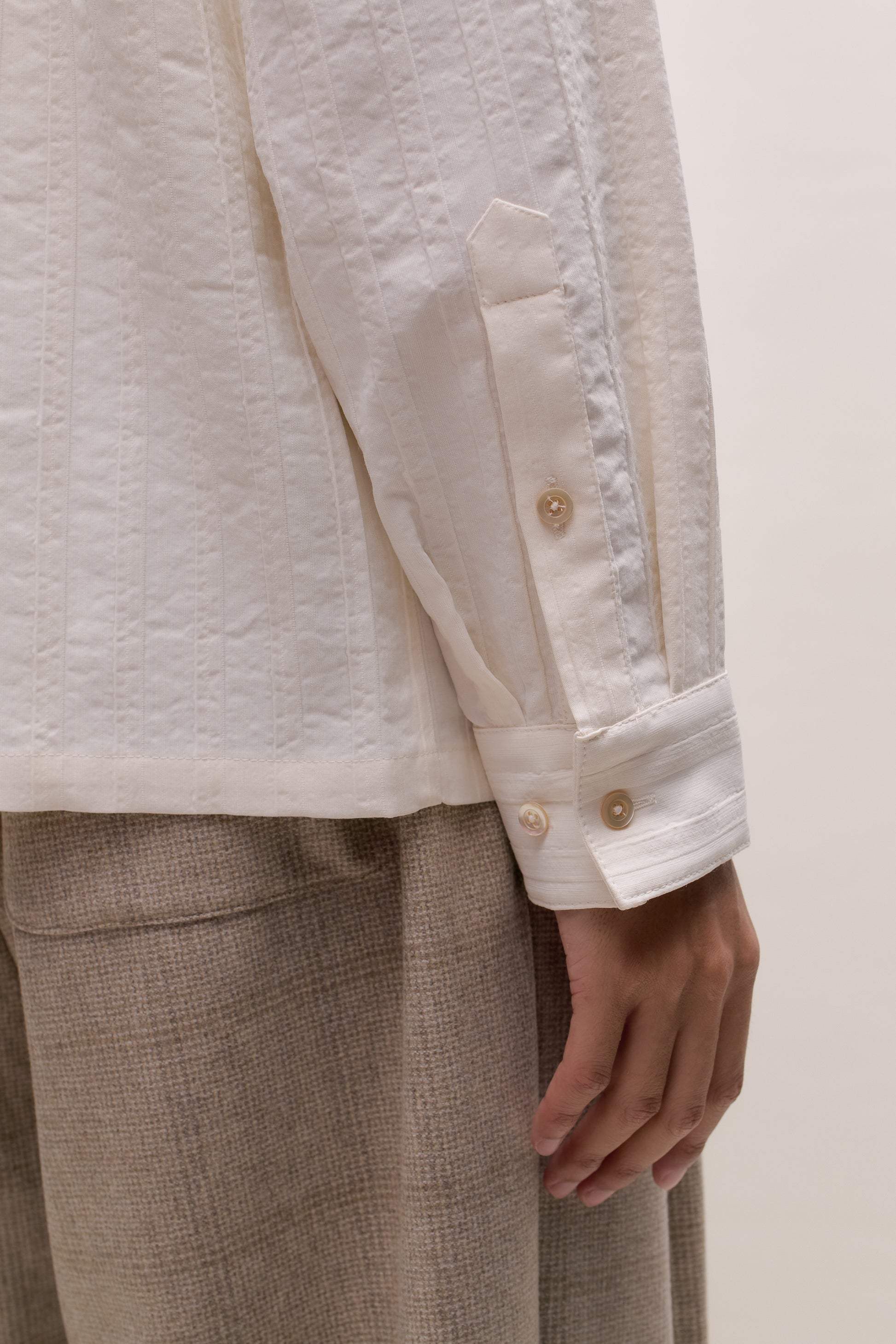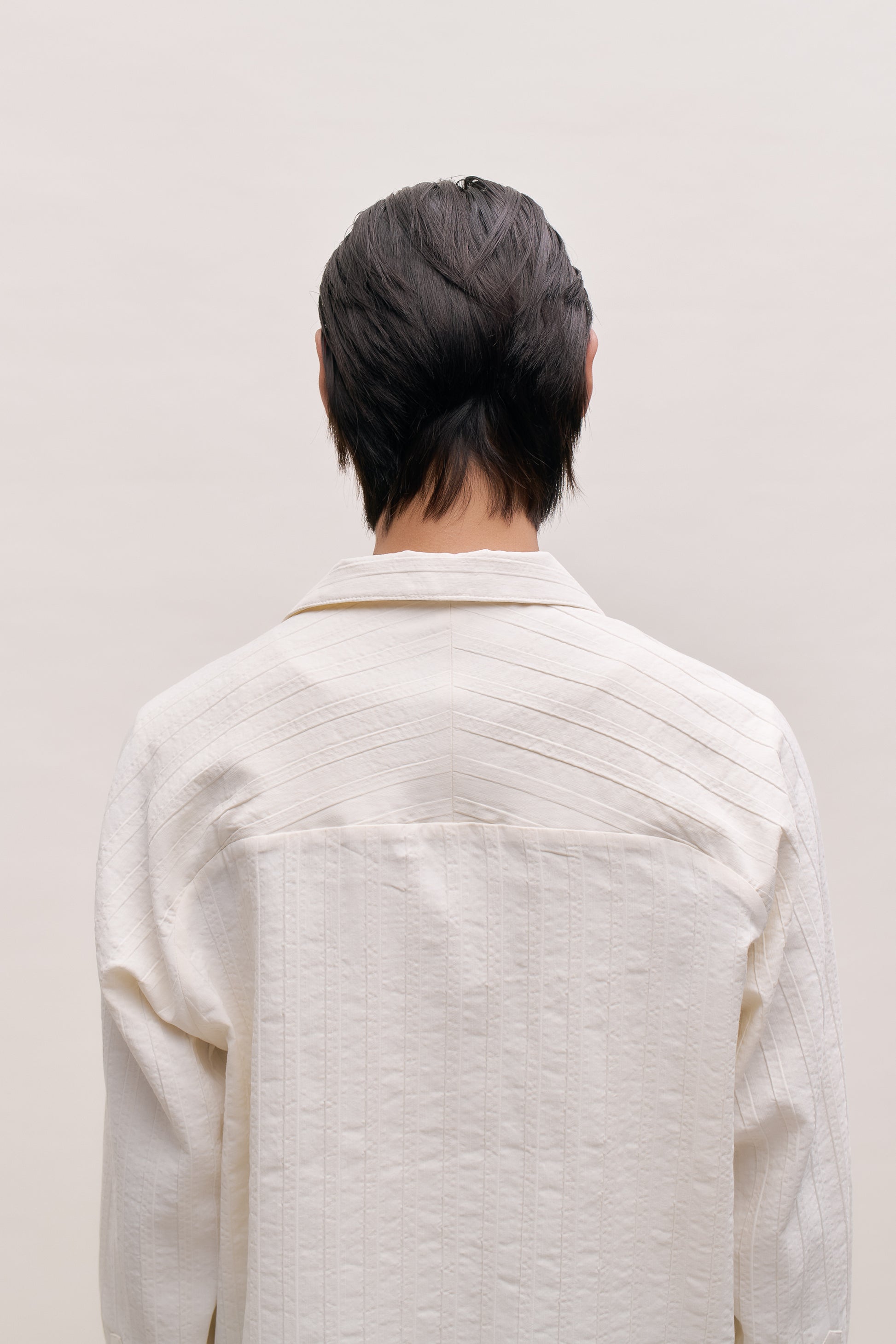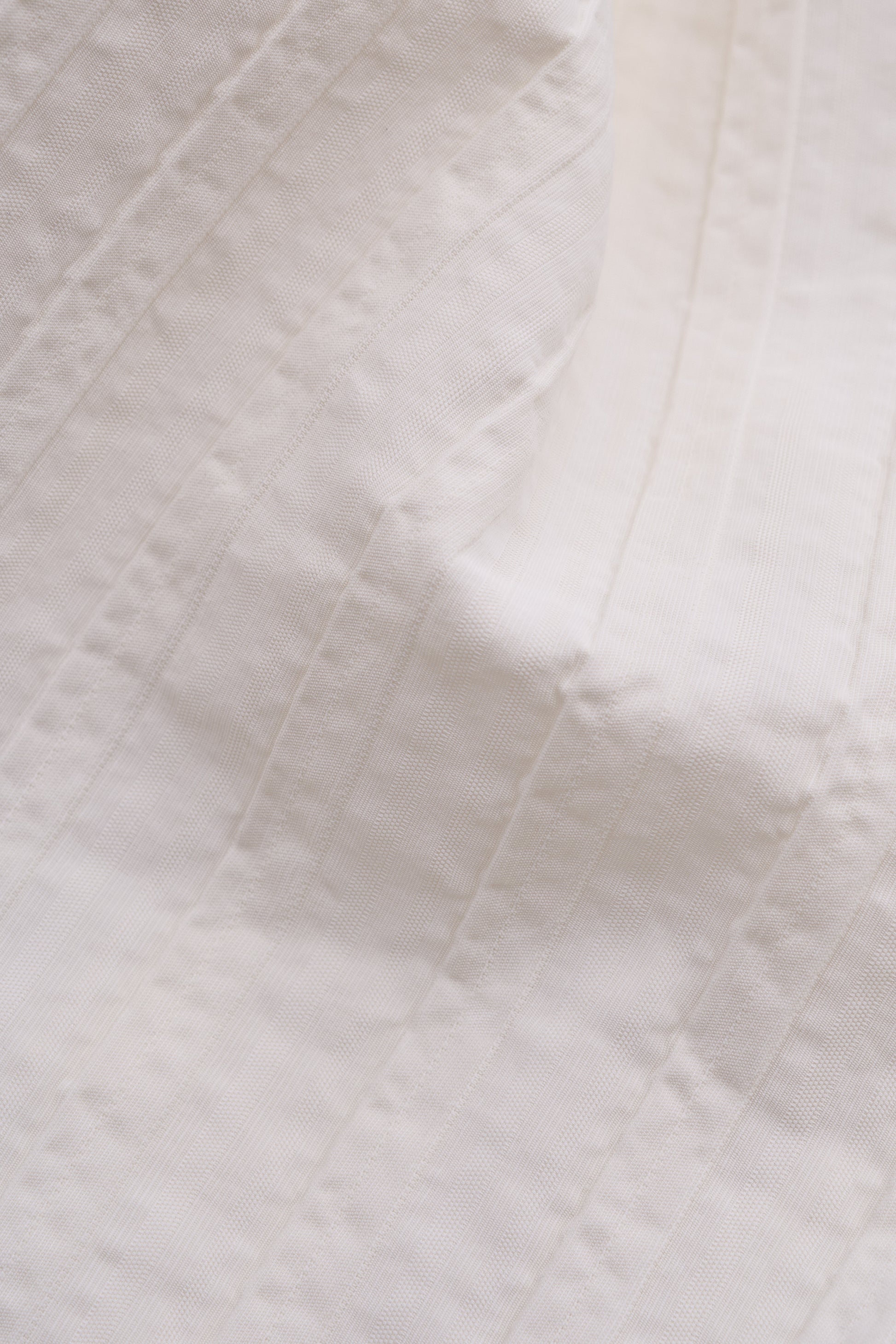 FABRIC: A viscose–wool blend seersucker fabric, featuring vertical stripes created by the characteristic puckered weave. The textured surface adds subtle depth and a refined, slightly crinkled appearance.