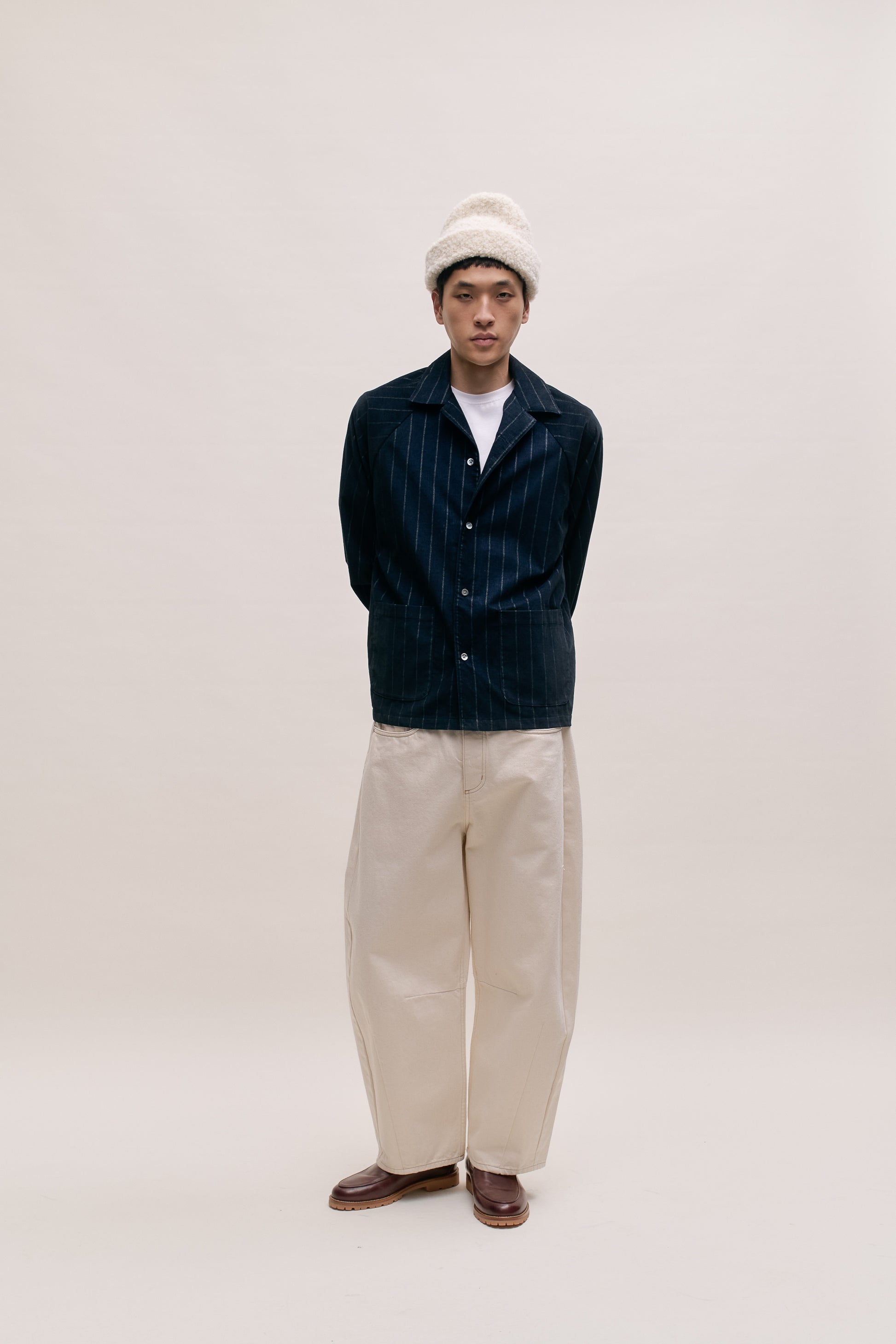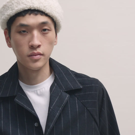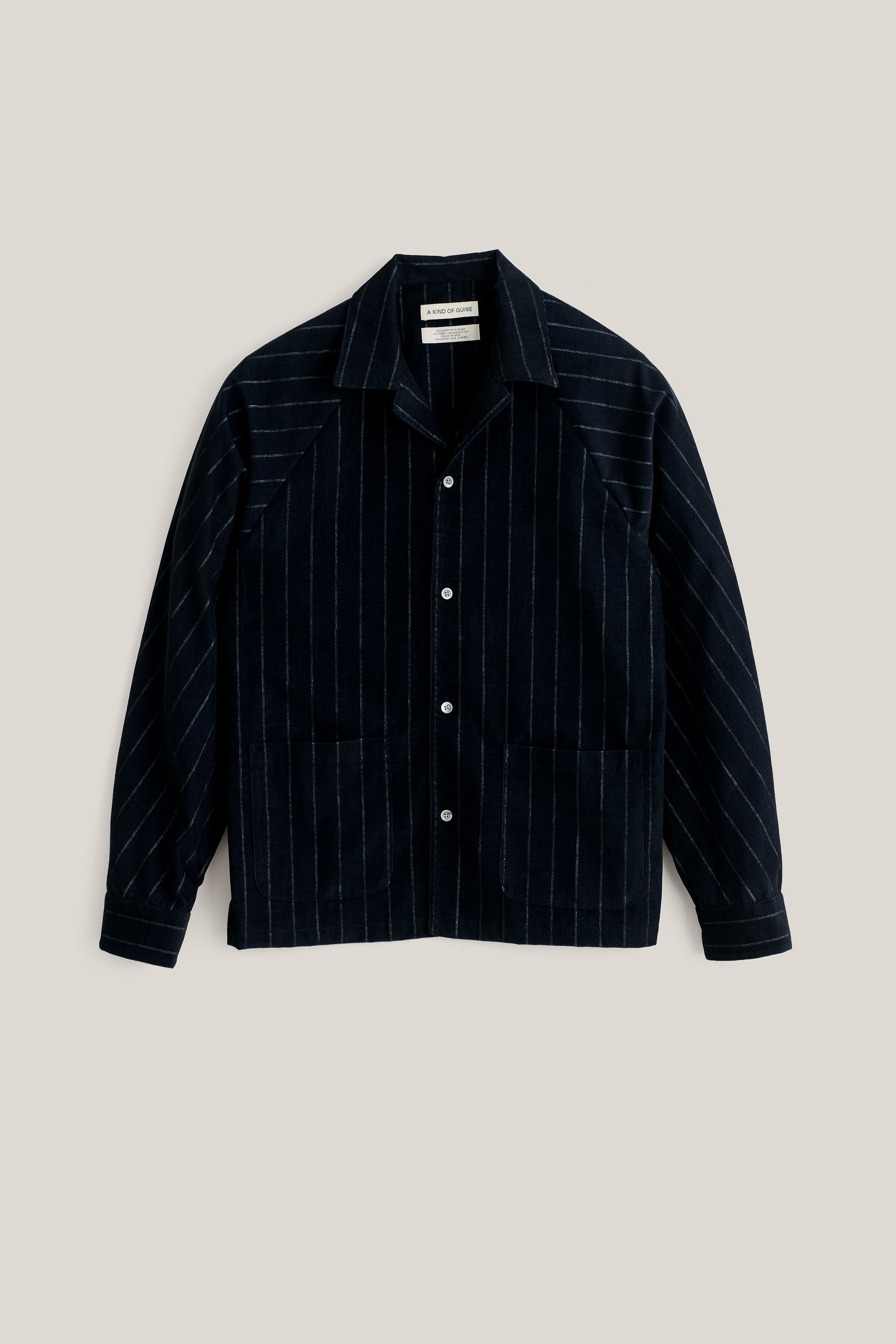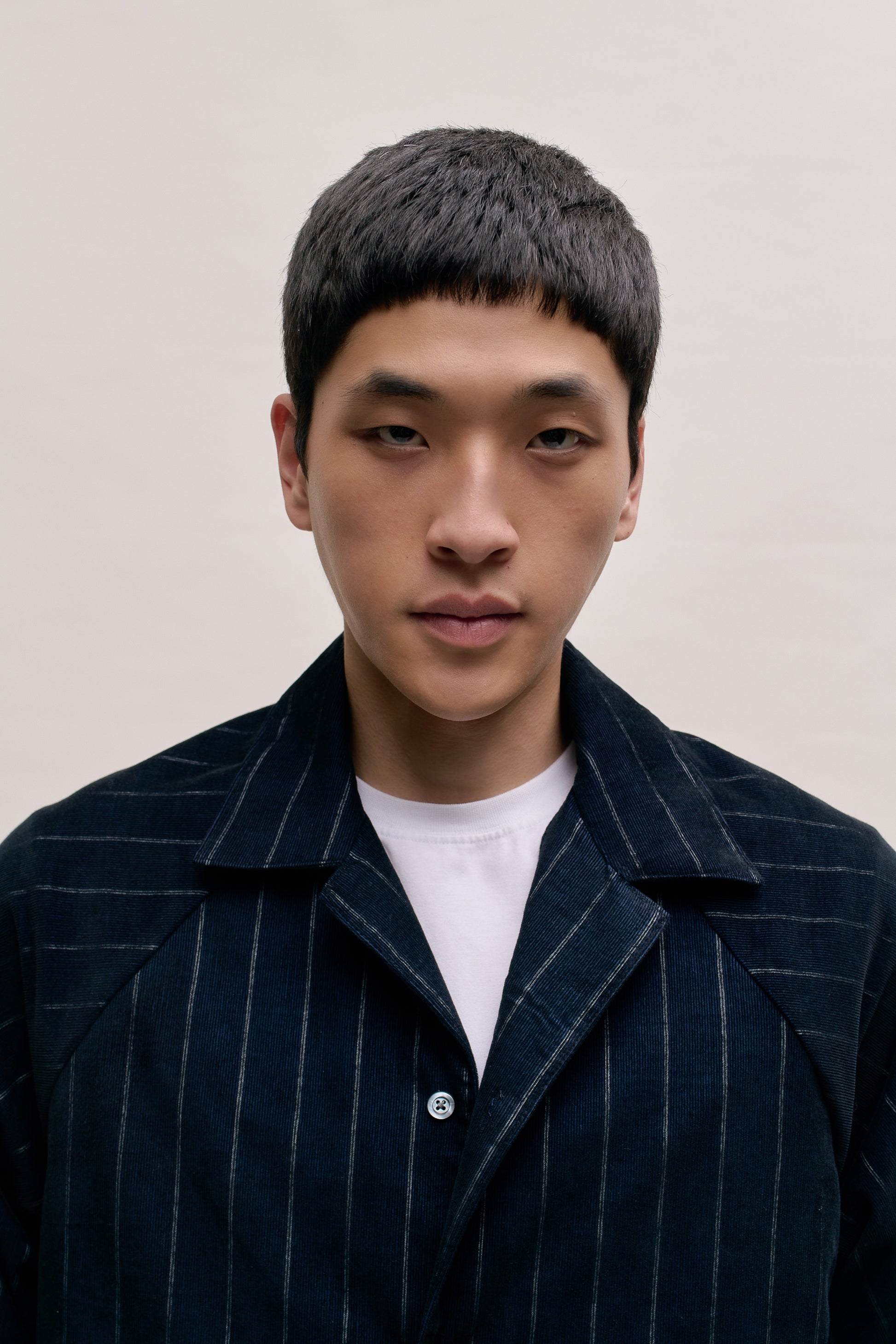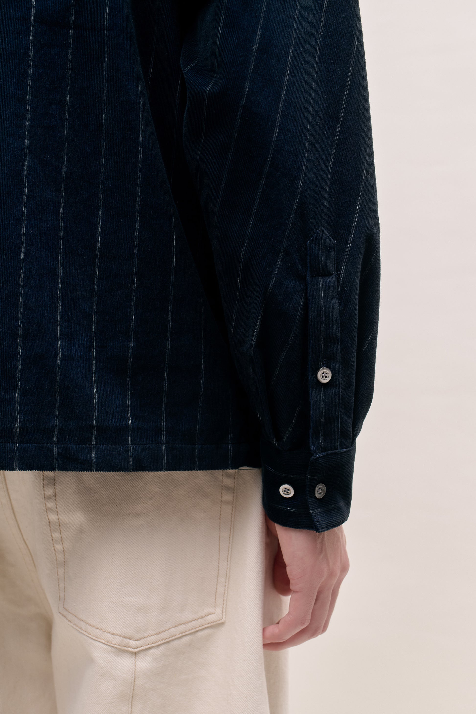 FABRIC: A fine baby corduroy fabric in deep navy with subtly faded white pinstripes. Soft to the touch with a velvety ribbed texture, offering a vintage-inspired look with refined detailing.