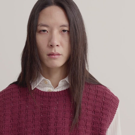 PRODUCT: The Tembe Knit Vest features a slightly boxy silhouette with dropped shoulders and an openwork knit pattern.