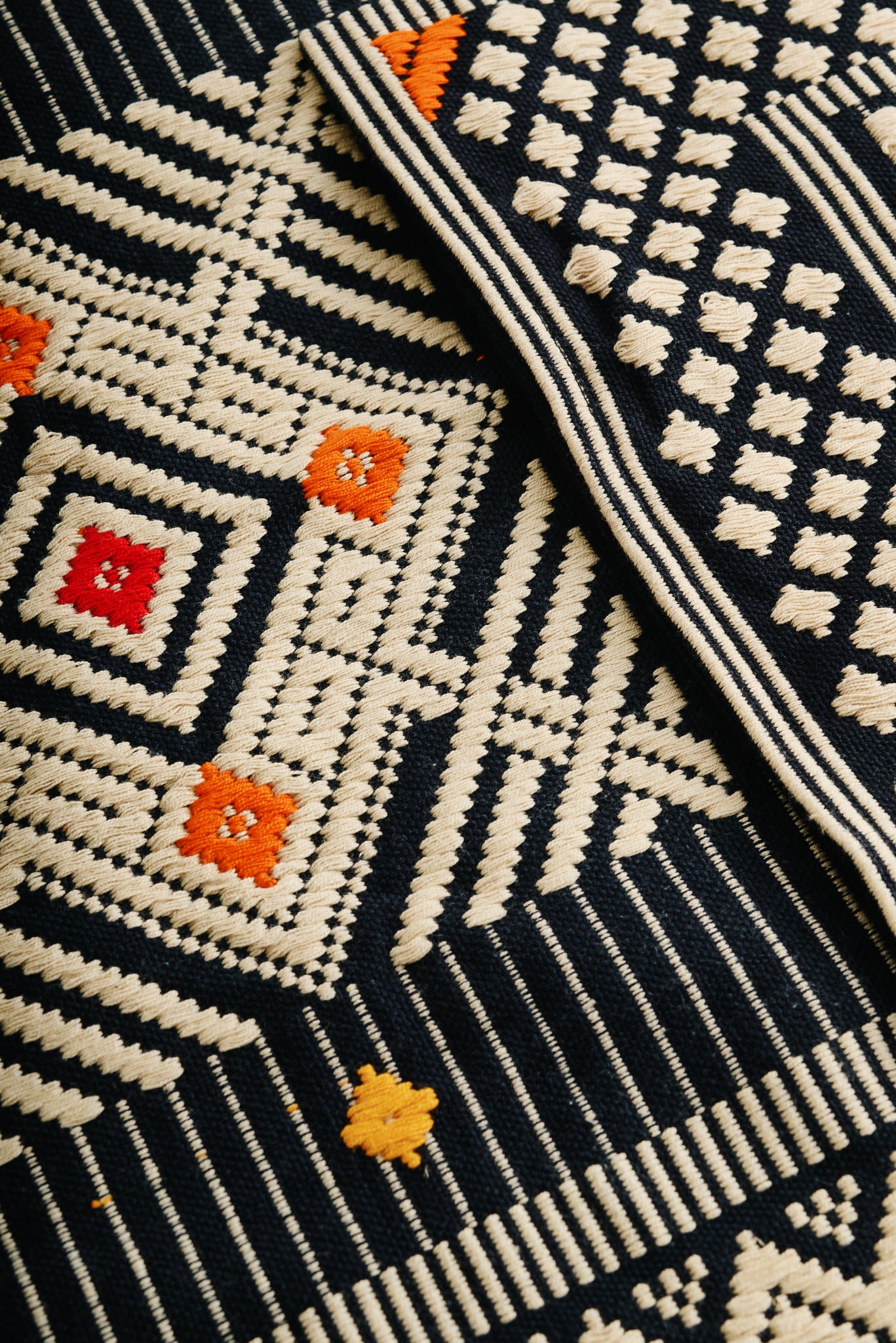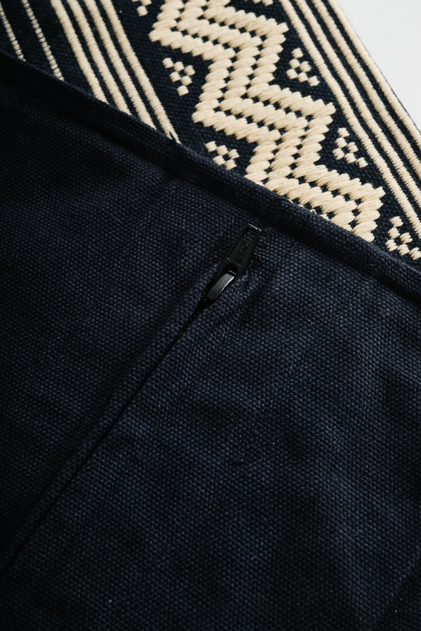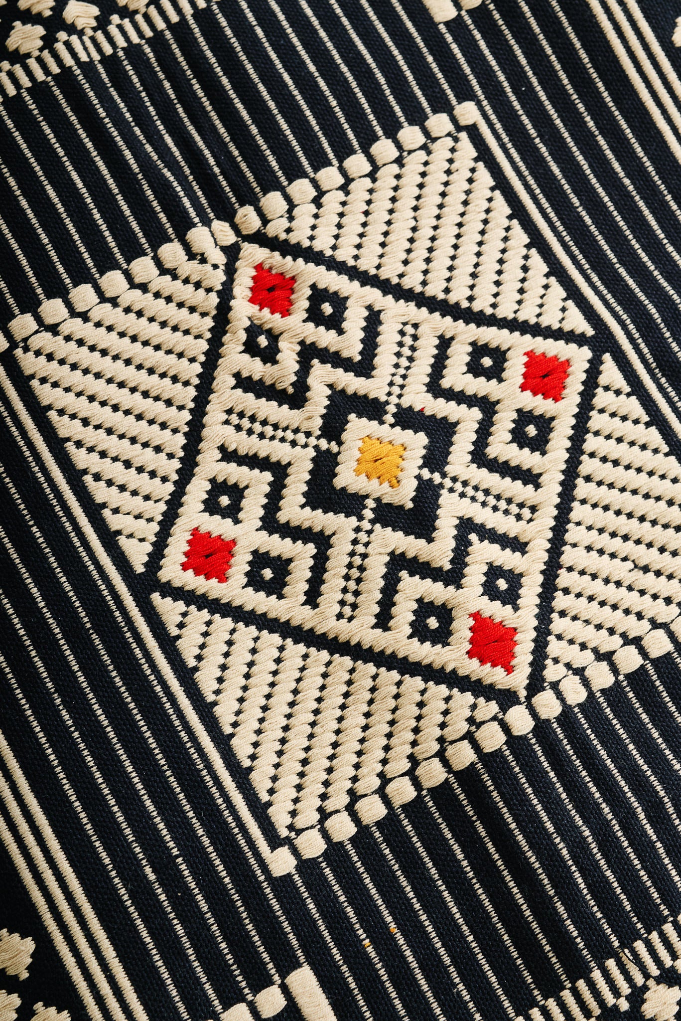 This handwoven cushion cover from Sri Lanka brings a bold graphic presence to any room. The front features intricate traditional motifs arranged in a geometric grid with accents of red, yellow and orange, while the back remains solid black for contrast. The sturdy woven texture and hidden zip closure ensure durability and ease of use. An artisanal piece that adds both cultural flair and comfort to your space.