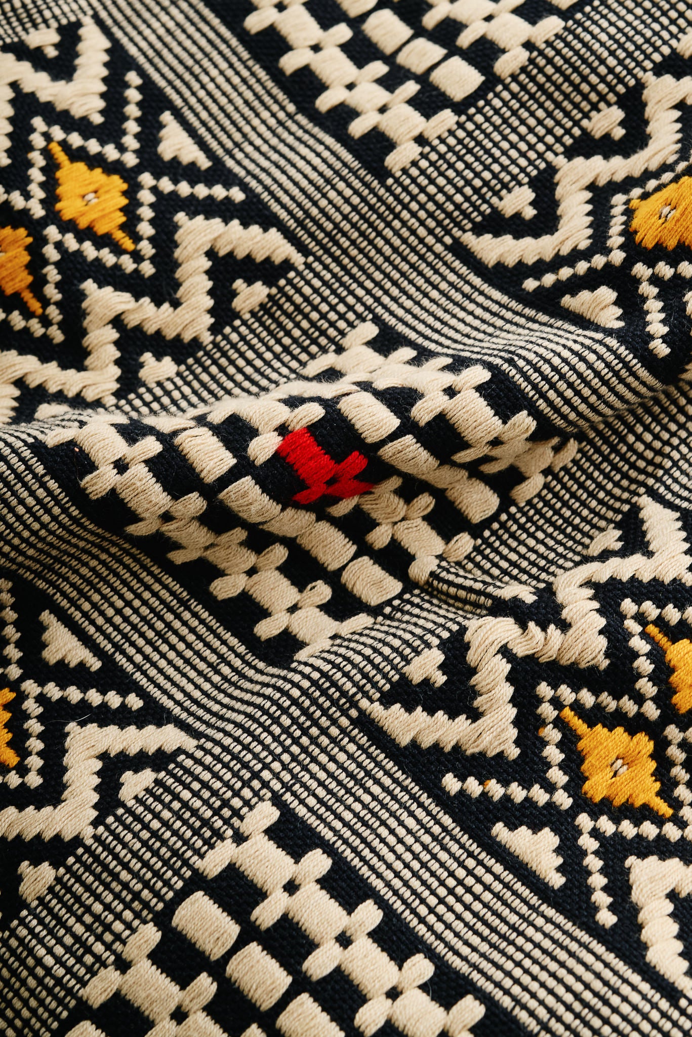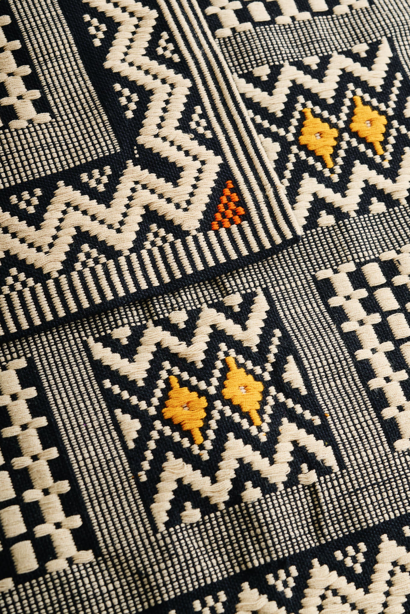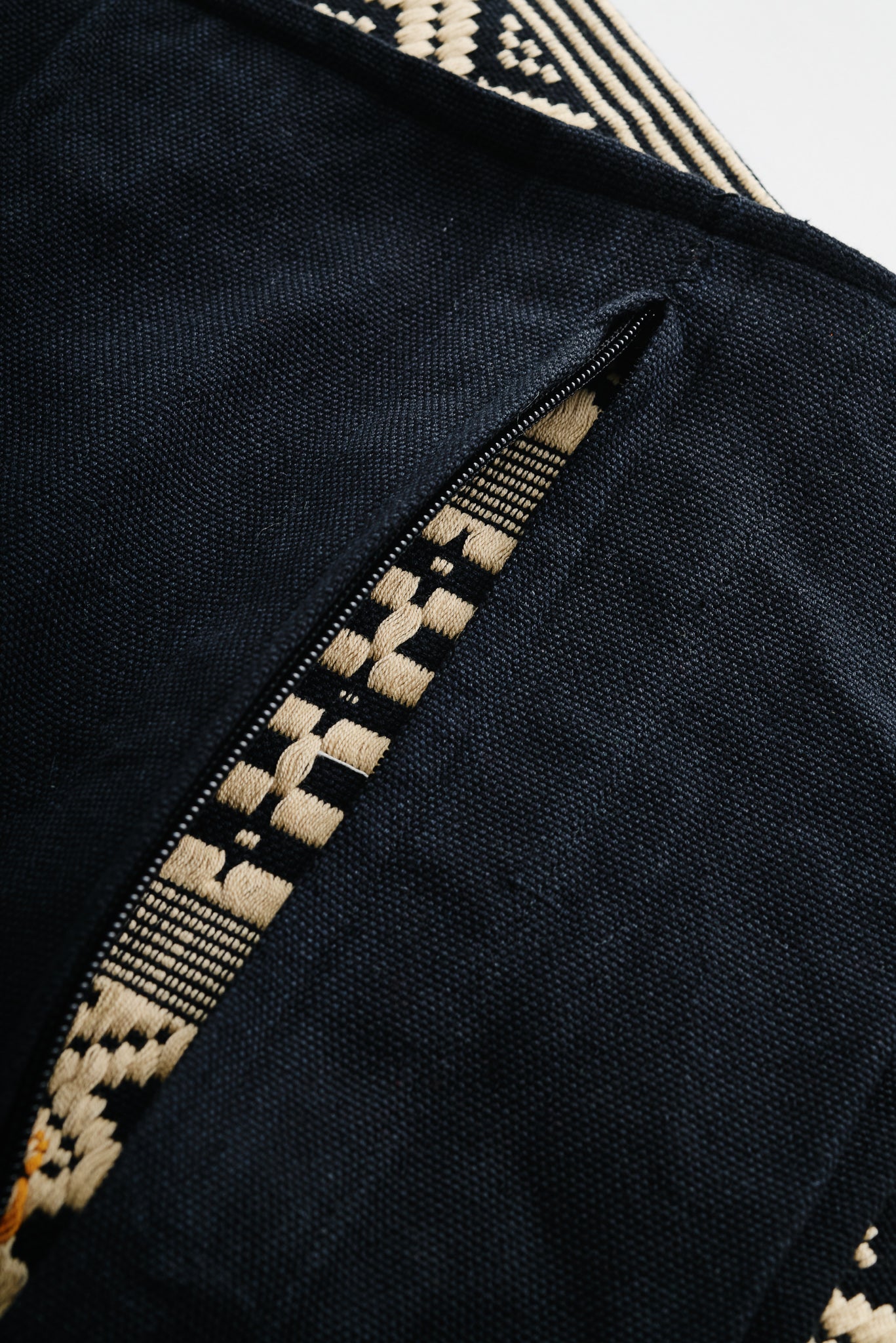 This handwoven cushion cover showcases a striking geometric pattern in contrasting cream and black, complemented by bold accents in red, orange and yellow. Each piece is unique, reflecting traditional craftsmanship and detailed embroidery techniques typical of Sri Lanka’s textile heritage. A sturdy zip on the back allows easy use, while the textured surface adds character to any setting.
