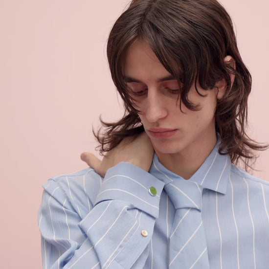 PRODUCT: The Tulio Tie in Cornflower Stripe is a lightweight necktie with a soft structure and embroidered surface. It features a relaxed cut and is designed to be worn with matching items such as the Gusto and Fidelio shirts. The subtle stripe pattern and crepe-like texture lend the piece a casual character, while its narrow silhouette maintains a tailored appearance.