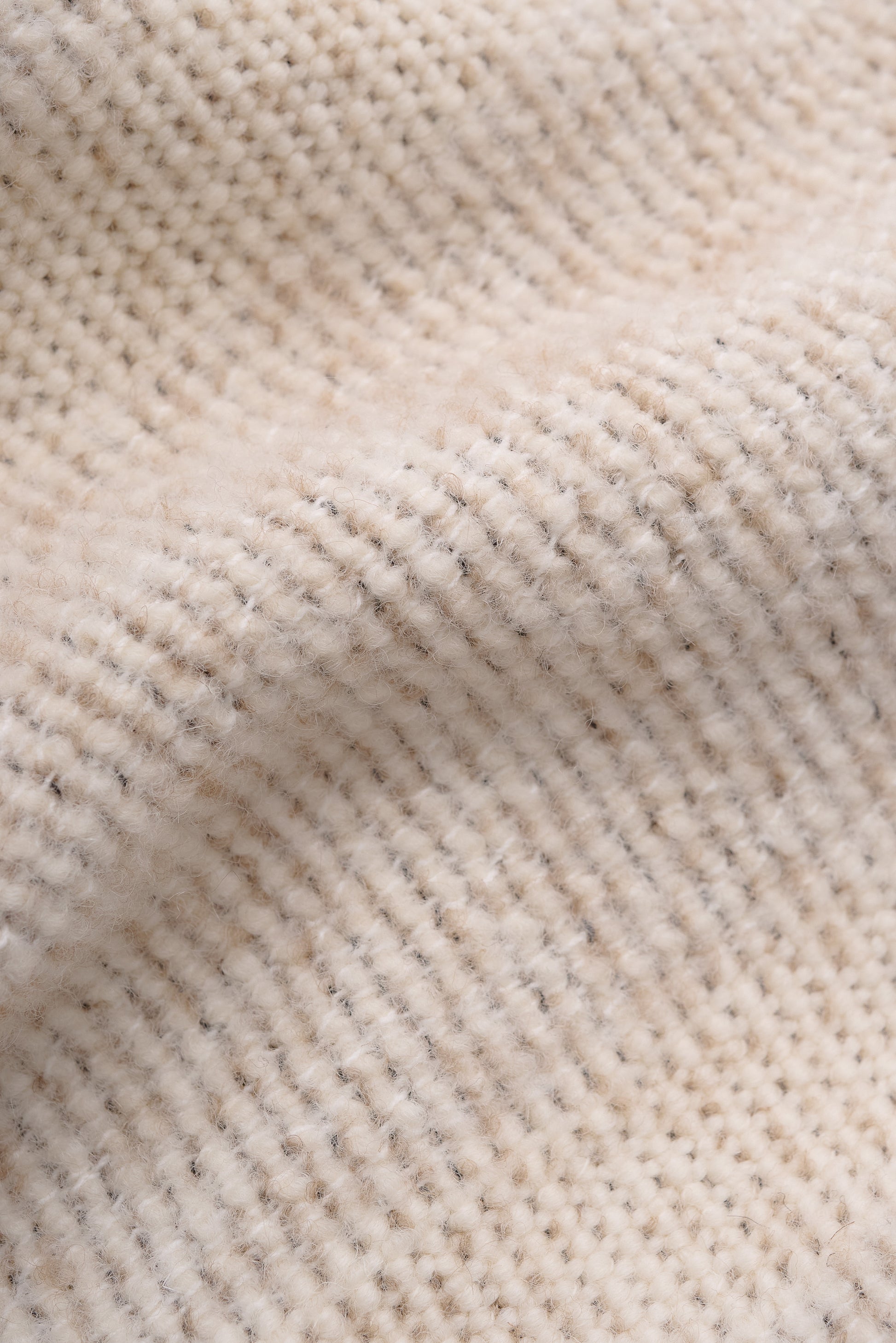 FABRIC: A thick virgin wool blend fabric featuring block stripes created by subtly contrasting yarns. The heavy structure and textured weave give it a warm, substantial feel with a visually rich surface.
