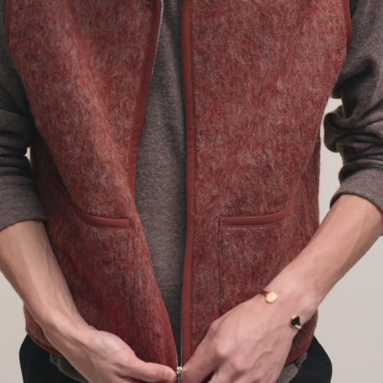 FABRIC: A virgin wool blend fabric with a hairy, brushed outer surface in a melange color. The texture adds visual depth and a soft, cozy feel.