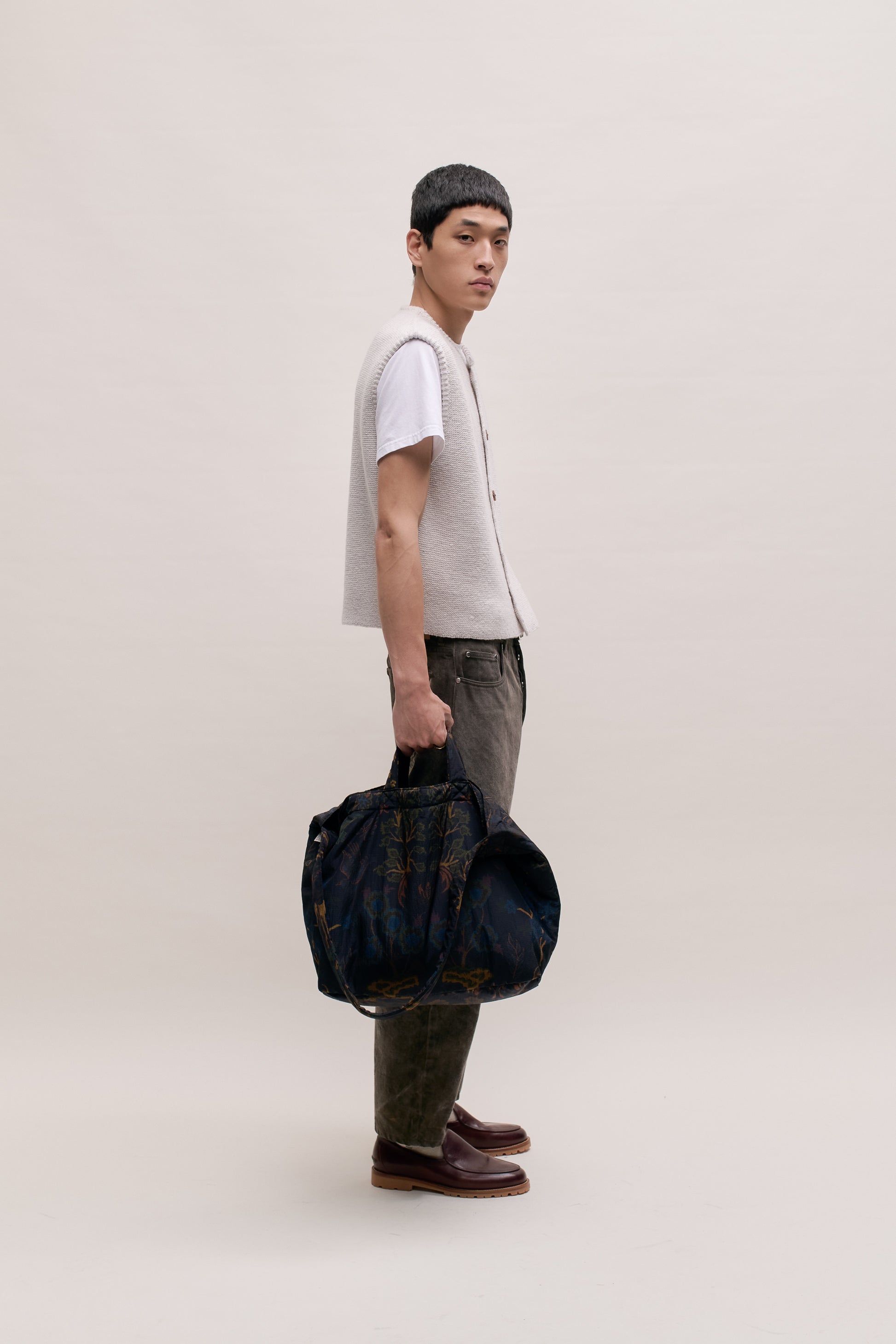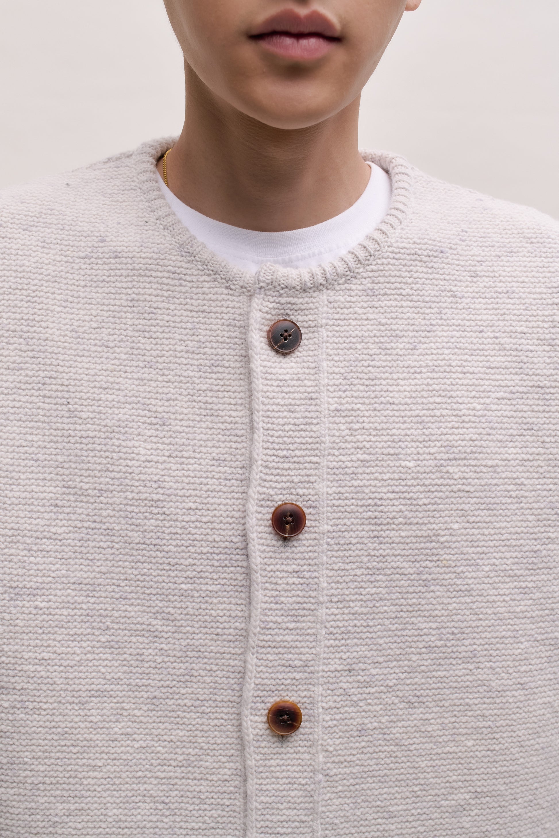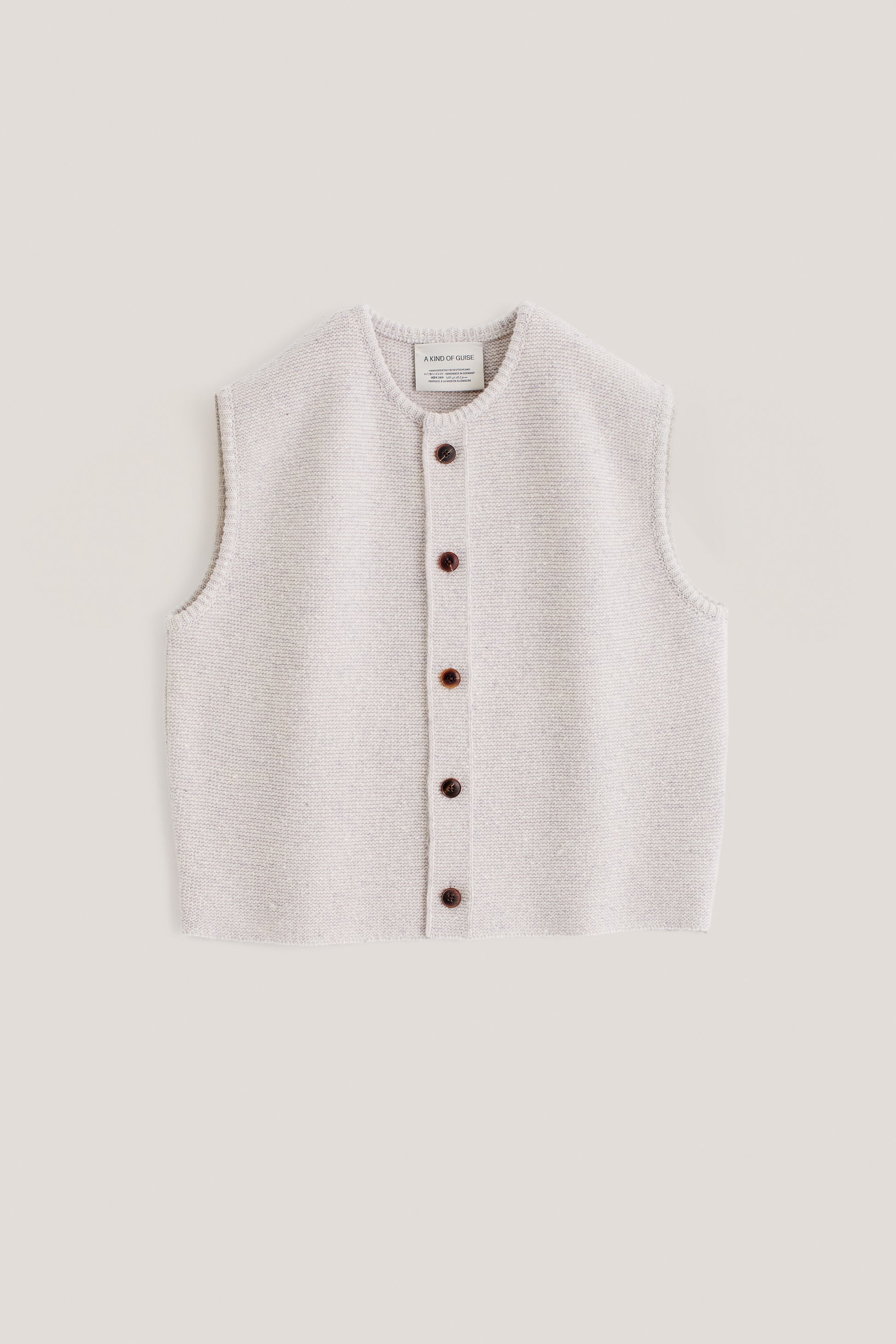 PRODUCT: Loose fitted knit vest, ribbed detail at neckhole and armhole. Front button closure.