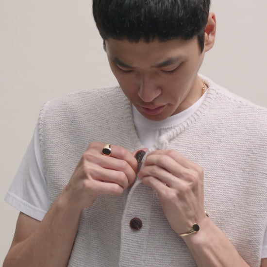 YARN: A virgin wool and cashmere blend yarn, soft to the touch with a subtle tweed effect. Spun in Italy for refined texture and quality.