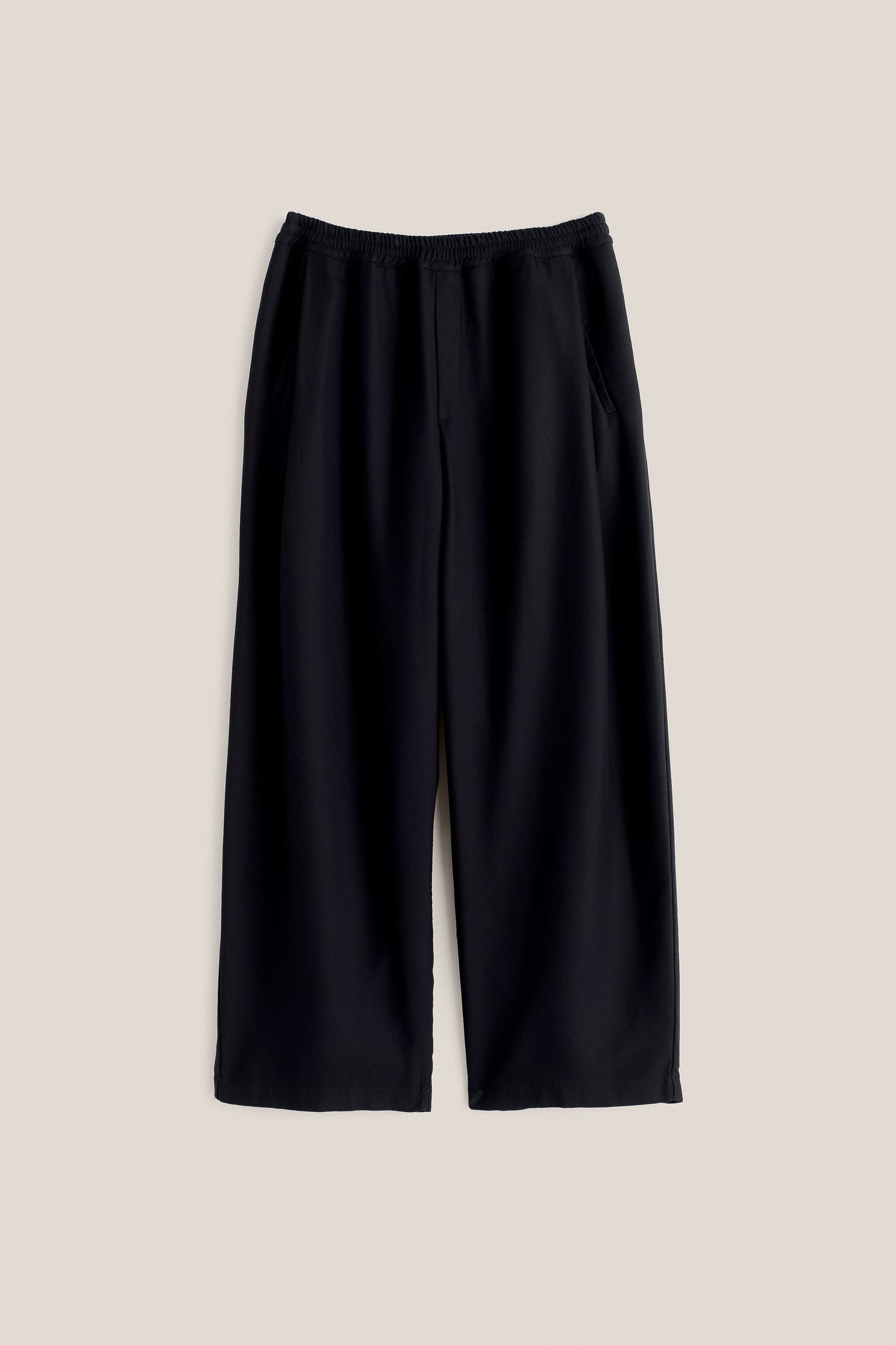 PRODUCT: The Wewa Wide Trousers feature an elastic waistband with a hidden drawstring, a wide leg, and a front pleat that conceals slanted welt pockets.