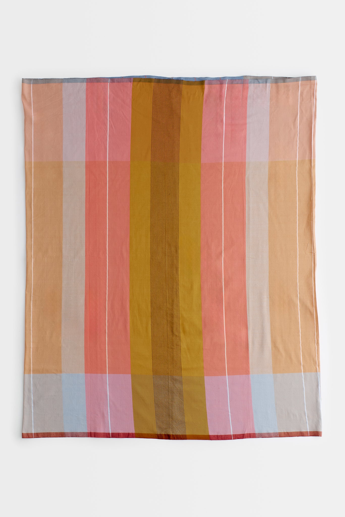 This handwoven cotton skirt captures the essence of summer with its warm, sun-faded tones and airy drape. The lightweight fabric features wide vertical stripes, punctuated by a panel of fine black lines for added contrast. Designed to be worn as a relaxed wrap-around piece, it offers both comfort and visual texture. Ideal for layering or as a beach cover-up.