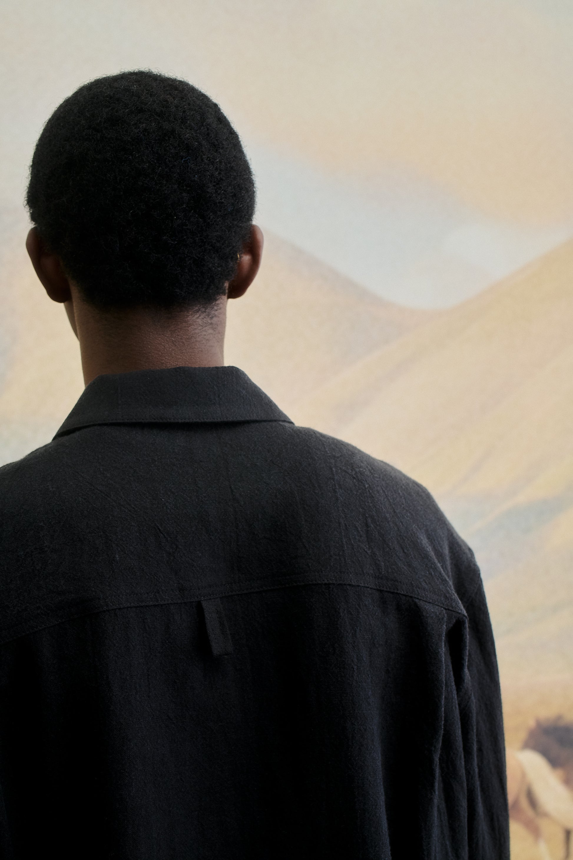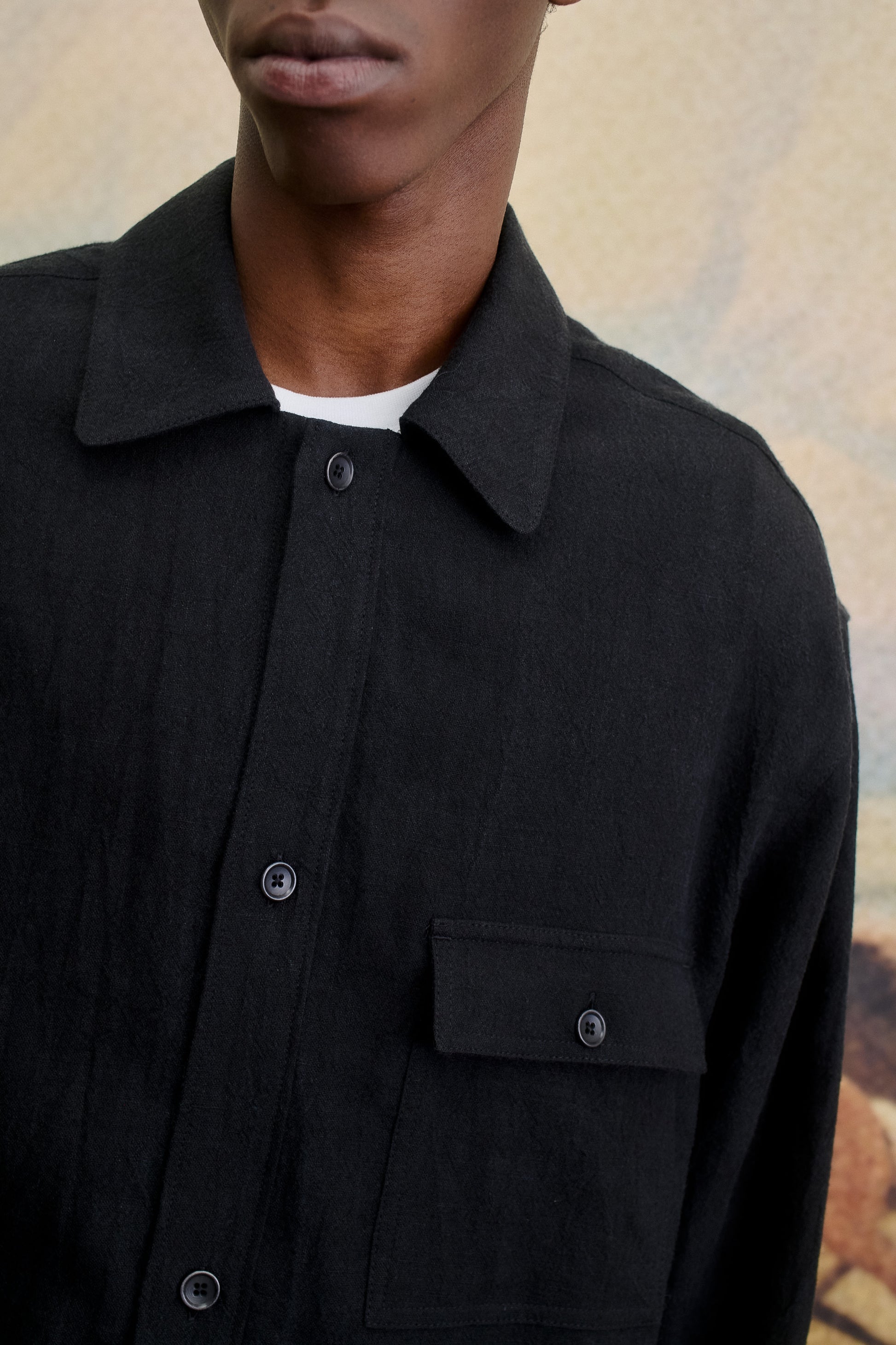 PRODUCT: The Yaruu Overshirt features a straight, relaxed fit with a flat collar, a broad button placket, two lower patched pockets and one chest pocket with a flap for a distinctly functional look.